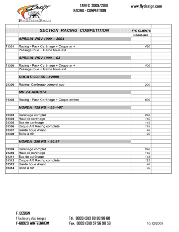 TARIFS 2009/2010 RACING - COMPETITION SECTION RACING COMPETITION www.flydesign.com TTC CLIENTS Conseillés APRILIA RSV 1000 -- 2004 71301 Racing - Pack Carénage + Coque ar + Passage roue + Garde boue avt 450 APRILIA RSV 1000 -- 03 71300 Racing - Pack Carénage + Coque ar + Passage roue + Garde boue avt 400 DUCATI 900 SS -->2000 21300 Racing- Carénage complet cup 200 MV F4 AGUSTA 71302 Racing - Pack Carénage + Coque arrière 600 HONDA 125 RS - 95-->97 31303 31304 31305 31306 31307 31308 Carénage complet Haut de carénage Bas de carénage Coque AR Racing complète Garde boue Avant Boite à Air 240 140 115 125 40 90 HONDA 250 RS - 96.97 31309 31310 31311 31312 31313 31314 Carénage complet Haut de carénage Bas de carénage Coque AR Racing complète Garde boue Avant Boite à Air F. DESIGN 1 Faubourg des Vosges F-68920 WINTZENHEIM 240 140 115 125 40 90 Tél. 0033 (0)3 89 80 98 60 Fax. 0033 (0)9 57 56 98 59 10/12/2009 TARIFS 2009/2010 RACING - COMPETITION www.flydesign.com HONDA CBR 600 - 95-->97 31301 Carénage Racing 2 parties 300 avec récupérateur d'huile (Règlement FIM) 31302 Coque Arrière Racing Mono 150 HONDA CBR 600 99 -- 00 31315 Racing-Pack Carénage + Coque Ar+pass.roue 335 HONDA CBR 600 RR - 05-06 31317 Pack Racing - Carénage + Coque Arrière 2 partie 525 Faux réservoir + Garde Boue Avt HONDA CBR 600 RR - 07 + 08 31320 Pack Racing - Carénage + Coque Arrière 2 partie 525 Faux réservoir + Garde Boue Avt HONDA CBR 1000 - 04-05 31318 Pack Racing - Carénage + Coque Arrière 2 partie 525 Faux réservoir + Garde Boue Avt HONDA CBR 1000 - 06-07 31319 Pack Racing - Carénage + Coque Arrière 2 partie 525 Faux réservoir + Garde Boue Avt HONDA CBR 1000 - 08-09 31322 Pack Racing - Carénage + Coque Arrière 2 par 525 Faux réservoir + Garde Boue Avt KAWASAKI ZXR 10 R - 08-09 41323 Racing -Pack Carénage cplt + coque Ar + 480 KAWASAKI ZXR 10 R - 04-05 41315 Racing -Pack Carénage cplt + coque Ar + F. DESIGN 1 Faubourg des Vosges F-68920 WINTZENHEIM Tél. 0033 (0)3 89 80 98 60 Fax. 0033 (0)9 57 56 98 59 460 10/12/2009 TARIFS 2009/2010 RACING - COMPETITION www.flydesign.com KAWASAKI ZXR 750 94-95 41301 41302 41303 41304 41305 Racing - Tête de fourche Racing - Bas de carénage ( récup.huile) Racing - Carénage complet Racing - Coque arrière Racing - Boite à air F. DESIGN 1 Faubourg des Vosges F-68920 WINTZENHEIM Tél. 0033 (0)3 89 80 98 60 Fax. 0033 (0)9 57 56 98 59 150 210 265 110 90 10/12/2009 TARIFS 2009/2010 RACING - COMPETITION www.flydesign.com KAWASAKI ZXR 7 - 97.98 41310 41311 41312 Racing - Carénage complet Racing - Coque arrière Racing - Pack Carénage + coque arrière 265 110 335 KAWASAKI ZXR 6 R - 03-04 41313 Racing -Pack Carénage cplt + coque Ar + Passage de roue + Garde Boue Avt 460 KAWASAKI ZXR 6 R - 05-06 41314 Racing -Pack Carénage cplt + coque Ar + Passage de roue + Garde Boue Avt 460 KAWASAKI ZXR 6 R - 07 + 08 41316 Racing -Pack Carénage cplt + coque Ar + Passage de roue + Garde Boue Avt 460 KAWASAKI ZXR 6 R - 0941324 Racing -Pack Carénage cplt + coque Ar + Passage de roue + Garde Boue Avt 460 KAWASAKI ER 6 - CUP 41317 41318 41319 41320 41321 ER6 CUP- Pack complet (Tête fourche-CoqueAR-Sabot-ecopes) ER6 CUP- Tête de fourche ER6 CUP- Coque Arrière mono ER6 CUP - Ecopes de radiateur - la Paire ER6 CUP - Sabot moteur 370 80 130 70 90 SUZUKI GSX R 750 R - 96-->98 / R600 R -96,97 (Srad) 51326 51305 51306 51307 51308 Racing-pack Carénage + Coque Ar+pass.roue Endurance - Haut de carénage Endurance - Bas de carénage (récup. Huile) Coque Ar. Racing complète + passage de roue Garde boue Avant 350 165 135 150 40 SUZUKI GSX R 600/750/1000 -- 2000-01 F. DESIGN 1 Faubourg des Vosges F-68920 WINTZENHEIM Tél. 0033 (0)3 89 80 98 60 Fax. 0033 (0)9 57 56 98 59 10/12/2009 TARIFS 2009/2010 RACING - COMPETITION 51313 51314 51315 Racing-pack Carénage + Coque Ar+pass.roue Racing-Carénage complet Racing-Coque arrière + passage de roue www.flydesign.com 445 305 150 SUZUKI GSX R 600/750 - 04-05 51317 Racing-pack Carénage + Coque Ar+pass.roue + Garde boue avant 460 SUZUKI GSX R 600/750 - 06-07 51319 Racing-pack Carénage + Coque Ar+pass.roue + Garde boue avant 460 SUZUKI GSX R 600/750 - 08-09 51327 Racing-pack Carénage + Coque Ar+pass.roue + Garde boue avant 500 SUZUKI GSX R 1000 - 03-04 51316 Racing - Pack Carénage + Coque ar + Passage roue + Garde boue avt 460 Coque Arrière : 3 modèles au choix 1-Selle origine -2- position hte fermé - 3- Position basse fermé SUZUKI GSX R 1000 - 05-06 51318 Racing-pack Carénage + Coque Ar+pass.roue + Garde boue avant 460 SUZUKI GSX R 1000 - 07 + 08 51325 Racing-pack Carénage + Coque Ar+pass.roue + Garde boue avant 480 SUZUKI GSX R 1000 - 0951328 Racing-pack Carénage + Coque Ar+pass.roue + Garde boue avant+ bulle 560 SUZUKI SV650 - CUP 51320 51321 51326 51322 51324 SV650 CUP- Pack complet (Tête fourche-CoqueAR-Sabot-GB Avt) SV650 CUP- Tête de fourche N SV650 CUP- Tête de fourche S SV650 CUP- Coque Arrière mono SV650 CUP - Garde boue avant F. DESIGN 1 Faubourg des Vosges F-68920 WINTZENHEIM Tél. 0033 (0)3 89 80 98 60 Fax. 0033 (0)9 57 56 98 59 335 75 100 130 40 10/12/2009 TARIFS 2009/2010 RACING - COMPETITION 51323 SV650 CUP - Sabot moteur www.flydesign.com 90 YAMAHA R 1 - 09 61318 Racing - Pack Carénage + coque arrière 480 YAMAHA R 1 - 07 + 08 61317 Racing - Pack Carénage + coque arrière 480 YAMAHA R 1 - 2004-05-06 61307 61308 61309 Racing - Carénage complet Racing - Coque arrière incl.passage roue p/pots Racing - Pack Carénage + coque arrière 350 280 480 YAMAHA R 1 - 98-99 61300 61301 61302 Racing - Carénage complet Racing - Coque arrière incl.support batterie Racing - Pack Carénage + coque arrière 275 120 335 YAMAHA R 6 - 99 -- 02 61303 61304 61305 Racing - Carénage complet Racing - Coque arrière incl passage roue Racing - Pack Carénage + coque arrière 275 120 335 YAMAHA R6 - 03-04 61306 Racing -Pack Carénage + coque arrière + Passage Roue + Garde boue avt 460 YAMAHA R6 - 05 61315 Racing -Pack Carénag