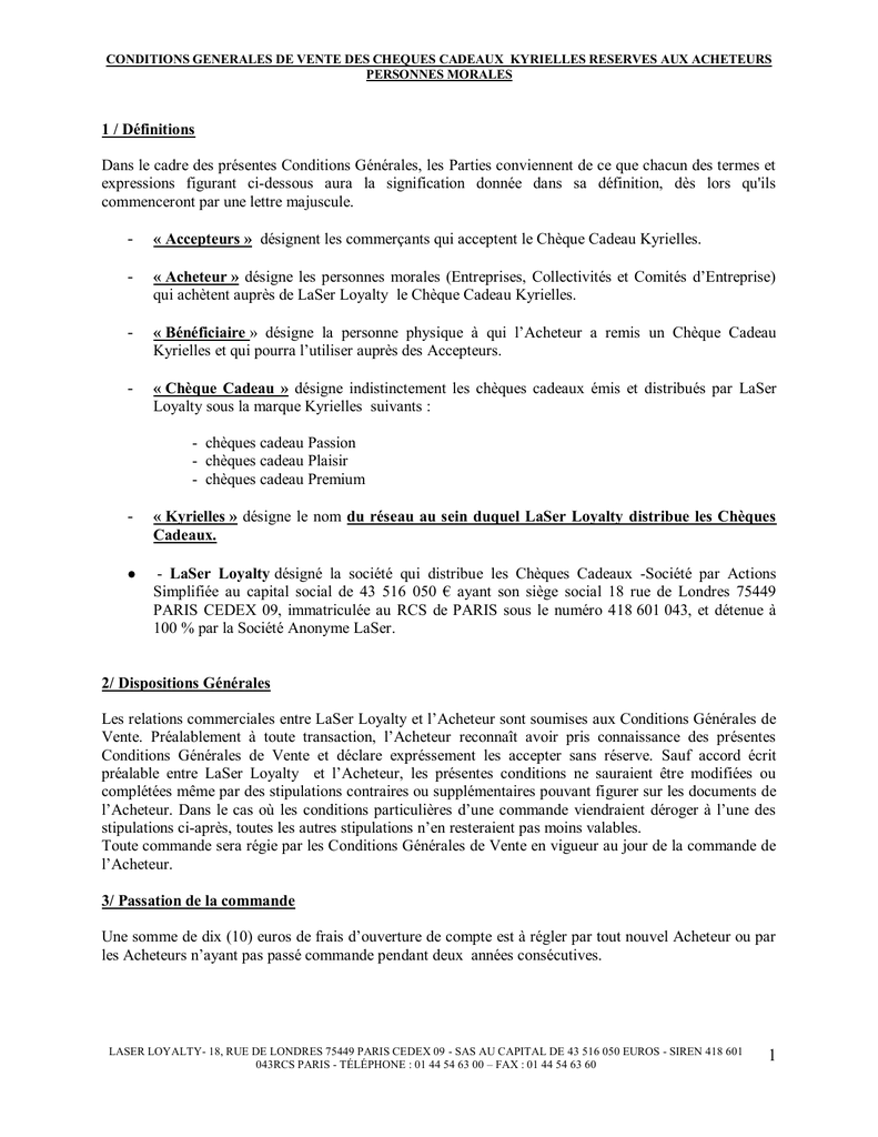 CONDITIONS GENERALES DE VENTE DES CHEQUES CADEAUX KYRIELLES RESERVES AUX ACHETEURS PERSONNES MORALES 1 / Définitions Dans le cadre des présentes Conditions Générales, les Parties conviennent de ce que chacun des termes et expressions figurant ci-dessous aura la signification donnée dans sa définition, dès lors qu'ils commenceront par une lettre majuscule. - « Accepteurs » désignent les commerçants qui acceptent le Chèque Cadeau Kyrielles. - « Acheteur » désigne les personnes morales (Entreprises, Collectivités et Comités d’Entreprise) qui achètent auprès de LaSer Loyalty le Chèque Cadeau Kyrielles. - « Bénéficiaire » désigne la personne physique à qui l’Acheteur a remis un Chèque Cadeau Kyrielles et qui pourra l’utiliser auprès des Accepteurs. - « Chèque Cadeau » désigne indistinctement les chèques cadeaux émis et distribués par LaSer Loyalty sous la marque Kyrielles suivants : - chèques cadeau Passion - chèques cadeau Plaisir - chèques cadeau Premium - « Kyrielles » désigne le nom du réseau au sein duquel LaSer Loyalty distribue les Chèques Cadeaux. - LaSer Loyalty désigné la société qui distribue les Chèques Cadeaux -Société par Actions Simplifiée au capital social de 43 516 050 € ayant son siège social 18 rue de Londres 75449 PARIS CEDEX 09, immatriculée au RCS de PARIS sous le numéro 418 601 043, et détenue à 100 % par la Société Anonyme LaSer. 2/ Dispositions Générales Les relations commerciales entre LaSer Loyalty et l’Acheteur sont soumises aux Conditions Générales de Vente. Préalablement à toute transaction, l’Acheteur reconnaît avoir pris connaissance des présentes Conditions Générales de Vente et déclare expréssement les accepter sans réserve. Sauf accord écrit préalable entre LaSer Loyalty et l’Acheteur, les présentes conditions ne sauraient être modifiées ou complétées même par des stipulations contraires ou supplémentaires pouvant figurer sur les documents de l’Acheteur. Dans le cas où les conditions particulières d’une commande viendraient déroger à l’une des stipulations ci-après, toutes les autres stipulations n’en resteraient pas moins valables. Toute commande sera régie par les Conditions Générales de Vente en vigueur au jour de la commande de l’Acheteur. 3/ Passation de la commande Une somme de dix (10) euros de frais d’ouverture de compte est à régler par tout nouvel Acheteur ou par les Acheteurs n’ayant pas passé commande pendant deux années consécutives. LASER LOYALTY- 18, RUE DE LONDRES 75449 PARIS CEDEX 09 - SAS AU CAPITAL DE 43 516 050 EUROS - SIREN 418 601 043RCS PARIS - TÉLÉPHONE : 01 44 54 63 00 – FAX : 01 44 54 63 60 1 CONDITIONS GENERALES DE VENTE DES CHEQUES CADEAUX KYRIELLES RESERVES AUX ACHETEURS PERSONNES MORALES Toute commande doit être passée par écrit (courrier ou fax) par l’Acheteur en utilisant le bon de commande figurant au verso du présent document ou sur le site internet www.kyrielles.fr, dont LaSer Loyalty déclare être propriétaire. L’Acheteur devra mentionner a minima sur le bon de commande l’ensemble des informations le concernant (adresse, identité et coordonnées de la personne représentant l’Acheteur, adresse de livraison et de facturation des Chèques Cadeaux), le type de Chèque Cadeau, la valeur unitaire du Chèque comprise entre 10 et 200 euros (par tranche de 1 euro), la quantité de Chèques par valeur, et le cas échéant le texte de personnalisation. Le bon de commande devra être envoyé par l’Acheteur par courrier à LaSer Loyalty, Service Prépayé, 18 rue de Londres 75449 PARIS CEDEX 09 ou par fax (numéro : 01.44.54.63.60), l’Acheteur s’engageant dans ce dernier cas à transmettre un exemplaire original de sa commande par courrier à LaSer Loyalty accompagné du règlement. Pour être valable, toute commande devra être précédée d’un virement ou accompagnée d’un chèque bancaire libellé à l’ordre de Laser Loyalty. Les prestations supplémentaires telles que la mise sous pli, pochettes cadeau, personnalisation spécifique… sont facturées en sus selon les dispositions du bon de commande. Un minimum de 300 euros de commande est nécessaire pour valider une commande auprès de LaSer Loyalty. 4 / Formation du contrat Le contrat est formé à compter de la réception du bon de commande par LaSer Loyalty dûment complété et signé par l’Acheteur, accompagné du règlement à l’ordre de LaSer Loyalty . LaSer Loyalty se réserve le droit de ne traiter la commande qu’après avoir vérifié la régularité du paiement. Sauf accord dérogatoire, toute commande de Chèques Cadeaux dûment complétée et signée par l’Acheteur ne sera traitée par LaSer Loyalty que si elle est accompagnée du règlement intégral de la commande. En cas de vente exclusivement à distance, l’Acheteur dispose d’un délai de sept jours francs à compter de la réception des Chèques Cadeaux pour exercer son droit de rétractation. En cas d’exercice de ce droit, l’Acheteur devra alors retourner les Chèques Cadeaux à ses frais à LaSer Loyalty, Service Prépayé, 18 rue de Londres 75449 PARIS CEDEX 09, qui le remboursera de la totalité des sommes versées au plus tard dans un délai de trente jours suivant la date à laquelle ce droit a été exercé. 5 / Livraison et transport L’envoi des Chèques Cadeaux est réalisé par courrier sécurisé. Le délai moyen par livraison est de 5 jours ouvrés après réception du bon de commande complet accompagné du règlement et le cas échéant, après vérification de la régularité du paiement. LaSer Loyalty s’efforce de respecter les délais prévus pour la livraison des Chèques Cadeaux. Toutefois, ceux-ci ne sont mentionnés qu’à titre purement indicatif. Le retard de livraison ne pourra jamais donner lieu à des dommages et intérêts et n’autorise pas l’Acheteur à refuser la livraison. LASER LOYALTY- 18, RUE DE LONDRES 754