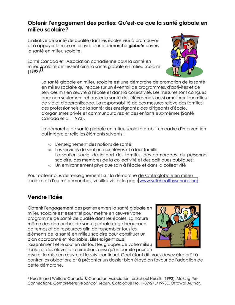 Obtenir l'engagement des parties: Qu'est-ce que la santé globale en milieu scolaire? L'initiative de santé de qualité dans les écoles vise à promouvoir et à appuyer la mise en œuvre d'une démarche globale envers la santé en milieu scolaire. Santé Canada et l'Association canadienne pour la santé en milieu scolaire définissent ainsi la santé globale en milieu scolaire (1993)1 : La santé globale en milieu scolaire est une démarche de promotion de la santé en milieu scolaire qui repose sur un éventail de programmes, d'activités et de services mis en œuvre à l'école et dans la collectivité. Les mesures sont conçues pour non seulement rehausser la santé des élèves mais aussi améliorer leur milieu de vie et d'apprentissage. La responsabilité de ces mesures relève des familles; des professionnels de la santé; des enseignants; des dirigeants d'école, d'organismes privés et communautaires; et des enfants eux-mêmes (Santé Canada et al., 1993). La démarche de santé globale en milieu scolaire établit un cadre d'intervention qui intègre et relie les éléments suivants : • • • L'enseignement des notions de santé; Les services de soutien aux élèves et à leur famille; Le soutien social de la part des familles, des camarades, du personnel scolaire, des membres de la collectivité et des politiques publiques; Un environnement physique sain à l'école et dans la collectivité Pour obtenir plus de renseignements sur la démarche de santé globale en milieu scolaire et d'autres démarches, veuillez visiter la page www.safehealthyschools.org. Vendre l'idée Obtenir l'engagement des parties envers la santé globale en milieu scolaire est essentiel pour mettre en œuvre votre programme de santé de qualité dans les écoles. La nature même des démarches de santé globale exige beaucoup de temps et de ressources afin de rassembler tous les éléments de la santé en milieu scolaire pour constituer un plan coordonné et réalisable. Elles exigent aussi l'assentiment et le soutien de tous les groupes de votre milieu scolaire, des élèves à la direction, ainsi qu'un comité pour en assurer la mise en œuvre et le suivi continuel. Ceci étant dit, vous devez être prêt à contrer les objections et à présenter un dossier bien étayé en faveur de l'adoption de cette démarche. 1 Health and Welfare Canada & Canadian Association for School Health (1993). Making the Connections: Comprehensive School Health. Catalogue No. H-39-275/1993E. Ottawa: Author. Faire le lien entre la santé et l'apprentissage L'Association canadienne pour la santé, l'éducation physique, le loisir et la danse croit que la santé et l'apprentissage sont interdépendants et que l'école est l'endroit de choix pour faire la promotion de la santé. ! L'école est le seul endroit, fréquenté par pratiquement tous les enfants, qui dispose de suffisamment d'influence pour assurer l'apprentissage des connaissances nécessaires à la prise de décisions saines. ! Les élèves en santé apprennent mieux parce qu'ils fréquentent l'école assidûment, ont une meilleure estime de soi, entretiennent de bonnes relations interpersonnelles et sont favorablement disposés à apprendre. ! Les élèves qui apprennent avec succès sont en meilleure santé parce qu'ils acquièrent les connaissances et les compétences nécessaires à leur développement physique, social et émotif, et la résistance nécessaire pour relever les défis de la vie. ! Les élèves qui adoptent des comportements sains au cours de leur enfance sont plus susceptibles de les conserver à l'âge adulte. La promotion d'un mode de vie sain dès l'enfance peut prévenir l'apparition de maladies à l'enfance et à l'âge adulte et donc rapporter des avantages économiques à court et à long terme. Pour obtenir plus de renseignements sur la littérature portant sur la relation entre la santé et l'apprentissage et l'efficacité de la démarche de santé globale en milieu scolaire, visitez la page des partenaires pour la santé. Les avantages d'un programme de santé globale en milieu scolaire Un bon programme de santé globale en milieu scolaire peut apporter les avantages suivants : ! Améliorer la santé des élèves et le milieu scolaire. ! Encourager les élèves à prendre la responsabilité de leur santé, à être fiers de leur école et à en adopter les politiques. ! Améliorer les relations entre les élèves et le personnel et faire de l'école un endroit plus sain et plus agréable où travailler et apprendre ! Partager la responsabilité de la santé et du bien-être des enfants et des adolescents avec les nombreux partenaires dont l'école, la collectivité et les enfants. ! Maximiser l'utilisation des ressources scolaires et communautaires grâce à la coordination des efforts. ! Recueillir des idées et élaborer des stratégies en quantité pour améliorer la santé en milieu scolaire en regroupant les efforts de l'ensemble du milieu scolaire. ! Améliorer la participation des élèves, du personnel et de l'ensemble de la collectivité à la vie scolaire. ! Encourager l'établissement de bonnes relations entre les milieux scolaire et communautaire afin de faciliter les initiatives scolaires et communautaires. ! Édifier un climat de respect mutuel. Quelle est l'efficacité des programmes de santé globale en milieu scolaire? Les exemples ci-dessous, tirés de travaux de recherche, illustrent l'efficacité de la démarche de santé globale en milieu scolaire ! Le Service de santé publique des États-Unis a étudié plus de 50 programmes scolaires d'éducation à la santé qui abordent les divers aspects de la santé physique, émotive et sociale. Les chercheurs ont constaté que ces programmes suscitaient des changements de mode de vie en plus d'améliorer l'assiduité scolaire, le taux de diplômation et les résultats scolaires aux examens normalisés2. ! Les travaux de Symons démontrent que dans les écoles qui adopte