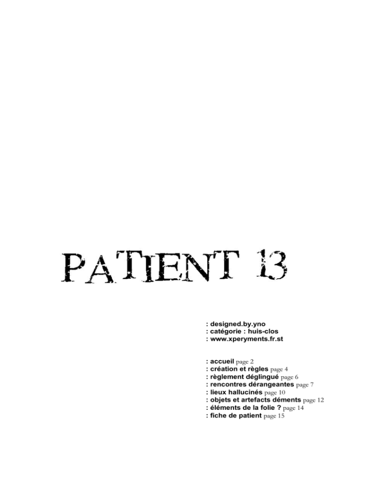 : designed.by.yno : catégorie : huis-clos : www.xperyments.fr.st : accueil page 2 : création et règles page 4 : règlement déglingué page 6 : rencontres dérangeantes page 7 : lieux hallucinés page 10 : objets et artefacts déments page 12 : éléments de la folie ? page 14 : fiche de patient page 15 PATIENT 13 : accueil « Qu'est ce qu'un jeu de rôles ? » Le jeu de rôles est un jeu de société. Jouer à un jeu de rôles (abréviation JdR) consiste à se retrouver avec des amis pour vivre des aventures imaginaires. Il existe plusieurs JdRs différents et chacun propose des règles et un univers personnel. Chaque joueur a une feuille de papier où est inscrit différents détails d'un personnage fictif. Le joueur, à la manière d'un acteur (sans la prétention), va s'amuser à incarner ce personnage (qu’il a lui-même inventé) en racontant ce qu'il souhaite que son personnage accomplisse. Les joueurs créent leur personnage avec l'aide de points. Ces points permettent de chiffrer les bons et mauvais côtés du personnage, ses qualités et ses défauts. Ils permettent de dresser une sorte de portrait robot : fort - baraqué - intelligent - beau. Un des joueurs endosse un rôle particulier : celui de meneur du jeu (abréviation Mj). Le meneur a plus de responsabilités que les joueurs « normaux ». C'est lui qui raconte l'aventure aux joueurs (aussi appelés Pjs pour Personnages-joueurs) et qui décide si les actions des Pjs ont réussis ou pas (suivant les qualités et défauts des personnages, selon le résultat de jets de dés et selon son jugement). Il est le conteur de l’histoire et l'arbitre veillant au bon fonctionnement de la partie. Deux choix s'offrent au meneur, soit il fait vivre une aventure qu'il a inventée, soit il se procure des scénarios déjà écrits par d'autres (histoires que les joueurs ne doivent bien sur pas connaître avant de jouer). Le meneur doit connaître le synopsis de l'histoire qu'il va faire vivre à ses amis et avoir quelques idées en ce qui concerne le déroulement de l'intrigue. Pour un meneur qui écrit lui-même son scénario, à l'opposé des joueurs, il faut de l'imagination. De plus, il va endosser le rôle des différents protagonistes que vont rencontrer les personnages (il les joue comme un acteur qui interpréterait plusieurs rôles dans une même pièce de théâtre). Ce type de personnages, joués par le meneur, est appelé : personnages non-joueurs (abréviation Pnjs). Deux détails méritent d’être précisé : Premièrement, il n'y a ni gagnants, ni perdants. Les joueurs autour de la table ne cherchent pas à « gagner » par rapport aux autres, ils oeuvrent dans un but commun pour « résoudre » l'histoire que le meneur leur propose. Tout le monde est allié dans un but commun. Deuxièmement, contrairement à une croyance répandue, les « univers » de jeux de rôles ne sont pas tous « médiévaux fantastiques » (à base de lutins, elfes, trolls et dragons). Il en existe de tout type et de toute sorte : pour les enfants, pour les adolescents, pour les adultes, avec des univers de super héros (à la « Xmen »), à base de fantastique (à la « X-files ») ou de science-fiction (à la « Alien »), etc. Remarque à propos de ce jeu Patient 13 est un court jeu de rôles qui se veut un peu en marge de ce profil généraliste présenté. Patient 13 est prévu pour être joué en duo, un meneur et un seul joueur, et cela pour des séances plus courtes qu’à l’habitude. Ce jeu ci n’est donc pas recommandé aux personnes qui souhaiteraient ce faire une idée juste et véritable du loisir collectif qu’est le jeu de rôles. De plus ce jeu propose un contexte qui n’est pas forcément joyeux et enfantin. Il n’est donc pas non plus à classer « tout public ». Matériel Pour jouer à ce jeu, vous aurez besoin de vous procurer au minimum un dé (que l'on trouve dans tous bons jeux de société). Quelques crayons, une gomme et du papier seront aussi nécessaires. La durée du jeu, relativement courte en comparaison des autres JdRs, ne doit pas s’étendre au-delà de deux ou trois heures. Déroulement du jeu La plupart du temps, le meneur s'exprime un peu à la manière d’un roman (en étant tout de même plus léger sur la description), décrivant ce que le personnage voit et pouvant changer de voix quand le personnage s'adresse à un Pnj. Le joueur quand a lui peut se contenter de dire « je vais là-bas, je lui demande si… » mais le meneur peut décider avec son accord de jouer plus son rôle, de faire plus de « role play ». C'est à dire que le joueur au lieu de s’exprimer par « je lui demande si… » dira par exemple « Bonjour monsieur, j'aimerais savoir si… » de la même manière que le fait le meneur pour ses Pnjs. Pour le bon déroulement du jeu, il y a une règle qu'il faut respecter. Toutes les paroles émises au cours du jeu par le joueur sont prononcées par son personnage dans l'histoire, à l'exception des demandes directement adressées au meneur. Décrire à l’aide des cinq sens Le meneur doit utiliser ses cinq sens pour décrire l'environnement qui entoure le personnage. Il doit tenter de faire ressentir au joueur l’ambiance de l’histoire, en lui donnant le ton, il doit le guider, l’aiguiller pour qu’il sache dans quel lieu et situation son personnage se trouve. | 2 | PATIENT 13 Il peut décrire les pièces, les plafonds, la pluie, la nuit, l’air avec des couleurs : un marron teinté de vert, un bleu très sale, un gris très sombre. Il peut aussi lui indiquer les sons qu’entend le personnage, un martèlement brusque contre une tuyauterie, le son d’une goutte de pluie qui tombe du plafond pour s’écraser au sol. La description peut aussi passer par l’odorat et le goût, en racontant quelle odeur nauséabonde émane de cette vieille chambre où l’on ne voie rien, que ce goût de rouille dans la bouche est abominable, que ces toilettes sentent l’oiseau mort et