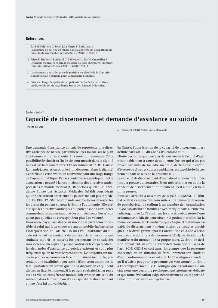 Focus_Suicide assistance / Suizidbeihilfe / Assistance au suicide Réferences 1. Zaré M, Palmiere C, Sobel J, La Harpe R, Burkhardt S L’assistance au suicide en Suisse dans le contexte de polypathologie invalidante irreversible Rev Méd Suisse 2007; 3: 2303–5 2Faisst K, Fischer S, Bosshard G, Zellweger U, Bär W, Gutzwiller F Décisions médicales en fin de vie dans six pays européens: Premiers résultats Bull Méd Suisses 2003; 84 (34): 1730 –2 3. L’assistance au suicide: prise de position no 9/2005 de la Commission nationale d’éthique pour la médecine humaine. 4. Prise en charge des patientes et patients en fin de vie: directives médico-éthiques de l’Académie Suisse des Sciences Médicales. Jérôme Sobela Capacité de discernement et demande d’assistance au suicide _Point de vue a Président d’EXIT ADMD Suisse Romande Une demande d’assistance au suicide représente une directive anticipée de nature particulière, très lourde sur le plan émotionnel et qui va aboutir à la mort du requérant. Cette possibilité de choisir sa fin de vie pour mourir dans la dignité ne s’est pas faite sans efforts et l’association EXIT ADMD Suisse Romande (association pour le droit de mourir dans la dignité) a contribué à cette évolution bienvenue pour une large frange de l’opinion publique. Par ses controverses juridiques, notre association a poussé à la reconnaissance des directives anticipées dans le monde médical (1). Rappelons qu’en 1981 l’Académie Suisse des Sciences Médicales (ASSM) considérait qu’une déclaration antérieure du patient ne liait pas le médecin. En 1999, l’ASSM recommande aux médecins de respecter les droits du patient surtout le droit à l’autonomie. Elle précise que les directives anticipées du patient sont à considérer comme déterminantes tant que des données concrètes n’indiquent pas qu’elles ne correspondent plus à sa volonté. Dans notre pays, l’assistance au suicide est parfaitement possible si celui qui la pratique n’a aucun mobile égoïste selon l’interprétation de l’article 115 du CPS. L’assistance au suicide est le fait de mettre à disposition de la personne qui souhaite mourir les moyens lui permettant de se suicider sans violence. Bien qu’elle puisse contrarier le corps médical, les demandes d’assistance au suicide existent et sont plus fréquentes qu’on ne veut le reconnaître. De nos jours, un médecin pourra se trouver en face d’un patient incurable, présentant une invalidité importante définitive ou un pronostic fatal, parfaitement serein quant à sa disparition et qui peut désirer en fixer le moment. Si le patient souhaite lâcher prise avec sa vie, sa compétence morale doit primer sur celle du médecin dans la mesure où il a sa capacité de discernement et que c’est lui qui va décéder. Bioethica Forum / 2009 / Volume 2 / No. 1 En Suisse, l’appréciation de la capacité de discernement est définie par l’art. 16 du Code Civil comme suit: «Toute personne qui n’est pas dépourvue de la faculté d’agir raisonnablement à cause de son jeune âge, ou qui n’est pas privée par suite de maladie mentale, de faiblesse d’esprit, d’ivresse ou d’autres causes semblables, est capable de discernement dans le sens de la présente loi.» La capacité de discernement d’un patient est donc présumée jusqu’à preuve du contraire. Si un médecin met en doute la capacité de discernement d’un patient, c’est à lui d’en fournir la preuve. Dans son arrêt du 3 novembre 2006 (ATF 133/58SS), le Tribunal Fédéral va même plus loin suite à une demande de remise de pentobarbital de sodium à un membre de l’organisation DIGNITAS atteint de troubles psychiatriques sans aucune maladie organique. Le TF confirme le caractère obligatoire d’une ordonnance médicale pour obtenir la potion mortelle. Par la même occasion, le TF confirme que chaque être humain capable de discernement – même atteint de troubles psychiques – a le droit, garantit par la Constitution et la Convention Européenne des droits de l’homme (CEDH), de décider de la manière et du moment de sa propre mort. Ce droit de décision appartient au droit à l’autodétermination au sens de l’art. 8CH1.CEDH et ceci aussi longtemps que la personne concernée est en situation de faire librement son choix et d’agir conformément à sa volonté. Le TF souligne cependant qu’il n’existe pas pour la personne qui veut mourir un droit à l’accompagnement. Le TF souligne que l’assistance au suicide pour une personne psychiquement atteinte est délicate et que toute évaluation exige nécessairement un rapport détaillé d’un spécialiste en psychiatrie. 29 Focus_Suicide assistance / Suizidbeihilfe / Assistance au suicide Cet arrêt du TF est une clarification bienvenue et implique par conséquent qu’un malade atteint de pathologie organique et qui n’a jamais présenté de pathologie psychiatrique dans ses antécédents ne doit pas être suspecté automatiquement d’avoir une perte de discernement du seul fait de demander l’assistance au suicide. Un professionnel de la santé doit recevoir l’information et les moyens lui permettant d’être à même d’évaluer la capacité de discernement d’un patient. Cette évaluation se doit d’être neutre, objective et reproductible par des examinateurs différents, sans a priori pour la demande sous-jacente à l’évaluation. Le résultat de l’examen doit mettre en évidence la capacité de discernement de celui qui est investigué et non pas l’opinion subjective de l’examinateur. Lors d’une demande d’arrêt de traitement ou de refus d’entreprendre un traitement médical qui pourrait se solder par la mort du patient, le CHUV a mis en place une procédure d’aide pour apprécier la capacité de discernement des patients à l’usage des médecins (2). L’investigation est basée sur les travaux de Silberfeld quant à la cap