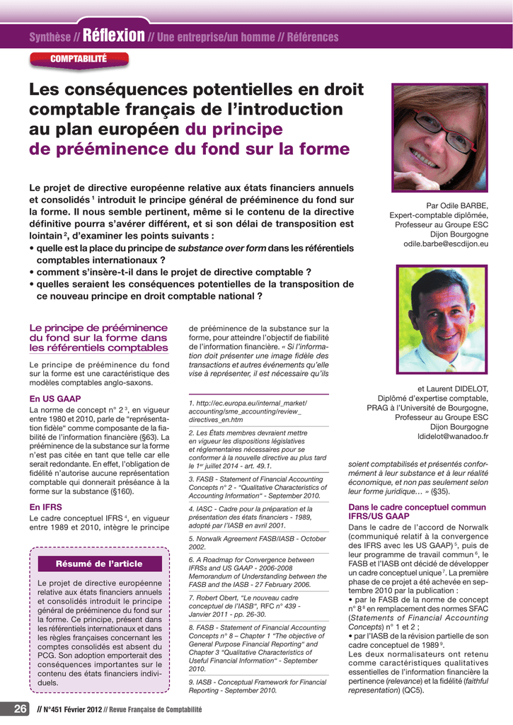Synthèse // Réflexion // Une entreprise/un homme // Références COMPTABILITÉ Les conséquences potentielles en droit comptable français de l’introduction au plan européen du principe de prééminence du fond sur la forme Le projet de directive européenne relative aux états financiers annuels et consolidés 1 introduit le principe général de prééminence du fond sur la forme. Il nous semble pertinent, même si le contenu de la directive définitive pourra s’avérer différent, et si son délai de transposition est lointain 2, d’examiner les points suivants : • quelle est la place du principe de substance over form dans les référentiels comptables internationaux ? • comment s’insère-t-il dans le projet de directive comptable ? • quelles seraient les conséquences potentielles de la transposition de ce nouveau principe en droit comptable national ? Le principe de prééminence du fond sur la forme dans les référentiels comptables Le principe de prééminence du fond sur la forme est une caractéristique des modèles comptables anglo-saxons. En US GAAP La norme de concept n° 2 3, en vigueur entre 1980 et 2010, parle de “représentation fidèle“ comme composante de la fiabilité de l’information financière (§63). La prééminence de la substance sur la forme n’est pas citée en tant que telle car elle serait redondante. En effet, l’obligation de fidélité n’autorise aucune représentation comptable qui donnerait préséance à la forme sur la substance (§160). En IFRS Le cadre conceptuel IFRS 4, en vigueur entre 1989 et 2010, intègre le principe de prééminence de la substance sur la forme, pour atteindre l’objectif de fiabilité de l’information financière. « Si l’information doit présenter une image fidèle des transactions et autres événements qu’elle vise à représenter, il est nécessaire qu’ils 1. http://ec.europa.eu/internal_market/ accounting/sme_accounting/review_ directives_en.htm 2. Les États membres devraient mettre en vigueur les dispositions législatives et réglementaires nécessaires pour se conformer à la nouvelle directive au plus tard le 1er juillet 2014 - art. 49.1. 3. FASB - Statement of Financial Accounting Concepts n° 2 - “Qualitative Characteristics of Accounting Information“ - September 2010. 4. IASC - Cadre pour la préparation et la présentation des états financiers - 1989, adopté par l’IASB en avril 2001. 5. Norwalk Agreement FASB/IASB - October 2002. Résumé de l’article Le projet de directive européenne relative aux états financiers annuels et consolidés introduit le principe général de prééminence du fond sur la forme. Ce principe, présent dans les référentiels internationaux et dans les règles françaises concernant les comptes consolidés est absent du PCG. Son adoption emporterait des conséquences importantes sur le contenu des états financiers individuels. 26 Par Odile BARBE, Expert-comptable diplômée, Professeur au Groupe ESC Dijon Bourgogne [email protected] 6. A Roadmap for Convergence between IFRSs and US GAAP - 2006-2008 Memorandum of Understanding between the FASB and the IASB - 27 February 2006. 7. Robert Obert, “Le nouveau cadre conceptuel de l’IASB“, RFC n° 439 Janvier 2011 - pp. 26-30. 8. FASB - Statement of Financial Accounting Concepts n° 8 – Chapter 1 “The objective of General Purpose Financial Reporting“ and Chapter 3 “Qualitative Characteristics of Useful Financial Information“ - September 2010. 9. IASB - Conceptual Framework for Financial Reporting - September 2010. // N°451 Février 2012 // Revue Française de Comptabilité et Laurent DIDELOT, Diplômé d’expertise comptable, PRAG à l’Université de Bourgogne, Professeur au Groupe ESC Dijon Bourgogne [email protected] soient comptabilisés et présentés conformément à leur substance et à leur réalité économique, et non pas seulement selon leur forme juridique… » (§35). Dans le cadre conceptuel commun IFRS/US GAAP Dans le cadre de l’accord de Norwalk (communiqué relatif à la convergence des IFRS avec les US GAAP) 5, puis de leur programme de travail commun 6, le FASB et l’IASB ont décidé de développer un cadre conceptuel unique 7. La première phase de ce projet a été achevée en septembre 2010 par la publication : • par le FASB de la norme de concept n° 8 8 en remplacement des normes SFAC (Statements of Financial Accounting Concepts) n° 1 et 2 ; • par l’IASB de la révision partielle de son cadre conceptuel de 1989 9. Les deux normalisateurs ont retenu comme caractéristiques qualitatives essentielles de l’information financière la pertinence (relevance) et la fidélité (faithful representation) (QC5). COMPTABILITÉ Le principe de substance over form n’est pas mentionné explicitement car il est considéré comme redondant. La fidélité signifie que les rapports financiers communiquent la substance d’un phénomène économique plutôt que sa seule forme juridique. La représentation d’une forme juridique qui serait différente de la substance du phénomène économique sous-jacent ne saurait aboutir à une représentation fidèle (BC3. 26). Selon les normalisateurs internationaux, la prééminence du fond sur la forme est une conséquence directe de l’objectif d’image fidèle. Exemples n Une entité signe avec un bailleur un contrat de location d’une machine moyennant le paiement de loyers sur une durée correspondant à la durée d’utilisation de l’actif. En substance, cela équivaut à recourir à un emprunt pour financer l’acquisition de ladite machine, dans la mesure où l’entité contrôle l’utilisation de la machine et a une obligation de payer des loyers. Au plan de la forme, l’entreprise ne possède pas la machine et n’a pas d’emprunt à rembourser. En substance, l’entreprise a un actif et une dette financière. n Une entité vend une machine à un organisme de financement et signe immédiatement un co
