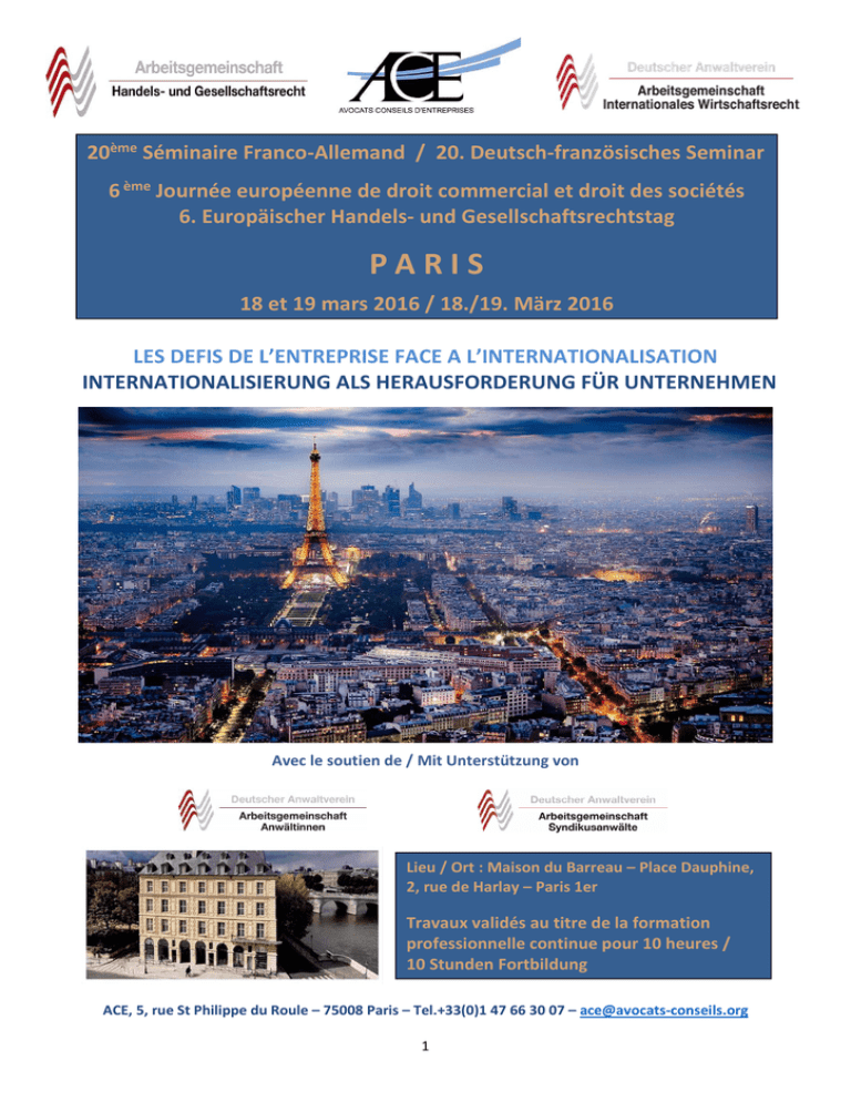 20ème Séminaire Franco-Allemand / 20. Deutsch-französisches Seminar 6 ème Journée européenne de droit commercial et droit des sociétés 6. Europäischer Handels- und Gesellschaftsrechtstag PARIS 18 et 19 mars 2016 / 18./19. März 2016 LES DEFIS DE L’ENTREPRISE FACE A L’INTERNATIONALISATION INTERNATIONALISIERUNG ALS HERAUSFORDERUNG FÜR UNTERNEHMEN Avec le soutien de / Mit Unterstützung von Lieu / Ort : Maison du Barreau – Place Dauphine, 2, rue de Harlay – Paris 1er Travaux validés au titre de la formation professionnelle continue pour 10 heures / 10 Stunden Fortbildung ACE, 5, rue St Philippe du Roule – 75008 Paris – Tel.+33(0)1 47 66 30 07 – [email protected] 1 Im März 2016 findet zum 20. Mal das deutschfranzösische Seminar der ARGE Internationales Wirtschaftsrecht des DAV und der ACE statt. Als Tagungsort für diese Jubiläumsveranstaltung haben wir Paris, das prächtige Maison du Barreau, ausgewählt. Erneut werden wir diese Veranstaltung mit dem 6. Europäischen Handels- und Gesellschaftsrechtstag des DAV verbinden und freuen uns auf den Austausch mit Kolleginnen und Kollegen aus Deutschland, Frankreich, Österreich und der Schweiz. En mars 2016 aura lieu le 20ème séminaire francoallemand, organisé conjointement par l'ACE et le DAV (section droit des affaires internationales). Pour cet anniversaire, nous avons choisi Paris comme lieu de notre rencontre. Nos travaux se dérouleront dans la très belle Maison du Barreau, sur l’île de la Cité. Pour la seconde fois consécutive, nous combinons cet évènement avec la 6ème Journée Européenne du Droit commercial et du Droit des sociétés du DAV et nous réjouissons de ces échanges entre confrères allemands, français, autrichiens et suisses. Die meisten Unternehmen sind heute global tätig. Unser Seminar wird sich mit den besonderen rechtlichen Herausforderungen befassen, die mit dieser Internationalisierung verbunden sind, insbesondere Les entreprises étendent de plus en plus leurs activités à l'international. Le colloque portera sur les importants enjeux juridiques auxquelles elles sont alors confrontées, dont notamment : • dem Aufbau eines Corporate-Responsibility-Systems in Ländern, in denen das Unternehmen direkt oder indirekt tätig ist; • der Frage, wie eine internationale Unternehmensgruppe so organisiert werden kann, dass die Tochtergesellschaften weltweit rechtskonform und effizient geführt werden; • Besonderheiten von konzerninternen Verträgen („related party agreements“) über die Grenzen hinweg; • der Konflikt verschiedener Rechtsordnungen; • die Rolle der Anwaltschaft bei der Begleitung des Mandanten in das Ausland. • la question de leur responsabilité sociétale et environnementale dans les pays dans lesquels elles opèrent, directement ou par le biais de soustraitants, • la question de savoir comment un groupe d'entreprises peut se structurer de façon à organiser les filiales conformément à la règlementation en vigueur et de façon efficace, • les particularités des contrats intra-groupes à l'international, • les conflits de lois et de juridiction, ainsi que • le rôle de l'avocat dans l'accompagnement de l'entreprise à l'international. Auch beim Begleitprogramm zu diesem Seminar erwartet Sie etwas Besonderes: wir werden das Jubiläum würdig feiern! Willkommen in Paris, wir freuen uns darauf, Sie in diesem Jahr bei unserer Jubiläumsveranstaltung wieder zu sehen. Notre séminaire nous réserve également des moments d'échanges, de détente et de convivialité dans des lieux dignes de cet anniversaire et qui vous enchanteront. Nous nous réjouissons de vous revoir et de vous accueillir nombreux à Paris à l’occasion de ce 20ème anniversaire de nos rencontres franco-allemandes. Michael Brauch und Gerhard Manz Antoine-Audoin Maggiar 2 PROGRAMM PROGRAMME Freitag, 18. März 2016 Vendredi 18 mars 2016 12.30 Uhr Gemeinsames Mittagessen im Maison du Barreau 12h30 Déjeuner à la Maison du Barreau 14.00 Uhr Begrüßung der Teilnehmer Frédéric Sicard, Vorsitzender der Rechtsanwaltskammer Paris 14h00 Discours de bienvenue Frédéric Sicard, Bâtonnier du Barreau de Paris Dr. Claudia Seibel, Vice-présidente du DAV Dr. Claudia Seibel, Vizepräsidentin des DAV Dr. Michael Brauch, section droit des affaires internationales du DAV Dr. Michael Brauch, ARGE Internationales Wirtschaftsrecht im DAV Gerhard Manz, section droit commercial et des sociétés du DAV Gerhard Manz, ARGE Handels- und Gesellschaftsrecht des DAV Antoine-Audoin Maggiar, président de la Section Internationale de l'ACE Antoine-Audoin Maggiar, Präsident der Internationalen Sektion der ACE 14.30 Uhr Herausforderungen der CSR, Anwendung in der Liefer- und Produktionskette 14h30 Comment gérer les exigences de la RSE dans la chaîne de livraison et production? Moderation: Bénédicte Querenet-Hahn, avocat, GGV Paris und Dr. Michael Brauch, Rechtsanwalt, SKW Schwarz Rechtsanwälte, München Modération : Bénédicte Querenet-Hahn, avocat GGV Paris et Dr. Michael Brauch, Rechtsanwalt, SKW Schwarz Rechtsanwälte, Munich Sophie Pierson, Ethics & Human Rights - Legal Counsel, Total Sophie Pierson, Ethics & Human Rights - Legal Counsel, Total Sophie Flak, Leiterin RSE und Digital, Eurazeo Sophie Flak, Directrice RSE et Digital, Eurazeo Jean-Denis Briseul, Vorsitzender der Association Max Havelaar France, Montreuil (angefragt) Jean-Denis Briseul, Président de l’Association Max Havelaar France, Montreuil (en attente de confirmation) 16.00 Uhr Kaffeepause 16h00 Pause-café 16.15 Uhr Herausforderungen der Compliance in einem international tätigen Unternehmen / einem internationalen Konzern 16h15 Les défis de la compliance pour l'entreprise à l'international / dans un groupe international Moderation: Nicolas Joumier, avocat, Lmt avocats, Paris, Nora Michtner, Rechtsanwältin, Singer Fössl Rechtsanwälte, Wien Modération : Nicolas Joumier, avocat, Lmt Avocats, Paris, Nora Michtner, Rechtsanw