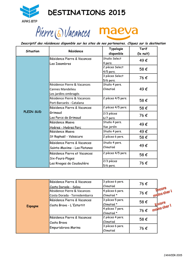 DESTINATIONS 2015 Descriptif des résidences disponible sur les sites de nos partenaires. Cliquez sur la destination Situation Résidence Typologie Tarif disponible (la nuit) Résidence Pierre & Vacances Studio Select Les Issambres 4 pers. 2 pièces Select 4/5 pers. 3 pièces Select Résidence Pierre & Vacances Cannes Mandelieu Les jardins ombragés Résidence Pierre & Vacances Port-Barcarès - Catalana PLEIN SUD Climatisé 2 pièces 4/5 pers. Résidence Pierre & Vacances 2 pièces 4/5 pers. Grimaud 2/3 pièces Les Parcs de Grimaud 6/7 pers. Studio 4 pers. Résidence Maeva 58 € 76 € 49 € 58 € 58 € 76 € 49 € Hyères - Hyères Parc Résidence Maeva Vue jardin Studio 4 pers. 49 € St Raphaël - Valescure 2 pièces 6 pers. 58 € Résidence Pierre & Vacances Studio 4 pers. Sainte-Maxime - Les Platanes Climatisé Résidence Pierre et Vacances 2 pièces 4/5 pers. Six-Fours-Plages Les Rivages de Coudoulière Espagne 5/6 pers. Studio 4 pers. 49 € 2/3 pièces 5/6 pers. Résidence Pierre & Vacances 3 pièces 6 pers. Costa Dorada - Salou Climatisé Résidence Pierre & Vacances Costa Dorada - Torredembarra 4 pièces 6 pers. Résidence Pierre & Vacances 3 pièces 5 pers. Costa Brava - L'Estartit Climatisé * 4 pièces 7 pers. Résidence Pierre & Vacances Costa Brava Empuriabrava Marina Climatisé * Climatisé * 2 pièces 4 pers. Climatisé 3 pièces 6 pers. Climatisé 49 € 58 € 76 € 76 € 76 € 58 € 76 € 58 € 76 € JANVIER 2015 DESTINATIONS 2015 Descriptif des résidences disponible sur les sites de nos partenaires. Cliquez sur la destination Situation Résidence Résidence Pierre & vacances Le Touquet Les Jardins de la Côte d'Opale Résidence MAEVA Trouville - Les Tamaris Résidence Pierre & Vacances Deauville - Les Embruns Résidence Pierre & Vacances Typologie Tarif disponible (la nuit) 2 pièces 4/5 pers. 2/3 pièces 6/7 pers. Studio 4 pers. Vue mer Studio 4 pers. 2 pièces 4/5 pers. Audierne Le phare de Trescadec Résidence Pierre & Vacances Premium - Douarnenez Le Coteau et la Mer Résidence Maeva 2/3 pièces 6/7 pers. 2 pièces 4 pers. 2 pièces 6 pers. Studio 4 pers. Quiberon - Ker Avel ATLANTIQUE Résidence Pierre & Vacances Premium Le Pouliguen - La Baule Le domaine de Cramphore Résidence Pierre & Vacances Le Croisic Saint-Goustan 76 € 49 € 49 € 58 € 76 € 58 € 76 € 49 € 2 pièces 3/4 pers. Classique * Studio 4 pers. Vue mer 2 pièces 6 pers. Résidence Maeva Vue mer Maison 3 pièces Pornic 5/6 pers. Duplex* Le Hameau du Golf Résidence Pierre & Vacances 2/3 pièces Le Château d’Olonne - L’Estran 5/6 pers. Résidence Pierre & Vacances La Rochelle - Centre Studio 4 pers. Résidence Pierre & Vacances 2 pièces 4/5 pers. 49 € 49 € 58 € 58 € 76 € 49 € 58 € Soulac-sur-Mer Les Dunes du Médoc Résidence Pierre & Vacances 2 pièces 4/5 pers. Biscarrosse Résidence Pierre & Vacances 2 pièces 4/5 pers. Saint Jean de Luz - Ciboure 58 € 58 € 58 € JANVIER 2015 DESTINATIONS 2015 Descriptif des résidences disponible sur les sites de nos partenaires. Cliquez sur la destination Situation Résidence Typologie Tarif disponible (la nuit) Résidence Pierre & Vacances Studio 3/4 pers. 49 € Plagne 1800 - Plagne lauze 2 pièces 4/5 pers. 58 € Résidence Pierre & Vacances Studio 4/5 pers. 49 € Belle Plagne - Constellations 2 pièces 4/5 pers. 58 € 2/3 pièces Résidence Pierre & Vacances Val Thorens Le Machu-Pichu Résidence Pierre & Vacances L'Alpes d'Huez - L'ours blanc Résidence Pierre & Vacances Arc 1800 - Le Belmont Résidence Pierre & Vacances Premium Arc 1950 - Le Village MONTAGNE Résidence Pierre & Vacances Val d'Isère - La Daille 6/7 pers. 2 pièces 4/5 pers. 58 € 2 pièces 4 pers. 2/3 pièces 6/7 pers. Studio 4 pers. 2 pièces 4/5 pers. 2 pièces 4 pers. Classique 3 pièces 6 pers. Classique Studio 4 pers. 2 pièces 4 pers. 2/3 pièces 6 pers. Résidence Pierre & Vacances Chamonix - La rivière Résidence Pierre & Vacances Isola 2000 Les Terrasses d'Azur Résidence Pierre & Vacances La Tania - Le Britania Résidence Pierre & Vacances Les Coches La Marelle et le Rami Résidence Pierre & Vacances Méribel-Mottaret Les Sentiers du Tueda Résidence Pierre & Vacances Vars - L'Albane 76 € Studio 4 pers. 2 pièces 4 pers. 2/3 pièces 5/6 pers. 2 pièces 4 pers. 58 € 76 € 49 € 58 € 58 € 76 € 49 € 58 € 76 € 49 € 58 € 76 € 58 € 2 pièces 4/5 pers. 58 € Studio 4 pers. 2/3 pièces 5/6 pers. Studio 4 pers. 2 pièces 4/5 pers. 2/3 pièces 6/7 pers. 49 € 76 € 49 € 58 € 76 € JANVIER 2015 DESTINATIONS 2015 Descriptif des résidences disponible sur les sites de nos partenaires. Cliquez sur la destination Situation Résidence Typologie Tarif disponible (la nuit) Résidence Pierre & Vacances 2 pièces 4/5 pers. Jonzac - Les Rives de la Seugne Résidence Pierre & Vacances 2 pièces 4/5 pers. Argentat - Les Belles Rives Résidence Pierre & Vacances Appartement Grospierre Select 2 pièces Le Rouret en Ardèche 4 pers. * Maison Select 2 pièces 5 pers. Maison Select CAMPAGNE 3 pièces 5/6 pers. Résidence Pierre & Vacances Loches Le Moulin des Cordeliers 2 pièces 4/5 pers. Résidence Pierre & Vacances 2 pièces 4/5 pers. Balcon/terrasse Eguisheim - Le Clos d'Eguisheim Résidence Pierre & Vacances 2 pièces 4/5 pers. Monflanquin La Résidence du Lac Maison 3 pièces 5/6 pers. 58 € 58 € 49 € 58 € 76 € 58 € 58 € 58 € 76 € Réservations impossibles aux dates suivantes : Cannes Mandelieu Les Jardins ombragés : Festival de Cannes - Du 13 au 23/05/2015 inclus. Minimum de nuits imposé : Pâques : min. 3 nuits (du 3 au 5/04/15 inclus) - 1er mai : min. 3 nuits (du 30/04 au 02/05/15 inclus) 8 mai : min. 3 nuits (du 7 au 9/05/15 inclus) - Ascension : min. 4 nuits (du 13 au 16/05/15) Pentecôte : min. 3 nuits (du 22 au 24/05/15 inclus) - 14 juillet : min. 4 nuits (du 10 au 13/07/15 inclus) * Costa Dorada - Torredembarra : 4 pièces au tarif d'un 3 pièces Costa Brava - L'Estartit : 3 pièces a