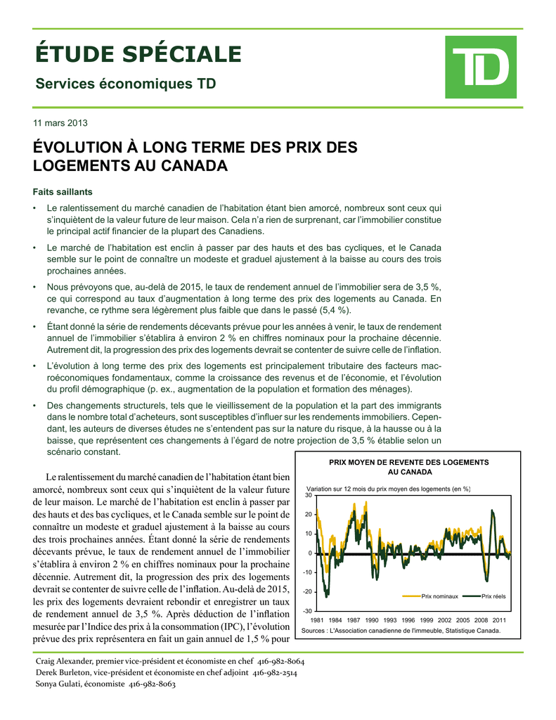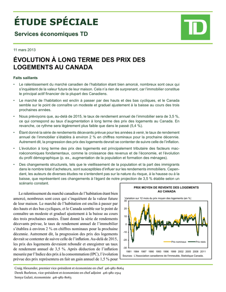 ÉTUDE SPÉCIALE Services économiques TD 11 mars 2013 ÉVOLUTION À LONG TERME DES PRIX DES LOGEMENTS AU CANADA Faits saillants • Le ralentissement du marché canadien de l’habitation étant bien amorcé, nombreux sont ceux qui s’inquiètent de la valeur future de leur maison. Cela n’a rien de surprenant, car l’immobilier constitue le principal actif financier de la plupart des Canadiens. • Le marché de l’habitation est enclin à passer par des hauts et des bas cycliques, et le Canada semble sur le point de connaître un modeste et graduel ajustement à la baisse au cours des trois prochaines années. • Nous prévoyons que, au-delà de 2015, le taux de rendement annuel de l’immobilier sera de 3,5 %, ce qui correspond au taux d’augmentation à long terme des prix des logements au Canada. En revanche, ce rythme sera légèrement plus faible que dans le passé (5,4 %). • Étant donné la série de rendements décevants prévue pour les années à venir, le taux de rendement annuel de l’immobilier s’établira à environ 2 % en chiffres nominaux pour la prochaine décennie. Autrement dit, la progression des prix des logements devrait se contenter de suivre celle de l’inflation. • L’évolution à long terme des prix des logements est principalement tributaire des facteurs macroéconomiques fondamentaux, comme la croissance des revenus et de l’économie, et l’évolution du profil démographique (p. ex., augmentation de la population et formation des ménages). • Des changements structurels, tels que le vieillissement de la population et la part des immigrants dans le nombre total d’acheteurs, sont susceptibles d’influer sur les rendements immobiliers. Cependant, les auteurs de diverses études ne s’entendent pas sur la nature du risque, à la hausse ou à la baisse, que représentent ces changements à l’égard de notre projection de 3,5 % établie selon un scénario constant. Le ralentissement du marché canadien de l’habitation étant bien amorcé, nombreux sont ceux qui s’inquiètent de la valeur future de leur maison. Le marché de l’habitation est enclin à passer par des hauts et des bas cycliques, et le Canada semble sur le point de connaître un modeste et graduel ajustement à la baisse au cours des trois prochaines années. Étant donné la série de rendements décevants prévue, le taux de rendement annuel de l’immobilier s’établira à environ 2 % en chiffres nominaux pour la prochaine décennie. Autrement dit, la progression des prix des logements devrait se contenter de suivre celle de l’inflation. Au-delà de 2015, les prix des logements devraient rebondir et enregistrer un taux de rendement annuel de 3,5 %. Après déduction de l’inflation mesurée par l’Indice des prix à la consommation (IPC), l’évolution prévue des prix représentera en fait un gain annuel de 1,5 % pour PRIX MOYEN DE REVENTE DES LOGEMENTS AU CANADA Variationsur12moisduprixmoyendeslogements(en%) 30 20 10 0 -10 -20 Prixnominaux Prixréels -30 1981 1984 1987 1990 1993 1996 1999 2002 2005 2008 2011 Sources:L'Associationcanadiennedel'immeuble,StatistiqueCanada. Craig Alexander, premier vice-président et économiste en chef 416-982-8064 Derek Burleton, vice-président et économiste en chef adjoint 416-982-2514 Sonya Gulati, économiste 416-982-8063 Services économiques TD | www.td.com/economics les propriétaires. Il s’agit d’un rendement réel inférieur à celui enregistré depuis 1980. Ces projections sont fondées sur l’évolution antérieure des prix des logements et les tendances à long terme que sous-tendent plusieurs indicateurs macroéconomiques. Avant de penser à l’avenir, observons d’abord le passé Des facteurs économiques influent sur l’évolution à court et à long terme des prix. Parmi les facteurs à court terme, on trouve les taux d’intérêt, la disponibilité du crédit, les prix des terrains, le taux de chômage et les modifications apportées à la réglementation sur les prêts hypothécaires. L’offre de logements est aussi moins flexible à court terme. À plus long terme, toutefois, les prix des logements affichent une croissance plus stable. De plus, ils sont influencés par davantage de facteurs macroéconomiques que les prix à court terme. Entre 1980 et 2012, par exemple, les prix des résidences ont augmenté de 5,4 % par an en moyenne au Canada. La période choisie dans le cadre de cette étude l’a été pour deux raisons. La première, c’est qu’elle est suffisamment longue pour comprendre plusieurs cycles économiques, ce qui élimine le risque que les résultats soient faussés par des sommets ou des creux cycliques. La deuxième, c’est que 1980 est la première année pour laquelle L’Association canadienne de l’immeuble a commencé à publier de façon constante les prix moyens des résidences. Au Canada, l’inflation globale s’est établie à 3,3 % par an en moyenne durant cette période. Compte tenu de l’inflation, le taux de rendement annuel réel de l’immobilier s’est donc chiffré à 2,1 %. La série de données utilisée ne tient pas compte des $CA TENDANCES RELATIVES AUX PRIX DES LOGEMENTS AJUSTÉS EN FONCTION DE LA QUALITÉ ET DE LA NON QUALITÉ TAUX D'INFLATION AU CANADA Variationsur12moisdel'indicedesprixàlaconsommation(en%) 18 16 IPCd'ensemble 14 Composantedulogement 12 10 8 6 4 2 0 -2 -4 1980 1983 1986 1989 1992 1995 1998 2001 2004 2007 2010 Sources:HaverAnalytics,StatistiqueCanada. changements apportés à la composition au fil du temps. De surcroît, elle ne reflète pas les ajustements relatifs à la qualité. Idéalement, il aurait fallu recourir à l’Indice des prix des propriétés MLS® (IPP MLS®), qui décortique certains de ces changements de composition. Or, la série de données ne commence qu’en 2005, ce qui nous empêche de dégager une tendance historique suffisante sur laquelle fonder notre projection. Les prix des logements afficheront un