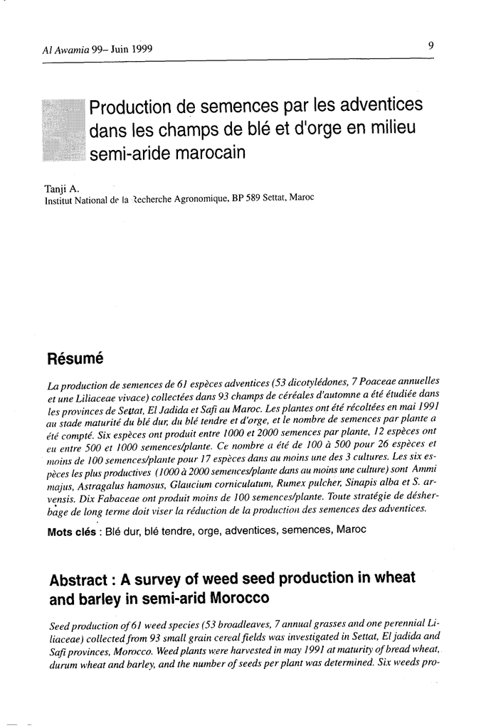 Seedproductionof6tweetlspecies(53broctdleaves,TannualgrassesandoneperennialLiIiaceae)collectedfrom 93 smatl grain cerealfields was investigatedin Sett(tt,El jadida and