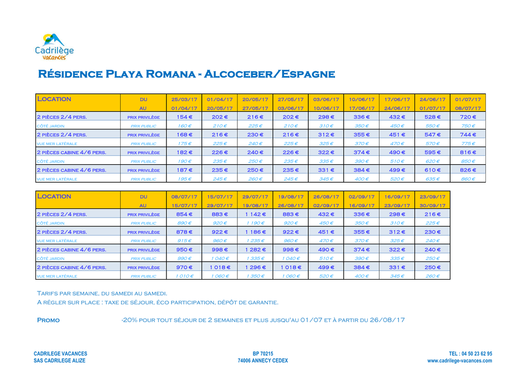 Résidence Playa Romana - Alcoceber/Espagne Location 2 pièces 2/4 pers. côté jardin 2 pièces 2/4 pers. vue mer latérale 2 pièces cabine 4/6 pers. côté jardin 2 pièces cabine 4/6 pers. vue mer latérale Location 2 pièces 2/4 pers. côté jardin 2 pièces 2/4 pers. vue mer latérale 2 pièces cabine 4/6 pers. côté jardin 2 pièces cabine 4/6 pers. vue mer latérale DU 25/03/17 01/04/17 20/05/17 27/05/17 03/06/17 10/06/17 17/06/17 24/06/17 01/07/17 AU 01/04/17 20/05/17 27/05/17 03/06/17 10/06/17 17/06/17 24/06/17 01/07/17 08/07/17 prix privilège 154 € 202 € 216 € 202 € 298 € 336 € 432 € 528 € 720 € prix public 160 € 210 € 225 € 210 € 310 € 350 € 450 € 550 € 750 € prix privilège 168 € 216 € 230 € 216 € 312 € 355 € 451 € 547 € 744 € prix public 175 € 225 € 240 € 225 € 325 € 370 € 470 € 570 € 775 € prix privilège 182 € 226 € 240 € 226 € 322 € 374 € 490 € 595 € 816 € prix public 190 € 235 € 250 € 235 € 335 € 390 € 510 € 620 € 850 € prix privilège 187 € 235 € 250 € 235 € 331 € 384 € 499 € 610 € 826 € prix public 195 € 245 € 260 € 245 € 345 € 400 € 520 € 635 € 860 € DU 08/07/17 15/07/17 29/07/17 19/08/17 26/08/17 02/09/17 16/09/17 23/09/17 AU 15/07/17 29/07/17 19/08/17 26/08/17 02/09/17 16/09/17 23/09/17 30/09/17 prix privilège 854 € 883 € 1 142 € 883 € 432 € 336 € 298 € 216 € prix public 890 € 920 € 1 190 € 920 € 450 € 350 € 310 € 225 € prix privilège 878 € 922 € 1 186 € 922 € 451 € 355 € 312 € 230 € prix public 915 € 960 € 1 235 € 960 € 470 € 370 € 325 € 240 € prix privilège 950 € 998 € 1 282 € 998 € 490 € 374 € 322 € 240 € prix public 990 € 1 040 € 1 335 € 1 040 € 510 € 390 € 335 € 250 € prix privilège 970 € 1 018 € 1 296 € 1 018 € 499 € 384 € 331 € 250 € prix public 1 010 € 1 060 € 1 350 € 1 060 € 520 € 400 € 345 € 260 € Tarifs par semaine, du samedi au samedi. A régler sur place : taxe de séjour, éco participation, dépôt de garantie. Promo CADRILEGE VACANCES SAS CADRILEGE ALIZE -20% pour tout séjour de 2 semaines et plus jusqu'au 01/07 et à partir du 26/08/17 BP 70215 74006 ANNECY CEDEX TEL : 04 50 23 62 95 www.cadrilege-vacances.com