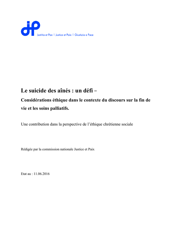 Le suicide des aînés : un défi – Considérations éthique dans le contexte du discours sur la fin de vie et les soins palliatifs. Une contribution dans la perspective de l’éthique chrétienne sociale Rédigée par la commission nationale Justice et Paix Etat au : 11.06.2016 Table des matières Préface ...................................................................................................................................... 3 1. La mort n’est plus taboue. Introduction ........................................................................... 4 2. Changements actuels ........................................................................................................... 7 2.1. Changements démographiques ..................................................................................... 7 2.2. Suicidalité, suicide des aînés et assistance au suicide ................................................. 8 2.3. Aspects socio-économiques ........................................................................................ 10 2.4. Importance des soins palliatifs ................................................................................... 11 2.5. Nouvelles règlementations juridiques ......................................................................... 13 3. Discours sur la fin de vie ................................................................................................... 15 3.1. Mourir est aussi un phénomène social ........................................................................ 15 3.2. Les morts idéales ......................................................................................................... 17 3.3. Initiatives et stratégies ................................................................................................. 19 3.4. Une nouvelle culture la mort ....................................................................................... 23 4. Accepter de mourir : défi(s) à relever ............................................................................. 25 4.1. Expériences et possibilités d‘action ........................................................................... 27 4.2. Réflexions d’éthique normative ................................................................................... 30 4.3. Valeurs, idéaux et vision de l‘homme .......................................................................... 34 4.4. Une nouvelle culture de la vie ..................................................................................... 36 5. Résumé ............................................................................................................................... 38 6. Recommandations ............................................................................................................. 41 7. Définitions des termes ....................................................................................................... 45 8. Bibliographie et adresses internet ................................................................................... 47 7.1. Livres et articles ......................................................................................................... 47 7.2. Textes ecclésiaux ........................................................................................................ 48 7.3. Adresses internet.......................................................................................................... 49 2 Préface Mourir n’est pas si simple. L’agonie et la mort sont précédées en règle générale de décisions et de mesures variées qui les influencent. Avec l’augmentation de l’espérance de vie, les phases du vieillissement et de la vieillesse deviennent, plus qu’autrefois, des périodes à aménager. Elles se transforment actuellement souvent en projets pour lesquels on n’a pas d’expériences ni de bases de référence. Le progrès des techniques médicales ainsi que des nouvelles thérapies de traitements élargissent constamment nos possibilités d’action. Il s’agira d’en distinguer les points critiques et de les évaluer. De nouvelles approches thérapeutiques impliquent souvent d’autres désagréments pour les personnes concernées qui vivent certes plus longtemps mais au détriment éventuel de leur qualité de vie. Il ne faut pas oublier le rôle important que jouent les questions de financement et de coûts dans l’évaluation de ces possibilités techniques et thérapeutiques. Au vu de telles perspectives, de plus en plus de personnes réfléchissent à prendre elles-mêmes leur mort en main et deviennent membre d’une « organisation d’assistance au suicide ». Dans ce contexte, les questions sur une bonne mort, sur l’autodétermination dans la mort sont devenues de plus en plus importantes. En Suisse, diverses organisations d’assistance au suicide proposent leurs services. Elles relèvent surtout l’aspect d’autodétermination dans la mort, non seulement pour les personnes sujettes à de grandes souffrances ou se trouvant en phase terminale mais également pour des personnes qui veulent mettre fin à leur vie pour raisons d’âge ou de lassitude. Ces tendances d’élargissement de l’assistance au suicide soulèvent de nouvelles questions fondamentales d’ordre éthique. Dans la conviction chrétienne, la vie est un cadeau qui englobe la totalité du cycle de vie. Cela implique, d’une part, la reconnaissance de la finitude et, d’autre part, la certitude que l’on ne peut pas disposer de la vie humaine. Nous nous trouvons donc dans une phase de réorientation en matière de maladie et de mort. Il faut trouver de nouvelles voies et de nouveaux repères. La présente publication se veut une contribution à la discussion publique sur les thèmes de l’autonomie, de la fragilité, de la mort et de l’assistance au suicide. Elle est une prise de position dans la perspective de l’éthique chr