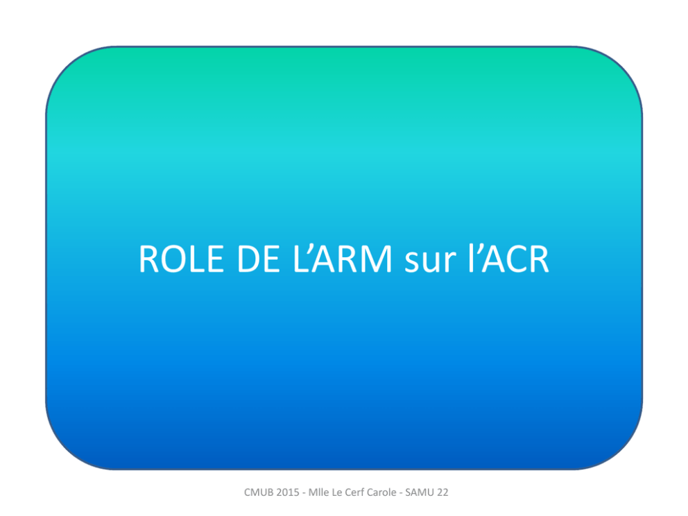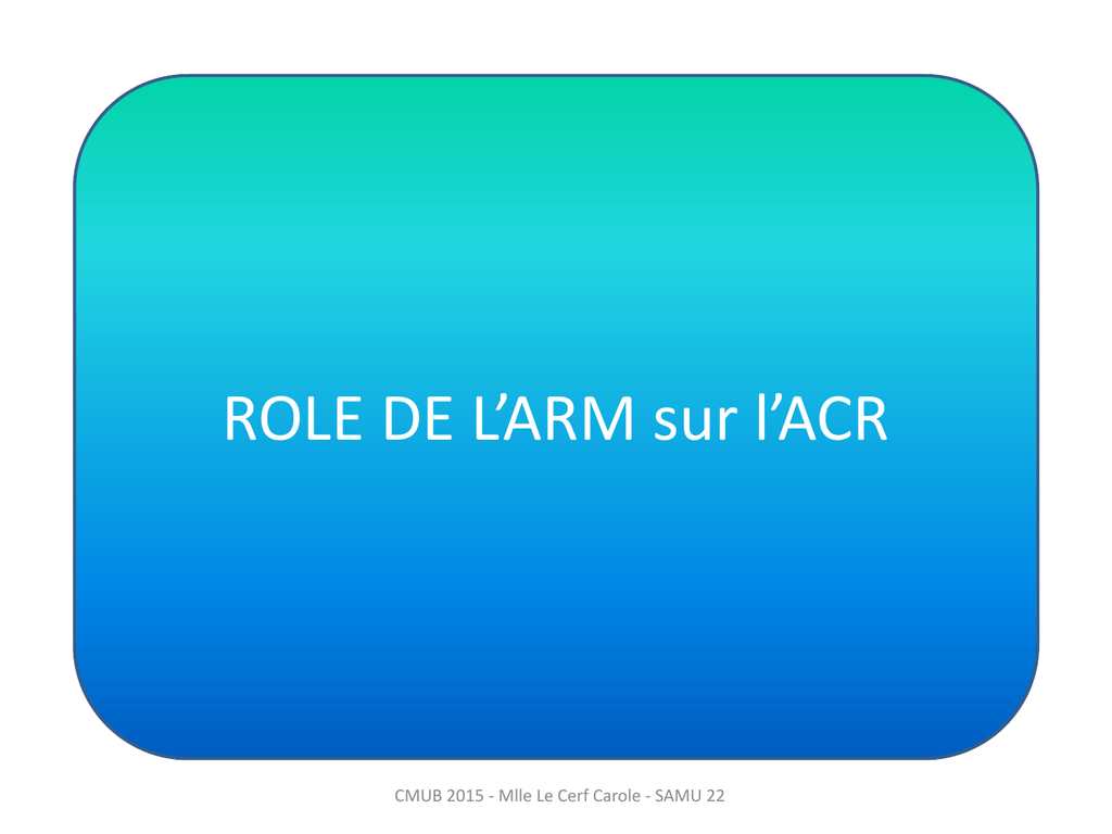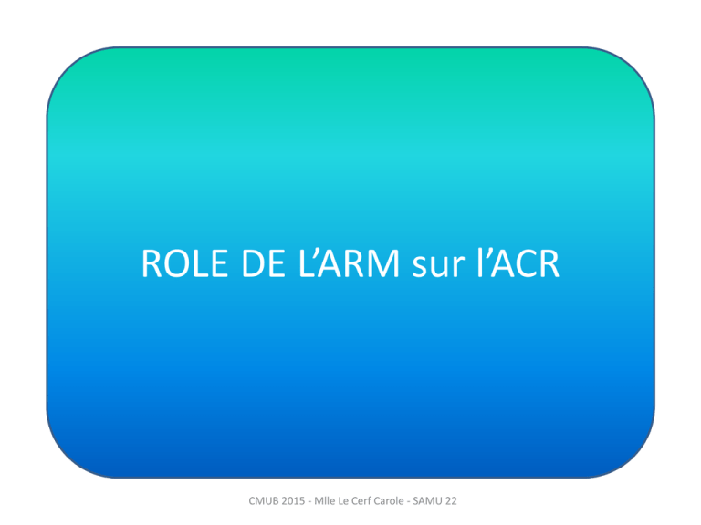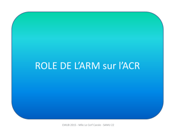 ROLE DE L’ARM sur l’ACR CMUB 2015 - Mlle Le Cerf Carole - SAMU 22 ARM : REPERER LES SIGNES DE L’ARRET CARDIAQUE CMUB 2015 - Mlle Le Cerf Carole - SAMU 22 - Est-ce qu’il respire ? - Est-ce que sa poitrine se soulève ? - Est-ce que vous sentez de l’air qui sort de sa bouche ? - Est-ce qu’il a une respiration anormale ? - La personne convulse : est-il épileptique ? 1ère crise de ce type ? CMUB 2015 - Mlle Le Cerf Carole - SAMU 22 LA PERSONNE NE RESPIRE PLUS CMUB 2015 - Mlle Le Cerf Carole - SAMU 22 er 1 CAS : Plusieurs témoins sur place (au moins deux) CMUB 2015 - Mlle Le Cerf Carole - SAMU 22 REGULATEUR DISPONIBLE L’ARM transmet immédiatement l’appel au Médecin Régulateur en PO et se rend donc disponible pour déclencher le SMUR en départ REFLEXE ainsi qu’un vecteur CMU B2015 - Mlle Le Cerf Carole - SAMU 22 MEDI Q (Centrale d’appels) : PO. L’appel en PO apparaît en rouge et passe avant tous les autres appels. CMUB2015 - Mlle Le Cerf Carole - SAMU22 REGULATEUR INDISPONIBLE IMMEDIATEMENT L’ARM demande à une de ses collègues de déclencher l’équipe SMUR en départ REFLEXE (Un VSAV peut être engagé de manière informatique selon les SAMU et l’ARM peut donc conserver le témoin au téléphone) * Demande au témoin s’il sait faire un massage cardiaque - Si c’est le cas : demander au témoin de faire 100 à 120 compressions thoraciques par minute - Si le témoin est proche d’un DEA : demander à ce qu’un autre témoin récupère le DEA - Puis pose du DEA et interrompre le moins possible les compressions thoraciques jusqu’à l’arrivée des secours. CMUB 2015 - Mlle Le Cerf Carole - SAMU 22 REGULATEUR INDISPONIBLE IMMEDIATEMENT Si le témoin ou les témoins n’ont jamais fait de massage cardiaque : l’ARM va guider le témoin par téléphone : - Placer les paumes des deux mains entre les deux seins, bras tendus et effectuer les compressions thoraciques. L’ARM peut compter les compressions au téléphone pour aider le témoin à faire le massage cardiaque - Pose du DEA et interrompre le moins possible les compressions thoraciques jusqu’à l’arrivée des secours Puis l’ARM transmet l’appel au Médecin Régulateur en PO CMUB 2015 - Mlle Le Cerf Carole - SAMU 22 2ème CAS : Un seul témoin sur place CMUB 2015 - Mlle Le Cerf Carole - SAMU 22 REGULATEUR DISPONIBLE L’ARM transmet immédiatement l’appel au Médecin Régulateur en PO et se rend donc disponible pour déclencher le SMUR en départ REFLEXE ainsi qu’un vecteur CMUB 2015 - Mlle Le Cerf Carole - SAMU 22 REGULATEUR INDISPONIBLE IMMEDIATEMENT L’ARM demande à une de ses collègues de déclencher l’équipe SMUR en départ REFLEXE (Un VSAV peut être engagé de manière informatique selon les SAMU et l’ARM peut donc conserver le témoin au téléphone) * Demande au témoin s’il sait faire un massage cardiaque - Si c’est le cas : demander au témoin de faire 100 à 120 compressions thoraciques par minute - Si le témoin est proche d’un DEA : demander à ce qu’un autre témoin récupère le DEA - Puis pose du DEA et interrompre le moins possible les compressions thoraciques jusqu’à l’arrivée des secours. CMUB2015 - Mlle Le Cerf Carole - SAMU22 REGULATEUR INDISPONIBLE IMMEDIATEMENT Si le témoin n’a jamais fait de massage cardiaque : l’ARM va guider le témoin par téléphone : - Placer les paumes des deux mains entre les deux seins, bras tendus et effectuer les compressions thoraciques. L’ARM peut compter les compressions au téléphone pour aider le témoin à faire le massage cardiaque - Pose du DEA et interrompre le moins possible les compressions thoraciques jusqu’à l’arrivée des secours Mais l’ARM ne transmet pas l’appel au Médecin Régulateur puisque le témoin est seul et doit continuer le massage cardiaque. L’ARM informe ensuite le Médecin Régulateur. CMUB 2015 - Mlle Le Cerf Carole - SAMU22
