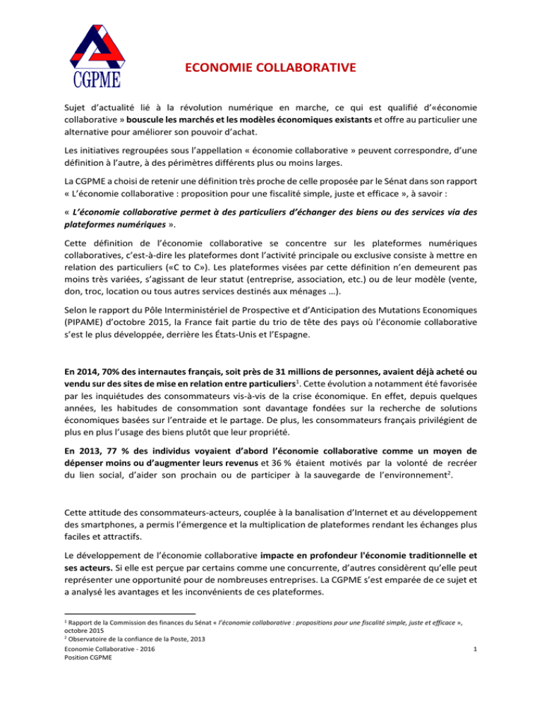 ECONOMIE COLLABORATIVE Sujet d’actualité lié à la révolution numérique en marche, ce qui est qualifié d’«économie collaborative » bouscule les marchés et les modèles économiques existants et offre au particulier une alternative pour améliorer son pouvoir d’achat. Les initiatives regroupées sous l’appellation « économie collaborative » peuvent correspondre, d’une définition à l’autre, à des périmètres différents plus ou moins larges. La CGPME a choisi de retenir une définition très proche de celle proposée par le Sénat dans son rapport « L’économie collaborative : proposition pour une fiscalité simple, juste et efficace », à savoir : « L’économie collaborative permet à des particuliers d’échanger des biens ou des services via des plateformes numériques ». Cette définition de l’économie collaborative se concentre sur les plateformes numériques collaboratives, c’est-à-dire les plateformes dont l’activité principale ou exclusive consiste à mettre en relation des particuliers («C to C»). Les plateformes visées par cette définition n’en demeurent pas moins très variées, s’agissant de leur statut (entreprise, association, etc.) ou de leur modèle (vente, don, troc, location ou tous autres services destinés aux ménages …). Selon le rapport du Pôle Interministériel de Prospective et d’Anticipation des Mutations Economiques (PIPAME) d’octobre 2015, la France fait partie du trio de tête des pays où l’économie collaborative s’est le plus développée, derrière les États-Unis et l’Espagne. En 2014, 70% des internautes français, soit près de 31 millions de personnes, avaient déjà acheté ou vendu sur des sites de mise en relation entre particuliers1. Cette évolution a notamment été favorisée par les inquiétudes des consommateurs vis-à-vis de la crise économique. En effet, depuis quelques années, les habitudes de consommation sont davantage fondées sur la recherche de solutions économiques basées sur l’entraide et le partage. De plus, les consommateurs français privilégient de plus en plus l’usage des biens plutôt que leur propriété. En 2013, 77 % des individus voyaient d’abord l’économie collaborative comme un moyen de dépenser moins ou d’augmenter leurs revenus et 36 % étaient motivés par la volonté de recréer du lien social, d’aider son prochain ou de participer à la sauvegarde de l’environnement2. Cette attitude des consommateurs-acteurs, couplée à la banalisation d’Internet et au développement des smartphones, a permis l’émergence et la multiplication de plateformes rendant les échanges plus faciles et attractifs. Le développement de l’économie collaborative impacte en profondeur l'économie traditionnelle et ses acteurs. Si elle est perçue par certains comme une concurrente, d’autres considèrent qu’elle peut représenter une opportunité pour de nombreuses entreprises. La CGPME s’est emparée de ce sujet et a analysé les avantages et les inconvénients de ces plateformes. 1 Rapport de la Commission des finances du Sénat « l’économie collaborative : propositions pour une fiscalité simple, juste et efficace », octobre 2015 2 Observatoire de la confiance de la Poste, 2013 Economie Collaborative - 2016 Position CGPME 1 Avantages – Inconvénients – Plateformes C to C AVANTAGES Solution économique Prix (visibilité) Accroissement concurrence Amélioration service Niveau de service Accessibilité / rapidité Sécurisation paiement Géolocalisation / Service de proximité Convivialité Consommateurs Prestataires (utilisateurs et particuliers offreurs) Complément revenu Sécurisation paiement Entreprises Etat Economie Collaborative - 2016 Position CGPME Sécurité des prestations / produits / Respect des qualifications, de la réglementation et des normes Impact du risque de monopole sur le coût subjectivité de l’information transmise par les particuliers offreurs Manque d’information sur l’utilisation des données et le suivi des habitudes de consommation par la plateforme Localisation de la plateforme Transfert des risques / responsabilité Risque relatif à la propriété intellectuelle Transfert d’activité vers les plateformes C to C (risque de destruction d’emploi) Concurrence déloyale à l’égard des entreprises du même secteur dont l’activité est règlementée Risque à terme de pression fiscale et sociale accrue en cas de réduction du nombre d’entreprises imposables Capacité d’adaptation des entreprises Déperdition fiscale/cotisations sociales Difficulté à déterminer frontière entre activité professionnelle et non professionnelle Difficulté à évaluer les facteurs d’équité fiscale Transparence/ visibilité Site d’opinion / notation / qualité INCONVENIENTS Remise en question Montée en gamme / Formation / Compétences Booster l’innovation / Nouvelles technologies / Transition numérique Moyen d’accélération de la transition numérique Possibilité d’obtenir les données des plateformes pour réaliser des statistiques par le biais de l’INSEE 2 Les problématiques des plateformes C to C : ▪ Difficulté à déterminer la frontière entre activité professionnelle et non professionnelle Concernant les plateformes C to C, le véritable enjeu concerne les « faux particuliers » qui sont des personnes qui réalisent un revenu important et régulier en concurrence directe avec des professionnels. Ex : Airbnb qui permet à des particuliers de louer leur bien immobilier ; Les critères pertinents permettant de déterminer le basculement vers le statut de professionnel sont fondamentaux. A cet égard, une Recommandation du Forum des Droits sur l’Internet (« FDI ») du 8 novembre 2005 identifiait des faisceaux d’indices permettant de déterminer le statut exact de l’offreur, à partir des critères suivants : la régularité de l’activité (« activité fréquente et réguliè