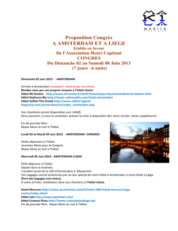 Proposition Congrès A AMSTERDAM ET A LIEGE Etablie en faveur De l’Association Henri Capitant CONGRES Du Dimanche 02 au Samedi 08 Juin 2013 (7 jours –6 nuits) Dimanche 02 Juin 2013 - AMSTERDAM Arrivée à Amsterdam (transport réservé par vos soins) Rendez-vous par vos propres moyens à l’hôtel choisi: Hôtel Nh Doelen http://www.nh-hotels.fr/nh/fr/hotels/pays-bas/amsterdam/nh-doelen.html Hôtel Radisson Blu http://www.radissonblu.com/hotel-amsterdam Hôtel Sofitel The Grand http://www.sofitel-legendthegrand.com/amsterdam/en/index_amsterdam.php Vos chambres seront disponibles vers 14h00. Nous pouvons, si vous le souhaitez, prévoir la mise à disposition dès votre arrivée. (Avec supplément) Fin de journée libre. Repas libres et nuit à l’hôtel. Lundi 03 et Mardi 04 Juin 2013 - AMSTERDAM- CONGRES Petits déjeuners à l’hôtel. Journées libres pour le Congrès. Repas libres et nuit à l’hôtel. Mercredi 05 Juin 2013 -AMSTERDAM /LIEGE Petit-déjeuner à l’hôtel. Départ dans la matinée. Transfert privé de la ville d’Amsterdam à Maastricht. Vos bagages seront acheminés par un bus spécial de votre hôtel à Amsterdam à votre hôtel à Liège. (Port des bagages non inclus) A votre arrivée, installation dans vos chambres à l’hôtel choisi. Hotel Mercure http://www.accorhotels.com/fr/hotel-1893-hotel-mercure-liegecentre/index.shtml Hôtel Jala http://www.jalahotel.com/ Hôtel Crowne Plaza http://www.crowneplazaliege.be/ Fin de journée libre. Repas libres et nuit à l’hôtel. Jeudi 06 et Vendredi 07 Juin 2013 - LIEGE - CONGRES Petits déjeuners à l’hôtel. Journées libres pour le Congrès. Repas libres et nuits à l’hôtel. Samedi 08 Juin 2013 - LIEGE / BRUXELLES Petit-déjeuner à l’hôtel. Déjeuner libre. A l’heure prévue, transfert privé (en mini groupe) pour rejoindre la gare ou l’aéroport de Bruxelles. CONGRES Prix par personne : Base hôtels Doelen / Mercure ou Jala: 1.210 Euros Base hôtels Radisson Blu / Mercure ou Jala: 1.560 Euros Base hôtels Sofitel The Grand / Crowne Plaza: 2.440 Euros Ces prix comprennent : -L'hébergement pour 6 nuitées, sur la base d’une chambre individuelle dans les hôtels et typologie de chambre mentionnées au programme (si aucune mention, chambre standard par défaut) – (Sous réserve de l’obtention des réservations.) -Les petits déjeuners dans tous les hôtels. -Le transfert en service regroupé d’Amsterdam à Maastricht. -L’acheminement des bagages de votre hôtel à Amsterdam à votre hôtel à Liège (le port des bagages n’étant pas inclus). -Le transfert en service regroupé de Liège à Bruxelles (gare ou aéroport). -L’assistance de nos bureaux locaux durant tout votre séjour. Ces prix ne comprennent pas: -Le vol international et les taxes d’aéroport. -Les déjeuners et les dîners. -Les boissons. -Les transferts aéroport/ hôtel/aéroport et tous les transferts pour vous rendre sur votre lieu de Congrès (ces prestations sont prises en charge par l’association Henri Capitant). -Les dépenses personnelles, les extras, les pourboires aux bagagistes, aux chauffeurs et aux guides. -Les assurances Assistance Rapatriement, Annulation, Interruption de séjour (4% du montant total du voyage). DEVIS ETABLI LE 18 Janvier 2013 SUR LA BASE DE 20 PERSONNES VOYAGEANT ENSEMBLE ET DONNE SOUS RESERVE DE L’OBTENTION DES RESERVATIONS. Proposition Pré Congrès aux Pays-Bas Etablie en faveur De l’Association Henri Capitant Du Mercredi 29 Mai au Dimanche 02 Juin 2013 (5 jours – 4 nuits) Mercredi 29 Mai 2013 AMSTERDAM / LA HAYE / DELFT / LA HAYE Accueil à la gare ou à l’aéroport par notre guide francophone, départ en autocar (durée 08 heures) Visite guidée de La Haye. Déjeuner inclus en cours de visite. Puis route pour Delft, la ville natale de Vermeer, et visite guidée de son centre historique et de ses canaux, de la Faïencerie Royale et des différentes étapes de fabrication de cette porcelaine, emblème de la Hollande. Fin des services de votre guide. Dîner au restaurant et logement à votre hôtel choisi: Hôtel Park http://www.parkhoteldenhaag.nl/default-nl.html Ou Hôtel Paléis http://www.paleishotel.nl/ Jeudi 30 Mai 2013 LA HAYE / ROTTERDAM / GOUDA / LA HAYE Petit-déjeuner à l’hôtel. Rendez-vous avec votre guide francophone. Départ pour une visite de la ville de Rotterdam, seconde ville du royaume par sa population et premier port du monde. Visite de la ville neuve avec le Lijnbaan, Coolsingel et l'Eglise Saint Laurent, l'architecture futuriste, les rives de la Meuse. Croisière dans le port de Rotterdam avec la compagnie Spido. Excursion de plus d'une heure en bateau qui vous emportera au milieu de l'activité fébrile qui règne le long des quais de Rotterdam. Vous comprendrez ce que signifie commerce international. Vous ne manquerez pas d'être impressionnés par les grands chantiers, quais et silos que vous pourrez contempler de si près ! Le port de Rotterdam accueille plus de 30.000 bateaux de haute mer et s'étend sur plus de 30 km. Déjeuner inclus en cours de visite. Puis départ Gouda qui est bien sûr réputée pour son fromage, ses poteries et ses bougies, mais aussi pour son centre historique. Fin des services de notre guide. Dîner au restaurant et nuit à l’hôtel. Vendredi 31Mai 2013 LA HAYE / HOORN / ENKUIZEN / LA HAYE Petit-déjeuner à votre hôtel. Rendez-vous avec votre guide francophone. Départ, passage par Hoorn, un des ports les plus caractéristiques de l'ancien Zuiderzee. Journée consacrée à la navigation de plaisance. Embarquement à bord du " STOOMTRAM ", chemin de fer touristique utilisant du matériel authentique, sorte de " musée roulant ", en direction de Medemblick, découverte d’une ancienne gare désaffectée animée par des bénévoles en costume du siècle dernier. Promenade en bateau sur le lac d'IJssel avec déjeuner à bord. Puis direction Enkuizen, ancien port de pêche avec visite de la ville. Fin des services de