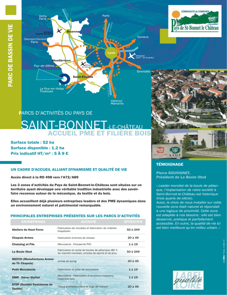 A89 A4 7 PARC DE BASSIN DE VIE Clermont-Ferrand Saint-Étienne Saint-Étienne PARCS D’ACTIVITÉS DU PAYS DE SAINT-BONNET-LE-CHÂTEAU ACCUEIL PME ET FILIÈRE BOIS Surface totale : 52 ha Surface disponible : 1.2 ha Prix indicatif HT/m² : 5 À 9 € TÉMOIGNAGE UN CADRE D'ACCUEIL ALLIANT DYNAMISME ET QUALITÉ DE VIE Pierre SOUVIGNET, Président de La Boule Obut Les 3 zones d’activités du Pays de Saint-Bonnet-le-Château sont situées sur un territoire ayant développé une véritable tradition industrielle avec des savoirfaire reconnus autour de la mécanique, du textile et du bois. Elles accueillent déjà plusieurs entreprises leaders et des PME dynamiques dans un environnement naturel et patrimonial remarquable. PRINCIPALES ENTREPRISES PRÉSENTES SUR LES PARCS D’ACTIVITÉS ENTREPRISES ACTIVITÉ EFFECTIFS Ateliers du Haut Forez Fabrication de meubles et fabrication de mobilier hospitalier. Chapuis Armes Fabrication d’armes de chasse Chataing et Fils Menuiserie - Charpente PVC La Boule Obut Fabrication et vente de boules de pétanque (80 % du marché mondial), articles de sports et de jeux. MATCH (Manufactures Armes de Tir Chapuis) Armes de poing Petit Menuiserie Fabrication et pose de menuiserie 1 à 19 SBM - Décor Stylisé Menuiserie - Fabrication d’escaliers/mobiliers/ matériels bois 1 à 19 STOF (Société Forézienne de Textile) Tissus d’ameublement et linge de maison 50 à 249 20 à 49 1 à 19 50 à 249 20 à 49 20 à 49 « Leader mondial de la boule de pétanque, l’implantation de notre société à Saint-Bonnet-le-Château est historique (trois quarts de siècle). Aussi, le choix de nous installer sur cette nouvelle zone était naturel et répondait à une logique de proximité. Cette zone est adaptée à nos besoins : elle est bien desservie, pratique et parfaitement accessible. En outre, la qualité de vie ici est bien meilleure qu’en milieu urbain. » expansion - Photos : © ADEL 42 42 Accès direct à la RD 498 vers l’A72/A89 Occupé Avec option Document non contractuel Mise à jour : 01/01/2014 PARC DE BASSIN DE VIE Pays de St-BONNET-le-CHATEAU in arcell St-M Disponible Non équipé Site de La Gravoux Site de LA GRAVOUX N SBM Michalon 0,28 ha 0,45 ha SBM Badel Automobile Forezienne de Textile Match Chapuis Chataing ActivBois Services techniques municipaux Forezienne de Textile OBUT SDIS 42 Caserne Pompiers Boulevard de l’industrie Scierie de d ar ev ul Bo Réserve incendie Valoralys l’E ur op e Securistest St-Bonnet Le-Château Documentation non contractuelle - Mise à jour : Janvier 2014 Activbois Bassins de rétention Ateliers du Haut Forez 8 RD 49 Chataing PARCS D’ACTIVITÉS DU PAYS DE SAINT-BONNET-LE-CHÂTEAU ATOUTS DU SITE Une offre diversifiée avec 3 sites d'accueil : La Gravoux sur St-Bonnet-le-Château / La Tourette / Luriecq Le Generret à Estivareilles Les Quarchons à Usson-en-Forez Sur Saint-Bonnet-le-Château : Logements, crèches, commerces et services Transport interurbain de la Loire : TIL. À 30 minutes sur Saint-Étienne : Formations et enseignement supérieur CONTACTS COMMERCIALISATION de Communes du Pays X Communauté de Saint-Bonnet-le-Château 1 Route d’Augel – Espace Déchelette 42380 Saint-Bonnet-le-Château Tél. 04 77 50 14 30 Fax 04 77 50 73 94 [email protected] Centre de ressources à disposition des entreprises du Développement X Agence Économique de la Loire ATOUTS TECHNIQUES Couverture haut débit ADSL X Toutes les possibilités d’implantation dans la Loire : www.adel42.com - www.invest-in-loire.com 20 rue Balaÿ 42000 Saint-Étienne Tél. 04 77 49 25 50 Fax 04 77 49 25 79 [email protected] - Photos : © expansion 42 SERVICES AUX ENTREPRISES ET AUX SALARIÉS