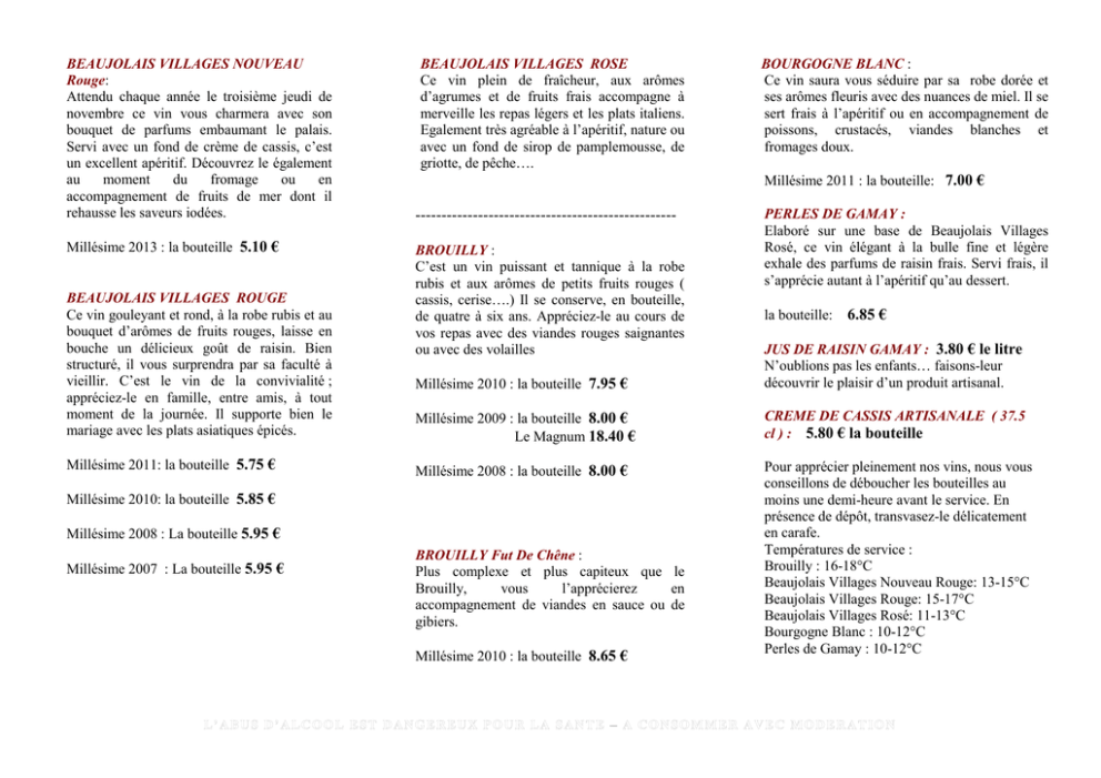 BEAUJOLAIS VILLAGES NOUVEAU Rouge: Attendu chaque année le troisième jeudi de novembre ce vin vous charmera avec son bouquet de parfums embaumant le palais. Servi avec un fond de crème de cassis, c’est un excellent apéritif. Découvrez le également au moment du fromage ou en accompagnement de fruits de mer dont il rehausse les saveurs iodées. Millésime 2013 : la bouteille 5.10 € BEAUJOLAIS VILLAGES ROUGE Ce vin gouleyant et rond, à la robe rubis et au bouquet d’arômes de fruits rouges, laisse en bouche un délicieux goût de raisin. Bien structuré, il vous surprendra par sa faculté à vieillir. C’est le vin de la convivialité ; appréciez-le en famille, entre amis, à tout moment de la journée. Il supporte bien le mariage avec les plats asiatiques épicés. Millésime 2011: la bouteille 5.75 € BEAUJOLAIS VILLAGES ROSE Ce vin plein de fraîcheur, aux arômes d’agrumes et de fruits frais accompagne à merveille les repas légers et les plats italiens. Egalement très agréable à l’apéritif, nature ou avec un fond de sirop de pamplemousse, de griotte, de pêche…. Millésime 2011 : la bouteille: 7.00 € -------------------------------------------------BROUILLY : C’est un vin puissant et tannique à la robe rubis et aux arômes de petits fruits rouges ( cassis, cerise….) Il se conserve, en bouteille, de quatre à six ans. Appréciez-le au cours de vos repas avec des viandes rouges saignantes ou avec des volailles PERLES DE GAMAY : Elaboré sur une base de Beaujolais Villages Rosé, ce vin élégant à la bulle fine et légère exhale des parfums de raisin frais. Servi frais, il s’apprécie autant à l’apéritif qu’au dessert. la bouteille: 6.85 € Millésime 2010 : la bouteille 7.95 € JUS DE RAISIN GAMAY : 3.80 € le litre N’oublions pas les enfants… faisons-leur découvrir le plaisir d’un produit artisanal. Millésime 2009 : la bouteille 8.00 € Le Magnum 18.40 € CREME DE CASSIS ARTISANALE ( 37.5 cl ) : 5.80 € la bouteille Millésime 2008 : la bouteille 8.00 € Pour apprécier pleinement nos vins, nous vous conseillons de déboucher les bouteilles au moins une demi-heure avant le service. En présence de dépôt, transvasez-le délicatement en carafe. Températures de service : Brouilly : 16-18°C Beaujolais Villages Nouveau Rouge: 13-15°C Beaujolais Villages Rouge: 15-17°C Beaujolais Villages Rosé: 11-13°C Bourgogne Blanc : 10-12°C Perles de Gamay : 10-12°C Millésime 2010: la bouteille 5.85 € Millésime 2008 : La bouteille 5.95 € Millésime 2007 : La bouteille 5.95 € BOURGOGNE BLANC : Ce vin saura vous séduire par sa robe dorée et ses arômes fleuris avec des nuances de miel. Il se sert frais à l’apéritif ou en accompagnement de poissons, crustacés, viandes blanches et fromages doux. BROUILLY Fut De Chêne : Plus complexe et plus capiteux que le Brouilly, vous l’apprécierez en accompagnement de viandes en sauce ou de gibiers. Millésime 2010 : la bouteille 8.65 € CARTE DES VINS Valable du 01/09/13 au 31/08/2014 Prix unitaire T.T.C. livré par nos soins – vente par carton de 6 bouteilles BOUTEILLE 75 Cl Prix Qté Total unit. BEAUJOLAIS VILLAGE NOUVEAU 2013 5.10 € BEAUJOLAIS VILLAGES 2011 5.75 € BEAUJOLAIS VILLAGES 2010 5.85 € BEAUJOLAIS VILLAGES 2008 5.95 € BEAUJOLAIS VILLAGES 2007 5.95 € BEAUJOLAIS VILLAGES ROSE Règlement par chèque libellé à l’ordre de Jacques GENETIER Cartons de 6 bouteilles - panachage possible Vente dans la limite des stocks disponibles BEAUJOLAIS VILLAGES BROUILLY Sur demande, conditionnements particuliers : demi-bouteille, Magnum (1,5 L), Jéroboam (3 L), Mathusalem (6 L)… Pour bénéficier de nos remises pensez à grouper vos commandes avec vos familles, collègues, amis…. Pour tous renseignements, n’hésitez pas à nous contacter. DOMAINE DU « TANE » BROUILLY 2008 8.00 € BROUILLY 2009 8.00 € BROUILLY 2009 Magnum 18.40 € BROUILLY 2010 7.95 € BROUILLY 2010 fût de chêne 8.65 € BOURGOGNE BLANC 2011 7.00 € PERLES DE GAMAY 6.85 € Jus de Raisin Gamay (1 litre) 3.80 € CREME de CASSIS (37.5 cl) Vente à l’unité 5.80 € Tel : 04 74 03 40 34 Fax : 09 56 98 40 34 Mobile : 06 67 32 53 97 BEAUJOLAIS VILLAGES NOUVEAU 2013 24.50 € E-mail : [email protected] Site : http://www.domainedutane.fr/ BEAUJOLAIS VILLAGES 2010 25.50 € Jacques GENETIER Viticulteur - Récoltant La Jonchère 69460 SAINT ETIENNE DES OULLIERES Fontaine à vin 5L