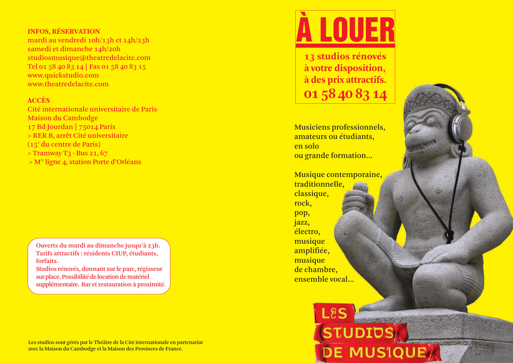 INFOS, RÉSERVATION mardi au vendredi 10h/13h et 14h/23h samedi et dimanche 14h/20h [email protected] Tel 01 58 40 83 14 | Fax 01 58 40 83 15 www.quickstudio.com www.theatredelacite.com ACCÈS Cité internationale universitaire de Paris Maison du Cambodge 17 Bd Jourdan | 75014 Paris > RER B, arrêt Cité universitaire (15’ du centre de Paris) > Tramway T3 - Bus 21, 67 > M° ligne 4, station Porte d’Orléans Ouverts du mardi au dimanche jusqu’à 23h. Tarifs attractifs : résidents CIUP, étudiants, forfaits. Studios rénovés, donnant sur le parc, régisseur sur place. Possibilité de location de matériel supplémentaire. Bar et restauration à proximité. Les studios sont gérés par le Théâtre de la Cité internationale en partenariat avec la Maison du Cambodge et la Maison des Provinces de France. 13 studios rénovés à votre disposition, à des prix attractifs. 01 58 40 83 14 Musiciens professionnels, amateurs ou étudiants, en solo ou grande formation... Musique contemporaine, traditionnelle, classique, rock, pop, jazz, électro, musique amplifiée, musique de chambre, ensemble vocal... 2 studios pour les musiques amplifiées 2 studios climatisés et spécialement insonorisés (21 m2 et 29 m2) peuvent accueillir des groupes de musiques amplifiées (jusqu’à 8 musiciens) ou des ensembles en petite formation acoustique. Matériel : chaises, pupitres, une sono complète, amplis guitare et basse, une batterie, un clavier, des micros. Conditions : location ponctuelle ou régulière sur l’année. Ouverts du mardi au vendredi de 10h à 13h et de 14h à 23h ; le samedi et le dimanche de 14h à 20h (sauf jours fériés et une partie des vacances scolaires) Location à l’heure ou sous forme de forfaits (minimum 20h). Un régisseur assure l’encadrement, l’installation de la salle et du matériel. Sur demande : location de matériel supplémentaire. 1 grand studio pour ensembles et chœurs Ce studio est dédié aux formations de taille moyenne. Il peut accueillir dans ses 127 m2 des ensembles comprenant jusqu’à 45 musiciens ou 60 chanteurs. Matériel : piano ¼ de queue, batterie, chaises et pupitres. Possibilité de location d’ampli guitare, ampli basse et système de diffusion. Conditions : location ponctuelle ou régulière sur l’année. Ouvert de 9h à 23h, 7 jours sur 7 Sur demande : location de matériel supplémentaire. ....................................................... 10 studios individuels acoustiques 10 studios de 8m2 à 10 m2 dont 5 sont équipés de pianos, tous disposent de chaises et de pupitres. et week-end) Conditions : studios ouverts de 9h à 23h, 7 jours sur 7, (sauf jours fériés et une partie des vacances scolaires). Location à l’heure ou sous forme de forfaits (minimum 30h). Les résidents de la Cité accèdent gratuitement aux 4 studios situés dans La Maison des Provinces de France (réservation néanmoins obligatoire) 11,5 €/h 13,5 €/h ....................................................... Forfait 20h 200 € 245 € Forfait 30h 295 € 360 € ....................................................... Tarifs TTC matériel inclus Tarif horaire Journée (avant 17h) Soir (après 17h Studio avec piano Plein tarif 7,5 €/h Tarif solo, sous certaines conditions, nous consulter. Tarif étudiant 5 €/h Tarif résident CIUP 4 €/h Studio sans piano Tarif solo/duo Plein tarif Tarifs Location à l’heure 50 €/h TTC pour les ensembles professionnels 40 €/h TTC pour les ensembles amateurs Tarifs dégressifs en fonction de l’effectif. Tarif solo/duo 7 €/h Tarif étudiant 4,5 €/h Tarif résident CIUP 3,75 €/h Forfait 30h 132 € (soit 4,40 €/h) 83 € (soit 2,76 €/h) 60 € (soit 2 €/h) Forfait 30h 115 € (soit 3,83 €/h) 68 € (soit 2,26 €/h) 55 € (soit 1,83 €/h) Tarif groupe (entre 2 et 4 personnes), nous consulter. Adhésion saison 2011-2012 : 10 € pour les individuels, 15 € pour les groupes, 30 € pour les ensembles.