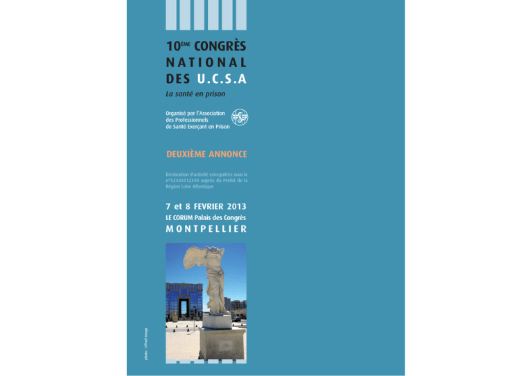 10ÈME CONGRÈS NATIONAL DES U C S A La santé en prison Organisé par l’Association des Professionnels de Santé Exerçant en Prison DEUXIÈME ANNONCE 7 et 8 FEVRIER 2013 LE CORUM Palais des Congrès photo : ©Pixel Image MONTPELLIER PRÉ-PROGRAMME Jeudi 7 Février ÉDITO DOUBLE DIX A MONTPELLIER 08H30 – 09H15 ACCUEIL DES PARTICIPANTS Sans aucune superstition, mais avec sérieux, nous sommes heureux de vous accueillir à Montpellier les 7 et 8 février 2013 pour le 10ème Congrès National des UCSA, et ce, 10 ans après le 4ème Congrès qui a eu lieu en 2003 à Montpellier. Ce dixième congrès reflète bien la dynamique de l'Association des Professionnels de Santé Exerçant en Prison (APSEP), pour une reconnaissance de notre spécificité et de notre engagement quotidien. Bientôt nous fêterons aussi les 20 ans d'existence "juridique" des UCSA (loi 1994), et ce passage de l'adolescence à l'âge adulte sera une étape clef pour l'ensemble des Professionnels de Santé exerçant en milieu carcéral de s'approprier, de garantir, dans les meilleurs conditions les missions qui leur sont confiées. Les débats et l'interaction entre tous les participants seront favorisés et souhaités par l'organisation : pendant la communication des actualités (CPU, guide méthodologique, partage d'information…) et aussi pendant les sessions orales, où le nombre de communications sera réduite afin d'augmenter les temps d'échanges. 09H15 – 10H00 ALLOCUTIONS D’OUVERTURE Salle Pasteur Le Le Le Le Le Le Le Le Maire de Montpellier ou son représentant Directeur de l'ARS ou son représentant Directeur Général du CHU de Montpellier ou son représentant représentant du Conseil Général représentant du Conseil Régional représentant de la Direction Inter-Régionale des Services Pénitentiaires Président de l'APSEP Chef de service de l’UCSA de Montpellier 10H00 – 10H45 ACTUALITÉS : 1ère Partie Salle Pasteur Avec les représentants du Ministère de la Santé et de la Justice (sous réserve) 10H45 – 11H15 PAUSE La soirée de Gala sera une surprise et nous espérons que vous serez nombreux à venir partager ce moment de convivialité pour fêter ses dix étoiles. 11H15 – 12H00 ACTUALITÉS : 2ème Partie Salle Pasteur Enfin, nous clôturerons ce congrès par une session internationale, chère à l'APSEP, en accueillant le Sénégal, l'Algérie et un consortium Européen. 12H15 – 13H00 SYMPOSIUM RECKITT BENKISER Salle Pasteur La réussite de ce congrès se fera avec vous, votre participation témoignant de votre engagement dans ce milieu d'enfermement si particulier. Avec les représentants du Ministère de la Santé et de la Justice (sous réserve) 13H00 – 14H15 DÉJEUNER 14H15 – 14H45 DISCOURS DE MR. DELARUE Salle Pasteur Dr Fadi MEROUEH 14H45 - 16H00 SESSION 1 Salle Pasteur Comité Scientifique Dr. Patrick SERRE Dr. Valérie KANOUI Dr. Virginie BRULET Dr. Fabienne LE MONNIER Dr. Laura HARCOUËT Dr. Anne BÉCART Dr. Emeline CHAIGNE Pr. Valery HÉDOUIN Dr. Fadi MEROUEH Dr. François MOREAU Modérateurs : V. KANOUI, JM. QUIGNARD 1 Le soin IDE au sens large : prévenir – dépister – éviter : exemple de la prise en soins des patients diabétiques et du dépistage dans le cadre du plan cancer. P. JAOUL, N. LEMOINE (Villeneuve les Maguelonne) 2 Rôle et engagement de l'infirmier dans les actions d'éducation à la santé à partir d'une expérience depuis de nombreuses années.dans une U.C.S.A. B. CHAUFFRAY (Saint Quentin Fallavier) 3 Organisation, bilan et évaluation d’une consultation de suivi des patients détenus en maison d’arrêt. B. DUMOUILLA, S. DURIEUX (Versailles) SESSION 2 Salle Antigone Modérateurs : P. BEAUPERE, L. HARCOUET 1 Prise en charge des patients diabétiques insulinodépendants en milieu pénitentiaire en France en 2012. C. BUCHAILLE, D. MAUILLON, N. JOUSE, C. ROUGÉ-MAILLART (Angers) PRÉ-PROGRAMME Jeudi 7 Février 2 Un atelier thérapeutique par le sport. R.PERISSE, S.DURAY (Roanne) PRÉ-PROGRAMME Vendredi 8 Février 08H30 - 09H45 SESSION 5 Salle Pasteur Modérateurs : A. LEBON HUBERT, D. MAUILLON 3 Education Thérapeutique du Patient détenu et Hépatite C chronique au sein des Centres Pénitentiaires lillois : une activité de soin au quotidien. V. CLAYEMENS (Sequedin), Dr JC. GUICHARD, V. GURY (Annoeullin), Dr E. LUNEAU, F. ROMBEAUX, Pr V. HEDOUIN. 1 Les enjeux et les défis de la prise en charge du VIH en milieu carcéral aujourd’hui. Dr V. FAUCHERRE (Villeneuve les Maguelonne) 2 Le patient atteint du VHC en prison a t il une perte de chance ? Dr F. MEROUEH, MC. NEPPER (IDE), H. MARTEAU (CDS) (Villeneuve les Maguelonne) 16H00 - 16H30 PAUSE ET POSTERS 3 Le Centre Pour Peines Aménagées au Centre pénitentiaire de Bordeaux-Gradignan : une prise en charge spécifique pluridisciplinaire. Dr F. LE MONNIER, A. HUBERT (ASE) 16H30 - 17H45 SESSION 3 Salle Pasteur Modérateurs : G. LE PORT, F. LE MONNIER SESSION 6 Salle Antigone Modérateurs : E. CHAIGNE, V. HEDOUIN 1 Prise en charge des addictions,infections et RDR en prison en France, le «French Paradox». Dr F. MEROUEH (Villeneuve les Maguelonne) 1 Art. 717-1 du CPP et traitement psychique en UCSA. F. MASSON (Casabianda) 2 Evaluation des usages de substances psychoactives chez les mineurs incarcérés à l’EPM 2 Benzodiazépines en prison : ange ou démon ? DR M. LACAMBRE (Villeneuve les Maguelonne) d’Orvault en 2011. Dr C. GOUBIN, V. BRULET, Dr C. DUPAS (Nantes) 3 Questions de Femmes » : parler de sexualité, c’est possible, travailler tous ensemble, aussi. 3 Quelle place de l’infirmier dans l’accompagnement d’un patient privé de liberté ayant une problématique addictive ? A. DUQUESNEY, D. MAUILLON, C. ROUGÉ-MAILLART (Angers) C. LORGNIER (Education Nationale DI Nord), F. ROMBEAUX (UF UCSA «Prévention Education Santé» Lille) E. ROY (SPIP Sequedin) 09H45 - 10H15 PAUSE ET POSTER SESSION 4 Salle Antigone Modérateurs : A. BECART, F. MOREAU 10H15 - 12H15 SESSION INTERNATIONALE Salle 