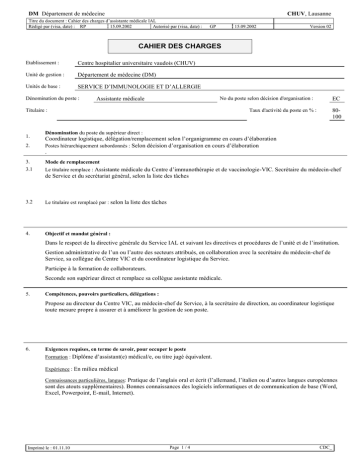 DM Département de médecine CHUV, Lausanne Titre du document : Cahier des charges d’assistante médicale IAL Rédigé par (visa, date) : RP 15.09.2002 Autorisé par (visa, date) : GP 15.09.2002 Version 02 CAHIER DES CHARGES Etablissement : Centre hospitalier universitaire vaudois (CHUV) Unité de gestion : Département de médecine (DM) Unités de base : SERVICE D’IMMUNOLOGIE ET D’ALLERGIE Dénomination du poste : No du poste selon décision d'organisation : Assistante médicale Titulaire : 1. 2. 3. 3.1 EC Taux d'activité du poste en % : 80100 Dénomination du poste du supérieur direct : Coordinateur logistique, délégation/remplacement selon l’organigramme en cours d’élaboration Postes hiérarchiquement subordonnés : Selon décision d’organisation en cours d’élaboration . Mode de remplacement Le titulaire remplace : Assistante médicale du Centre d’immunothérapie et de vaccinologie-VIC. Secrétaire du médecin-chef de Service et du secrétariat général, selon la liste des tâches 3.2 Le titulaire est remplacé par : selon la liste des tâches 4. Objectif et mandat général : Dans le respect de la directive générale du Service IAL et suivant les directives et procédures de l’unité et de l’institution. Gestion administrative de l’un ou l’autre des secteurs attribués, en collaboration avec la secrétaire du médecin-chef de Service, sa collègue du Centre VIC et du coordinateur logistique du Service. Participe à la formation de collaborateurs. Seconde son supérieur direct et remplace sa collègue assistante médicale. 5. Compétences, pouvoirs particuliers, délégations : Propose au directeur du Centre VIC, au médecin-chef de Service, à la secrétaire de direction, au coordinateur logistique toute mesure propre à assurer et à améliorer la gestion de son poste. 6. Exigences requises, en terme de savoir, pour occuper le poste Formation : Diplôme d’assistant(e) médical/e, ou titre jugé équivalent. Expérience : En milieu médical Connaissances particulières, langues: Pratique de l’anglais oral et écrit (l’allemand, l’italien ou d’autres langues européennes sont des atouts supplémentaires). Bonnes connaissances des logiciels informatiques et de communication de base (Word, Excel, Powerpoint, E-mail, Internet). Imprimé le : 01.11.10 Page 1 / 4 CDC_ DM Département de médecine CHUV, Lausanne Titre du document : Cahier des charges d’assistante médicale IAL Rédigé par (visa, date) : RP 15.09.2002 Autorisé par (visa, date) : Activité No 1 2 3 4 5 GP 15.09.2002 7. Activités principales Temps Moyen en % Gestion administrative générale Assure, pendant ses heures de présence, la permanence téléphonique et la réception Participe à la gestion des diverses bases de données informatisées (Agendas, Polypoint, etc.) Gère le courrier et les colis (réception, tri et distribution) Gère les stocks, passe commande du matériel internes et externes dont la liste des tâches la rend responsable (via le logiciel RAFA). Propose des économies pour l’acquisition du matériel. Contrôle les factures des fournisseurs et communique les anomalies à la comptabilité des Hospices Organise les colloques du service, y participe et prend les procès-verbaux Gestion des activités de soins En collaboration avec sa collègue : Dispense une communication efficace et personnalisée avec les patients et leur entourage (ou les volontaires) Assure des soins d’hygiène, de confort et d’entretien spécifiques au patient Respecte les normes en vigueur Favorise l’intégration du patient ou du volontaire dans le cadre du Centre VIC Organise les rendez-vous des patients (gestion de l’agenda, du matériel d’information aux patients et à leur entourage) Prépare et contrôle, les dossiers médicaux de patients et le matériel de prélèvement Recherche les dossiers aux archives VAC ou au CAM via Gedo Effectue les prélèvements de sang, se déplace au besoin dans le cadre de la suisse romande, Vaud principalement Classe et archive les résultats d’examens et le dossier médical Gestion administrative des activités de clinique, d’enseignement et de recherche Tient à jour la liste des cours, colloques, conférences et séminaires donnés par les collaborateurs du Service. Participe à la gestion de l’un des sites WEB du Service. Compose et dactylographie les programmes de cours, les supports d’enseignement, les polycopiés, les articles scientifiques et les rapports cliniques (év. sous dictaphone). Prend part à l’organisation de manifestations de formation (réservations des salles, convocations, logistique générale). Participe à la recherche de documents et d’articles. Assiste les collaborateurs à la préparation d’activités de formation données à l’extérieur (transmission de la demande de congé, inscription, paiement des frais, réservation des billets, etc.). Tient à jour la base de données de littérature et la collection des tirés-à-part. Formation Participe aux cours et séminaires de formation continue. Met à jour et développe ses connaissances. Collabore à la formation du nouveau personnel et des stagiaires. Entretien Participe au programme de maintenance et d’entretien des appareils confiés. Imprimé le : 01.11.10 Version 02 Page 2 / 4 10 60 5 4 1 CDC_ DM Département de médecine CHUV, Lausanne Titre du document : Cahier des charges d’assistante médicale IAL Rédigé par (visa, date) : RP 15.09.2002 Autorisé par (visa, date) : 6 GP 15.09.2002 Autres Effectue toute autre tâche qui lui est demandée dans le cadre de sa formation et de sa fonction. Délègue les responsabilités qui lui sont attribuées à titre personnel, lors de chaque absence conséquente. Version 02 20 Met en ordre sa place de travail et les locaux dont elle est responsable. 7 Relations internes / externes 7.1 Au niveau interne : direction du Service, du Département et du CHUV l’ensemble des collaborateurs du Service se