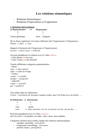 Les relations sémantiques - Relations hiérarchiques - Relations d’équivalence et d’opposition 1. Relations hiérarchiques a) Hyperonymes → Hyponymes ↓ ↓ = = Terme générique Sous – catégorie De la classe supérieure à la classe inférieure (de l’hyperonyme à l’hyponyme ) Plante → fleur → rose Rapport d’inclusion (de l’hyponyme à l’hyperonyme) : Scooter → deux-roues → véhicule On peut paraphraser la relation avec le verbe « être » - Cette plante est une rose - Cette voiture est une Renault Touche différentes catégories grammaticales : - Noms : chat → chat siamois table → table de bridge - Verbes : couper → cisailler manger → grignoter - Adjectifs : rouge → pourpre gai → guilleret Très utilisé dans les définitions. Violon = instrument de musique à quatre cordes, que l’on frotte avec un archet ….. b) holonymes → méronymes ↓ ↓ = = tout partie veste → deux manches, un col, un devant, un dos, des poches …. Peut être paraphrasé avec le verbe « avoir » : une bicyclette a un guidon, un cadre , deux roues, deux pédales Catégories utilisées pour rendre compte des relations méronymiques: - membre/ ensemble : arbre/forêt - composant/ assemblage : anse/tasse - portion/ masse : part/gâteau - matière/objet : cuir /valise - activité/phase (processus) : flirt/adolescence - zone /lieu : oasis/désert 2. Relation d’opposition (antonymie) A. Les formes de l’antonymie 3 formations : a) mots simples, opposés par leur sens : jeune ≠ vieux b) mots préfixés, que le sens de leur préfixe oppose : délicat ≠ indélicat coudre ≠ découdre prochinois ≠ antichinois c ) quelques mots composés avec -phile et -phobe B. Les sens de l’antonymie On peut classer les antonymes en distinguant1 : Antonymes absolus (absent ≠présent) Antonymes relatifs (les unités lexicales ne s’opposent que dans certains contextes Ex : raisonnement curieux ≠ raisonnement normal ; objet curieux ≠ objet banal) a) termes contraires (ou complémentaires ou non gradables): l’un exclut l’autre mort ≠ vivant b) antonymes polaires (ou gradables) : ils comportent deux termes avec un ou plusieurs termes intermédiaires chaud → tiède ≠ froid petit → moyen ≠ grand c) antonymes réciproques : impliquent deux faits complémentaires mais inversés vendre ≠ acheter prêter ≠ emprunter père≠ fils bru≠ belle-mère/ beau-père 3. Relation d’équivalence (synonymie) Les synonymes ont un même signifié et des signifiants différents et se distinguent des homonymes (même signifiant, signifiés différents). La synonymie indique une relation de sens entre unités lexicales. Dans un même contexte, les synonymes sont substituables. - synonymie totale ou absolue (le contexte n’intervient pas) - synonymie partielle ou contextuelle : dans le cas où les synonymes concernent des unités polysémiques, la synonymie ne porte que sur une acception. C’est le contexte qui permet de savoir quelle acception est à prendre en considération. 1 Les termes utilisés changent selon les linguistes, nous utilisons ici la classification de Joëlle Gardes-Tamine. La Grammaire. 1/ Phonologie, morphologie, lexicologie, Paris, Armand Colin, 1990, p. 108. a) La synonymie totale est très rare : - elle concerne surtout les nomenclatures scientifiques (ex. : les doublets médicaux avec emprunts au latin et au grec). Ex : tétanie = spasmophilie alcoolique = éthylique alcootest = éthylomètre pissenlit = dent-de-lion - les collocations sont un autre obstacle à la synonymie totale. collocation = relation privilégiée entre les mots. C’est l’usage qui consacre ces relations privilégiées (associations stéréotypées) ⇒ impossibilité de remplacer par un synonyme. Ainsi, pour exprimer l’intensité, le choix de l’adjectif , de l’adverbe ou de la locution adverbiale dépend du verbe ou du substantif qui y est associé. Ex : un alcoolique invétéré , un sportif endurci (l’idée exprimée par les deux adjectifs est la même). Une ferme résolution, un soin scrupuleux, une attention soutenue, une ignorance crasse (l’adjectif crasse, qui ne s’emploie que dans cette association stéréotypée, vient du latin crassus = grossier) Dormir à poings fermés (profondément) , pleuvoir à verse (beaucoup) …. b) La synonymie partielle est la plus courante : Les synonymes peuvent varier en fonction des différents sens des mots polysémiques : Remplir (= occuper) une fonction Remplir (= compiler) un formulaire mais aussi pour de nombreuses autres raisons : - évolution de la langue (variation diachronique) : destrier /cheval - géographie (variation diatopique) : wassingue (nord de la France) / panosse (sud de la France) / serpillière (terme non marqué) ; le bar (du mot néerlandais : baers) est le poisson de l’Atlantique qui correspond au loup (de la Méditerranée) c’est-à-dire au branzino italien - registre de langue (variation diastratique) : familier/standard : futal/pantalon ; littéraire/standard : croisée/fenêtre ; argot/ familier/standard : keuf/flic/policier - précision : journal/quotidien - langue de spécialité/langue courante : préposé/facteur, ictère/jaunisse - intensité ou degré : murmurer/parler/crier/ hurler - connotation : o nuance affective : neutre, laudative, dépréciative : mince/svelte/maigre o euphémisme : demandeur d’emploi /chômeur ; technicien de surface/ balayeur