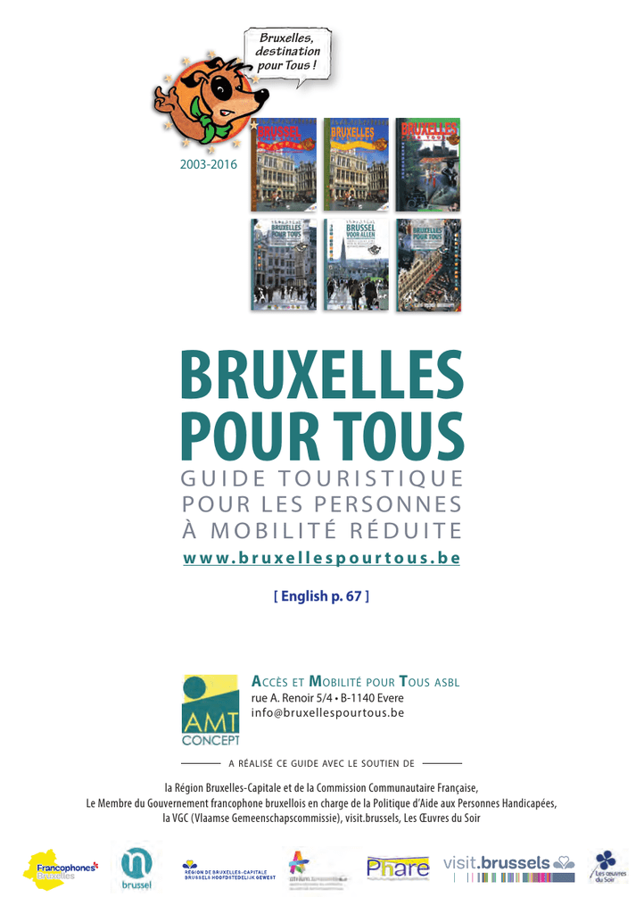 Bruxelles, destination pour Tous ! 2003-2016 BRUXELLES POUR TOUS GUIDE TOURISTIQUE POUR LES PERSONNES À MOBILITÉ RÉDUITE w w w. b r u xe l l e s p o u r t o u s . b e [ English p. 67 ] A ccès et M obilité pour T ous asbl rue A. Renoir 5/4 • B-1140 Evere [email protected] a réalisé ce guide avec le soutien de la Région Bruxelles-Capitale et de la Commission Communautaire Française, Le Membre du Gouvernement francophone bruxellois en charge de la Politique d’Aide aux Personnes Handicapées, la VGC (Vlaamse Gemeenschapscommissie), visit.brussels, Les Œuvres du Soir SOMMAIRE INTRODUCTION page 3-5 RESTAURANTS ET CAFÉS page 37 ACCESS-I page 6 DANCINGS page 51 PICTOGRAMMES page 7 COMMERCES page 52 PRATIQUE / SERVICES page 53 CRITÈRES INTERNATIONAUX page 8 TRANSPORTS page 9 • Avion page 10 • Train page 11 • Bus - Métro - Tram page 13 • Taxi page 14 • Voiture personnelle page 15 • Argent page 53 • Toilettes page 53 • Associations et organismes page 54 • Lieux de culte page 55 • Police page 55 • Poste page 56 • Santé page 56 AMT CONCEPT page 57 PETIT MANUEL page 60 page 62 TOURISME page 15 LOISIRS / CULTURE page 16 • Cinémas page 16 • Musées page 17 LANGUE DES SIGNES • Théâtre - spectacle page 21 LE LANGAGE FACILE-À-LIRE page 64 • Expo - conférences page 23 • Parcs page 26 • Sport - piscines page 28 HÉBERGEMENT page 29 BIBLIOGRAPHIE page 65 REMERCIEMENTS page 66 Vous retrouverez le même contenu sur notre site w w w.bruxellespour tous.be où est mise à votre disposition une information développée et illustrée. English version : p.67 Nederlandse versie : draai ondersteboven (p.1) À LA RÉALISATION : Cette publication a été réalisée par l’asbl AMT Concept. Direction, coordination et secrétariat du projet : Miguel GEREZ Relevés et rédaction : Géraldine LESAGE, Sabine GEOFFROY, Agustina PELUFFO, Miguel GEREZ. Conception graphique et fabrication : André MOONS-Séraphine sprl. Impression: Imprimerie HAVAUX. Nouvelles implémentations des pictogrammes en lien avec « Access-i », reformulations ponctuelles d’adaptation sur le site web : Editions Parcours - Benoit DUMONT. Dessin technique et pictogramme : Anne-Sophie PETIT, Architecte Secrétariat : Eléonore NAZARYAN. Figurants : Anne DELVAUX, Pierrot GIRASA, Miguel GEREZ, Véronique LONCIN et Fabrice FRANCOIS. Photos : Géraldine LESAGE, Sabine GEOFFROY, André MOONS, Agustina PELUFFO, Miguel GEREZ, Michel MERNIER, Wallonie-Bruxelles Tourisme, visit.brussels ©AMT Concept a.s.b.l., Bruxelles 2016 Editeur responsable : Miguel GEREZ, Administrateur-délégué, AMT Concept asbl : 5/4 rue Auguste Renoir, 1140 Evere. Toute reproduction, même partielle, d’un extrait quelconque de ce guide, par quelque procédé que ce soit est interdite sans autorisation écrite d’AMT Concept asbl/vzw. Publication gratuite, ne peut être vendu. E n ma qualité de Ministre de la politique d’aide aux personnes handicapées en Région bruxelloise, l’une de mes priorités est de garantir l’inclusion des personnes en situation de handicap dans notre société. C’est la raison pour laquelle je favorise depuis plus d’un an le recours systématique au principe d’handistreaming. Il s’agit d’une condition indispensable pour renforcer la prise en compte de la dimension handicap dans l’élaboration des politiques nouvelles et d’assurer ainsi l’inclusion des personnes en situation de handicap dans l’ensemble des domaines couverts par l’action publique, qu’il s’agisse d’emploi, de mobilité, du logement, de la culture ou encore du sport. La Charte Handistreaming, adoptée en décembre 2015, est un signe fort, un véritable engagement de l’ensemble des Ministres et Secrétaires d’Etat bruxellois visant à adopter toute une série de mesures prioritaires à mettre en œuvre au niveau des différentes compétences communautaires et régionales afin de favoriser l’inclusion de la personne en situation de handicap. C’est la raison pour laquelle, je veille, en tant que Ministre du Logement de la Région de Bruxelles-Capitale, à favoriser l’accès au logement de TOUS les bruxellois. Un guide « Handi Cap Logement », également produit par AMT Concept, sera publié en 2016. Ce guide a pour ambition de sensibiliser, d’informer et d’aider les professionnels à construire et rénover des bâtiments pour qu’ils soient adaptables, adaptés ou accessibles à tous. Je soutiens également différentes initiatives qui visent à sensibiliser le grand public, comme la journée Libercity, ou encore à favoriser l’accessibilité de certains événements culturels organisés à Bruxelles comme Couleur Café, le Brussels Summer Festival et les Plaisirs d’Hiver. Par ailleurs, en tant que Ministre bruxelloise de l’Environnement, je souhaite poursuivre et intensifier le travail en vue d’assurer l’accessibilité des espaces verts à Bruxelles. L’asbl AMT concept est agréée par le Service Phare en tant que service spécialisé en matière d’accessibilité de l’espace social. Son objectif est de développer toute action visant à améliorer l’accessibilité des espaces publics, des transports et des bâtiments de manière à permettre aux personnes à mobilité réduite de se déplacer en toute autonomie. C’est dans cette perspective que l’asbl produit, depuis 2003, le guide « Bruxelles pour tous ». Il s’agit d’un outil pratique qui rassemble les différents lieux touristiques accessibles en Région de Bruxelles-Capitale et qui offre ainsi la possibilité aux touristes à mobilité réduite d’organiser préalablement leurs visites, déplacements, loisirs ou encore leur hébergement. Il est donc essentiel de poursuivre ce travail en produisant de nouvelles éditions qui seront systématiquement actualisées et complétées en regard des améliorations effectuées chaque année pour rendre Bruxelles plus inclusive. J’espère que cette nouvelle édition pe