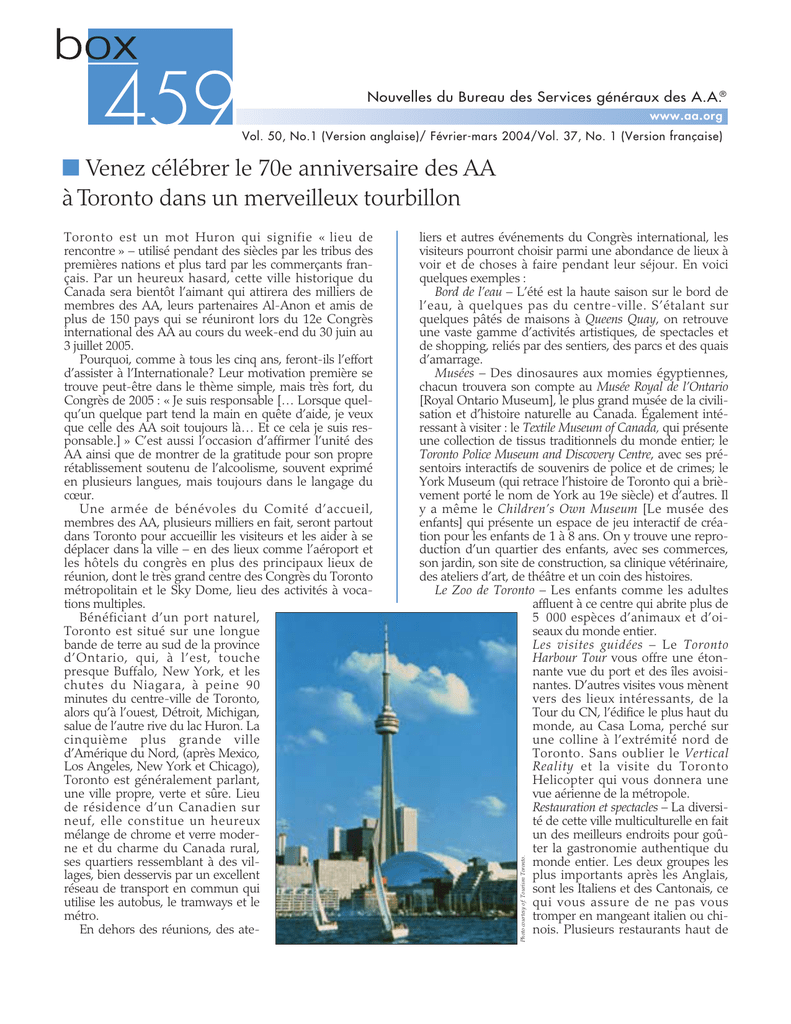 Nouvelles du Bureau des Services généraux des A.A.® www.aa.org Vol. 50, No.1 (Version anglaise)/ Février-mars 2004/Vol. 37, No. 1 (Version française) ■ Venez célébrer le 70e anniversaire des AA à Toronto dans un merveilleux tourbillon liers et autres événements du Congrès international, les visiteurs pourront choisir parmi une abondance de lieux à voir et de choses à faire pendant leur séjour. En voici quelques exemples : Bord de l’eau – L’été est la haute saison sur le bord de l’eau, à quelques pas du centre-ville. S’étalant sur quelques pâtés de maisons à Queens Quay, on retrouve une vaste gamme d’activités artistiques, de spectacles et de shopping, reliés par des sentiers, des parcs et des quais d’amarrage. Musées – Des dinosaures aux momies égyptiennes, chacun trouvera son compte au Musée Royal de l’Ontario [Royal Ontario Museum], le plus grand musée de la civilisation et d’histoire naturelle au Canada. Également intéressant à visiter : le Textile Museum of Canada, qui présente une collection de tissus traditionnels du monde entier; le Toronto Police Museum and Discovery Centre, avec ses présentoirs interactifs de souvenirs de police et de crimes; le York Museum (qui retrace l’histoire de Toronto qui a brièvement porté le nom de York au 19e siècle) et d’autres. Il y a même le Children’s Own Museum [Le musée des enfants] qui présente un espace de jeu interactif de création pour les enfants de 1 à 8 ans. On y trouve une reproduction d’un quartier des enfants, avec ses commerces, son jardin, son site de construction, sa clinique vétérinaire, des ateliers d’art, de théâtre et un coin des histoires. Le Zoo de Toronto – Les enfants comme les adultes affluent à ce centre qui abrite plus de 5 000 espèces d’animaux et d’oiseaux du monde entier. Les visites guidées – Le Toronto Harbour Tour vous offre une étonnante vue du port et des îles avoisinantes. D’autres visites vous mènent vers des lieux intéressants, de la Tour du CN, l’édifice le plus haut du monde, au Casa Loma, perché sur une colline à l’extrémité nord de Toronto. Sans oublier le Vertical Reality et la visite du Toronto Helicopter qui vous donnera une vue aérienne de la métropole. Restauration et spectacles – La diversité de cette ville multiculturelle en fait un des meilleurs endroits pour goûter la gastronomie authentique du monde entier. Les deux groupes les plus importants après les Anglais, sont les Italiens et des Cantonais, ce qui vous assure de ne pas vous tromper en mangeant italien ou chinois. Plusieurs restaurants haut de Photo courtesy of: Tourism Toronto. Toronto est un mot Huron qui signifie « lieu de rencontre » – utilisé pendant des siècles par les tribus des premières nations et plus tard par les commerçants français. Par un heureux hasard, cette ville historique du Canada sera bientôt l’aimant qui attirera des milliers de membres des AA, leurs partenaires Al-Anon et amis de plus de 150 pays qui se réuniront lors du 12e Congrès international des AA au cours du week-end du 30 juin au 3 juillet 2005. Pourquoi, comme à tous les cinq ans, feront-ils l’effort d’assister à l’Internationale? Leur motivation première se trouve peut-être dans le thème simple, mais très fort, du Congrès de 2005 : « Je suis responsable [… Lorsque quelqu’un quelque part tend la main en quête d’aide, je veux que celle des AA soit toujours là… Et ce cela je suis responsable.] » C’est aussi l’occasion d’affirmer l’unité des AA ainsi que de montrer de la gratitude pour son propre rétablissement soutenu de l’alcoolisme, souvent exprimé en plusieurs langues, mais toujours dans le langage du cœur. Une armée de bénévoles du Comité d’accueil, membres des AA, plusieurs milliers en fait, seront partout dans Toronto pour accueillir les visiteurs et les aider à se déplacer dans la ville – en des lieux comme l’aéroport et les hôtels du congrès en plus des principaux lieux de réunion, dont le très grand centre des Congrès du Toronto métropolitain et le Sky Dome, lieu des activités à vocations multiples. Bénéficiant d’un port naturel, Toronto est situé sur une longue bande de terre au sud de la province d’Ontario, qui, à l’est, touche presque Buffalo, New York, et les chutes du Niagara, à peine 90 minutes du centre-ville de Toronto, alors qu’à l’ouest, Détroit, Michigan, salue de l’autre rive du lac Huron. La cinquième plus grande ville d’Amérique du Nord, (après Mexico, Los Angeles, New York et Chicago), Toronto est généralement parlant, une ville propre, verte et sûre. Lieu de résidence d’un Canadien sur neuf, elle constitue un heureux mélange de chrome et verre moderne et du charme du Canada rural, ses quartiers ressemblant à des villages, bien desservis par un excellent réseau de transport en commun qui utilise les autobus, le tramways et le métro. En dehors des réunions, des ate- Box 4-5-9 est publié à tous les deux mois par le Bureau des Services généraux des Alcooliques anonymes, 475 Riverside Drive, New York, NY 10115, © Alcoholics Anonymous World Services, Inc., 2004 Adresse postale : P.O. Box 459, Grand Central Station New York, NY 10163 Site Web du BSG : www.aa.org Abonnements : Individuel, $3.50 par an ; groupes, $6.00 par année pour 10 exemplaires. Envoyer votre chèque payable à A.A.W.S., Inc.—avec votre commande. gamme ont concocté une cuisine canadienne contemporaine à partir des meilleurs ingrédients qu’on puisse trouver au Canada. Essayez le saumon et autres fruits de mer, le cerf et le caribou, et les têtes de violons, le maïs et toute une variété de légumes combinés en des mets savoureux. Côté théâtre, il y a toujours quelque chose à l’affiche du Second City, du Royal Alexandra et du Princess of Wales sur la rue King. Les spectacles vont du jazz en juin au théâtre expérimental, aux arts folkloriq