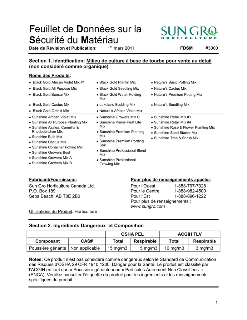 Feuillet de Données sur la Sécurité du Matériau 1er mars 2011 Date de Révision et Publication: FDSM #3000 Section 1. Identification: Milieu de culture à base de tourbe pour vente au détail (non considéré comme organique) Noms des Produits: Black Gold African Violet Mix #1 Black Gold Plantin Mix Nature’s Basic Potting Mix Black Gold All Purpose Mix Black Gold Seedling Mix Nature’s Cactus Mix Black Gold Bonsai Mix Black Gold Water Holding Mix Nature’s Premium Potting Mix Black Gold Cactus Mix Lakeland Bedding Mix Nature’s Seedling Mix Black Gold Orchid Mix Nature’s African Violet Mix Sunshine African Violet Mix Sunshine All Purpose Planting Mix Sunshine Azalea, Camellia & Rhododendron Mix Sunshine Bulb Mix Sunshine Cactus Mix Sunshine Container Potting Mix Sunshine Growers Best Sunshine Growers Mix A Sunshine Growers Mix B Sunshine Growers Mix C Sunshine Pansy Peat Lite Mix Sunshine Premium Planting Mix Sunshine Premium Portting Soil Sunshine Professional Blend Mix Sunshine Professional Growing Mix Fabricant/Fournisseur: Sun Gro Horticulture Canada Ltd. P.O. Box 189 Seba Beach, AB T0E 2B0 Sunshine Retail Mix #1 Sunshine Retail Mix #4 Sunshine Rose & Flower Planting Mix Sunshine Seed Starter Mix Sunshine Tree & Shrub Mix Pour plus de renseignements appeler: Pour l’Ouest 1-888-797-7328 Pour le Centre 1-888-982-4500 Pour l’Est 1-888-896-1222 Pour plus de renseignements : www.sungro.com Utilisations du Produit: Horticulture Section 2. Ingrédients Dangereux et Composition OSHA PEL Composant CAS# Poussière gênante Non applicable Total 15 mg/m3 Respirable 5 mg/m3 ACGIH TLV Total Respirable 10 mg/m3 3 mg/m3 Notes: Ce produit n’est pas considéré comme dangereux selon le Standard de Communication des Risques d’OSHA 29 CFR 1910.1200, Danger pour la Santé. Le produit est classifié par l’ACGIH en tant que « Poussière gênante » ou « Particules Autrement Non Classifiées » (PNCA). Veuillez consulter l’étiquette du produit pour les ingrédients et les renseignements spécifiques du produit. 1 Section 3. Caractéristiques Physiques/Chimiques Etat Physique: Solide Apparence: Granuleuse, comme de la terre Couleur: Marron, couleur ocre Odeur: Terreuse pH: 3.5 ào 7.5 3 Densité: 100-200 g/l ou 6–12 lb/pi Point d’ébullition: Non applicable Pression de vapeur: Non applicable Soluble dans l’eau: Non applicable Point de fusion: Non applicable Taux d’évaporation: Non applicable Gravité spécifique: Non applicable Section 4. Données sur les Risques d’Incendie et d’Explosion Point d’Ignition: Non applicable Limites inflammables: Non applicable Agents d’extinction: Eau, brouillard ou pulvérisation Instructions spéciales anti- Aucunes. Attention, le feu peut continuer à brûler à l’intérieur incendies: des sacs ou des tas après avoir éteint le feu en surface. Ouvrir les sacs ou éparpiller les tas pour s’assurer que le feu est éteint. Les produits de décomposition thermale sont ceux couramment observés avec des produits naturels tels bois ou autre matière végétative. Risques d’Incendie et d’Explostion peu communs Aucun Section 5. Stabilité et Réactivité Stabilité: Stable Conditions à Eviter: Voir l’étiquette. Garder loin de la chaleur, des étincelles et des flammes. Incompatibilité: Inconnue Décomposition Dangereuse Les températures élevées ou le feu peuvent produire des gaz ou Sous-produits: et des vapeurs irritants. Polymérisation: Ne se produit pas Matériaux Incompatibles: Inconnus Section 6. Données sur les Risques de Santé Voies d’Entrée Inhalation, plaies ouvertes et yeux Risques de Santé Poussière gênante. Voir étiquette pour les ingrédients Potentiel Cancérigène: Inconnu Effets de l’Exposition: L’inhalation à long terme de grande quantité de toute poussière gênante peut surcharger le mécanisme de dégagement des poumons, irriter les membranes muqueuses et rendre les poumons plus vulnérables aux maladies respiratoires. Soins d’Urgence et de En cas d’inhalation, donner de l’air frais. S’il y a une irritation des Premiers Secours yeux, rincer avec de l’eau. Garder les plaies ouvertes couvertes et propres tel que le suggère tout bon programme d’hygiène. Autres Inquiétudes: Garder hors de portée des enfants et des animaux familiers. 2 Section 7. Renseignements Toxicologiques Commentaires Généraux: L’inhalation de la poussière peut irriter le nez, la gorge et les poumons. Le contacte des yeux avec des solides peut produire irritation, larmes ou clignement comme un élément étranger dans l’oeil. Section 8. Précautions pour une Manipulation et un Usage sans Danger Mesures à prendre au cas où Utiliser des méthodes pour nettoyer le déversement qui évite le matériau est répandu : de créer de la poussière aéroportée. Méthode d’Enlèvement de Selon l’EPA 40 CFR 261.3, le déchet de ce produit n’est pas Déchet défini comme dangereux. Enlever tout déchet selon les règles locales, de l’état et fédérales. Précautions à prendre pour la Si une quantité excessive de poussière est créée, éviter de la manipulation et respirer en assurant une ventilation adaptée et/ou en utilisant l’entreposage: un respirateur homologué NIOSH ou MSHA pour ce type de poussière gênante. Respirer de la poussière peut être nuisible à votre santé Autres Précautions: Des lunettes de protection doivent être portées là où les niveaux de poussière sont assez élevés pour causer une irritation. Renseignements Garder hors des lacs, cours d’eau ou étangs Ecologiques: Section 9. Mesures de Contrôle Protection Respiratoire Si de la poussière est créée, utiliser un respirateur homologué NIOSH ou MSHA pour ce type de poussière. Ventilation: Un échappement local est recommandé si une quantité excessive de poussière est créée, Gants de Protection: Ne sont pas nécessaires normalement mais suggérés en cas de plaies ouvertes qui ne sont pas protégées de