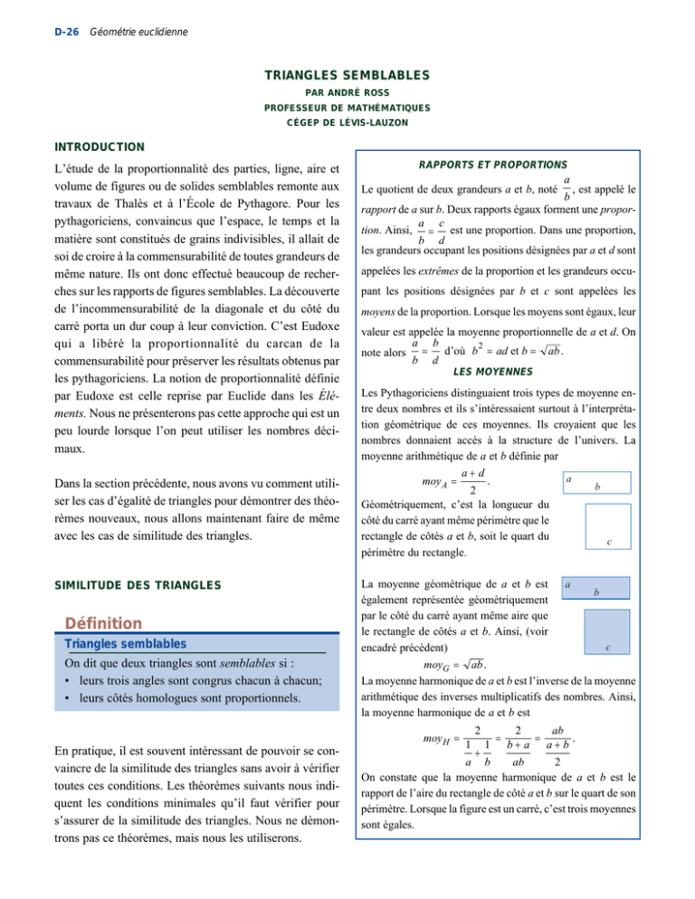 D-26 Géométrie euclidienne TRIANGLES SEMBLABLES PAR ANDRÉ ROSS PROFESSEUR DE MATHÉMATIQUES CÉGEP DE LÉVIS-LAUZON INTRODUCTION L’étude de la proportionnalité des parties, ligne, aire et volume de figures ou de solides semblables remonte aux travaux de Thalès et à l’École de Pythagore. Pour les pythagoriciens, convaincus que l’espace, le temps et la matière sont constitués de grains indivisibles, il allait de soi de croire à la commensurabilité de toutes grandeurs de même nature. Ils ont donc effectué beaucoup de recherches sur les rapports de figures semblables. La découverte de l’incommensurabilité de la diagonale et du côté du carré porta un dur coup à leur conviction. C’est Eudoxe qui a libéré la proportionnalité du carcan de la commensurabilité pour préserver les résultats obtenus par les pythagoriciens. La notion de proportionnalité définie par Eudoxe est celle reprise par Euclide dans les Éléments. Nous ne présenterons pas cette approche qui est un peu lourde lorsque l’on peut utiliser les nombres décimaux. Dans la section précédente, nous avons vu comment utiliser les cas d’égalité de triangles pour démontrer des théorèmes nouveaux, nous allons maintenant faire de même avec les cas de similitude des triangles. SIMILITUDE DES TRIANGLES Définition Triangles semblables On dit que deux triangles sont semblables si : • leurs trois angles sont congrus chacun à chacun; • leurs côtés homologues sont proportionnels. En pratique, il est souvent intéressant de pouvoir se convaincre de la similitude des triangles sans avoir à vérifier toutes ces conditions. Les théorèmes suivants nous indiquent les conditions minimales qu’il faut vérifier pour s’assurer de la similitude des triangles. Nous ne démontrons pas ce théorèmes, mais nous les utiliserons. RAPPORTS ET PROPORTIONS Le quotient de deux grandeurs a et b, noté a , est appelé le b rapport de a sur b. Deux rapports égaux forment une propora c tion. Ainsi, = est une proportion. Dans une proportion, b d les grandeurs occupant les positions désignées par a et d sont appelées les extrêmes de la proportion et les grandeurs occupant les positions désignées par b et c sont appelées les moyens de la proportion. Lorsque les moyens sont égaux, leur valeur est appelée la moyenne proportionnelle de a et d. On a b 2 note alors = d’où b = ad et b = ab . b d LES MOYENNES Les Pythagoriciens distinguaient trois types de moyenne entre deux nombres et ils s’intéressaient surtout à l’interprétation géométrique de ces moyennes. Ils croyaient que les nombres donnaient accès à la structure de l’univers. La moyenne arithmétique de a et b définie par a+d a moy A = . b 2 Géométriquement, c’est la longueur du côté du carré ayant même périmètre que le rectangle de côtés a et b, soit le quart du c périmètre du rectangle. La moyenne géométrique de a et b est également représentée géométriquement par le côté du carré ayant même aire que le rectangle de côtés a et b. Ainsi, (voir encadré précédent) a b c moyG = ab . La moyenne harmonique de a et b est l’inverse de la moyenne arithmétique des inverses multiplicatifs des nombres. Ainsi, la moyenne harmonique de a et b est moy H = 2 1 1 = 2 ab = . b+a a+b + a b ab 2 On constate que la moyenne harmonique de a et b est le rapport de l’aire du rectangle de côté a et b sur le quart de son périmètre. Lorsque la figure est un carré, c’est trois moyennes sont égales. Triangles semblables D-27 Théorème 10 Premier cas de similitude des triangles Deux triangles sont semblables lorsqu’ils ont deux angles égaux chacun à chacun. C B A' A Lorsqu’on veut démontrer que des segments de droite dans une figure géométrique sont proportionnels, on cherche s’il est possible de construire des triangles semblables dont ces segments de droite sont des côtés. C' Théorème 14 B' Théorème de Thalès Lorsque dans un triangle on trace une droite parallèle à un des côtés du triangle, on détermine un deuxième triangle semblable au premier. Théorème 11 Deuxième cas de similitude des triangles Deux triangles sont semblables lorsqu’ils ont un angle égal adjacent à deux côtés homologues proportionnels. C C' B' B A' A AB A' B' = Démonstration Soit un triangle ABC. D’un point D situé sur le côté AB traçons la droite DE parallèle au côté BC . On forme alors un triangle ADE. Les triangles ABC et ADE sont semblables puisqu’ils ont deux angles congrus. (premier cas de similitude). AC A A A' C' D B Théorème 12 Troisième cas de similitude des triangles Deux triangles sont semblables lorsque leurs côtés homologues sont proportionnels. C B A' A AB A' B' = AC A' C' = C B α β δ E γ C En effet l’angle a est congru à l’angle b comme angles correspondants puisque BC et DE sont parallèles. De la même façon, l’angle g est congru à l’angle d comme C' angles correspondants. De plus l’angle BAC est commun aux deux triangles. B' ○ ○ ○ ○ ○ ○ ○ ○ ○ ○ ○ ○ ○ ○ ○ ○ ○ ○ ○ ○ ○ ○ ○ ○ ○ ○ BC B' C' SIMILITUDE ET HOMOTHÉTIE Théorème 13 Similitude de triangles rectangles Deux triangles rectangles sont semblables lorsqu’ils ont un angle aigu égal. C' C A' A B B' On peut construire un triangle semblable à un triangle ABC donné en prenant un point O à l’extérieur du triangle et en traçant les droites joignant le point O à chacun des sommets du triangle ABC. On trace alors les segments A' B' parallèlement à AB , A' C' parallèlement à AC et B' C' parallèlement à BC . Dans une telle construction, le point O est appelé centre d’homothétie. D-28 Géométrie euclidienne côtés BE et BC. On a donc : B' B BD O C C' DC = BA EA et, puisque EA = CA , on a BD DC = BA CA . ○ ○ ○ ○ ○ ○ ○ ○ ○ ○ ○ ○ ○ ○ ○ ○ ○ ○ ○ ○ ○ ○ ○ ○ ○ ○ A A' On constate que ce procédé de constru