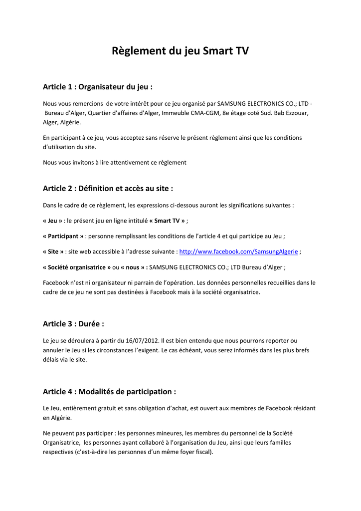 Règlement du jeu Smart TV Article 1 : Organisateur du jeu : Nous vous remercions de votre intérêt pour ce jeu organisé par SAMSUNG ELECTRONICS CO.; LTD ‐ Bureau d’Alger, Quartier d’affaires d’Alger, Immeuble CMA‐CGM, 8e étage coté Sud. Bab Ezzouar, Alger, Algérie. En participant à ce jeu, vous acceptez sans réserve le présent règlement ainsi que les conditions d’utilisation du site. Nous vous invitons à lire attentivement ce règlement Article 2 : Définition et accès au site : Dans le cadre de ce règlement, les expressions ci‐dessous auront les significations suivantes : « Jeu » : le présent jeu en ligne intitulé « Smart TV » ; « Participant » : personne remplissant les conditions de l’article 4 et qui participe au Jeu ; « Site » : site web accessible à l’adresse suivante : http://www.facebook.com/SamsungAlgerie ; « Société organisatrice » ou « nous » : SAMSUNG ELECTRONICS CO.; LTD Bureau d’Alger ; Facebook n’est ni organisateur ni parrain de l’opération. Les données personnelles recueillies dans le cadre de ce jeu ne sont pas destinées à Facebook mais à la société organisatrice. Article 3 : Durée : Le jeu se déroulera à partir du 16/07/2012. Il est bien entendu que nous pourrons reporter ou annuler le Jeu si les circonstances l’exigent. Le cas échéant, vous serez informés dans les plus brefs délais via le site. Article 4 : Modalités de participation : Le Jeu, entièrement gratuit et sans obligation d’achat, est ouvert aux membres de Facebook résidant en Algérie. Ne peuvent pas participer : les personnes mineures, les membres du personnel de la Société Organisatrice, les personnes ayant collaboré à l’organisation du Jeu, ainsi que leurs familles respectives (c’est‐à‐dire les personnes d’un même foyer fiscal). La participation se fera uniquement via Facebook. Votre participation ne sera validée qu’à condition que les étapes suivantes aient été complétées : ‐ ‐ Pour accéder au Jeu, vous devez vous connecter au site de Facebook, aimer la page Samsung Algérie et consulter la rubrique dédiée au Jeu dans laquelle l’ensemble des démarches à entreprendre pour votre inscription et votre participation seront expliquées. Vous devez accepter la demande de permission d’accès aux informations de l’utilisateur demandant l’autorisation pour : • Accéder aux informations de base de l’utilisateur (le nom, la photo du profil, le sexe, les réseaux, l’identifiant utilisateur, la liste d’amis et d'autres infos rendues publiques). • M’envoyer des messages électroniques. Article 5 : Concept, mécanique et lot : Article 5.1 : Principe du jeu : La société organisatrice propose un jeu sous forme d’application Facebook dans lequel les utilisateurs devront révéler une image masquée par des pixels qui devront être décochés au fur et à mesure pour dévoiler le cadeau mis en jeu. Les joueurs pourront au départ débloquer deux (2) pixels seulement et il leur faudra recommander l’application à leurs amis pour que deux (2) pixels supplémentaires soient débloqués sur la grille. Ainsi tous les participants dévoileront ensemble la grille au fur et à mesure jusqu’à ce qu’elle révèle entièrement le cadeau mis en jeu. Un tirage au sort sera effectué parmi les participants qui auront non seulement débloqué deux pixels mais en plus, auront recommandé l’application à leurs amis. Lorsqu’une première grille de pixels est dévoilée, les joueurs auront la possibilité de dévoiler une nouvelle grille qui cachera un nouveau cadeau mis en jeu. Article 5.2 : Sélection et gagnants : Les participants qui auront dévoilé deux pixels et recommandé l’application à leurs amis seront tirés au sort, l’un d’eux sera désigné comme gagnant et remportera le cadeau révélé par la grille. Article 5.3 : Remise du lot : Les gagnants seront contactés par un e‐mail les informant de leur gain et de la date et modalités de remise des cadeaux. Article 6 : Témoignages et créations : Vous pourrez être invité à remplir un questionnaire afin de nous témoigner vos impressions sur le Jeu et/ou le lot attribué. Dans ce cas, vous nous autorisez gratuitement à reproduire, représenter, modifier, adapter (notamment traduire), transférer et distribuer le témoignage que vous nous aurez communiqué. Cette autorisation est valable un an à compter de l’enregistrement de votre témoignage via le Site et pour tout type de support (audiovisuel, presse, internet, etc.). Article 7 : Données à caractère personnel : Toute personne inscrite sur le Site bénéficie d'un droit d'accès, de rectification, d’opposition et de radiation des données la concernant. Pour exercer ce droit, il vous suffit d’adresser un courrier électronique, en justifiant de votre identité à l’adresse suivante : [email protected] Les personnes qui exerceront le droit de suppression de leurs données avant le résultat final du jour seront réputées renoncer à leur participation. Enfin, tous les gagnants du Jeu autorisent Samsung Algérie à gratuitement reproduire, représenter, modifier, adapter (notamment traduire), transférer et distribuer le témoignage que vous nous aurez communiqué, et ce pour une durée illimitée. Article 8 : Responsabilité : La participation à ce jeu implique l'acceptation sans réserve du règlement dans son intégralité. Toute déclaration inexacte ou mensongère, toute fraude entraînera la disqualification du participant. La société organisatrice tranchera souverainement tout litige relatif au jeu et à son règlement. En cas de force majeure, La société Samsung Algérie se réserve le droit pour quelque raison que ce soit, de prolonger, annuler, suspendre ou écourter le présent jeu dans le respect de l’article 7.