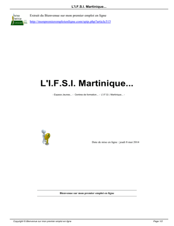 L'I.F.S.I. Martinique... Extrait du Bienvenue sur mon premier emploi en ligne http://monpremieremploienligne.com/spip.php?article315 L'I.F.S.I. Martinique... - Espace Jeunes... - Centres de formation... - L'I.F.S.I. Martinique... - Date de mise en ligne : jeudi 8 mai 2014 Bienvenue sur mon premier emploi en ligne Copyright © Bienvenue sur mon premier emploi en ligne Page 1/2 L'I.F.S.I. Martinique... Institut de Formation en Soins Infirmiers (IFSI) du Centre Hospitalier Universitaire de Martinique Post-scriptum : Source vidéo : Mag 300° pour la formation de l'Agefma Copyright © Bienvenue sur mon premier emploi en ligne Page 2/2