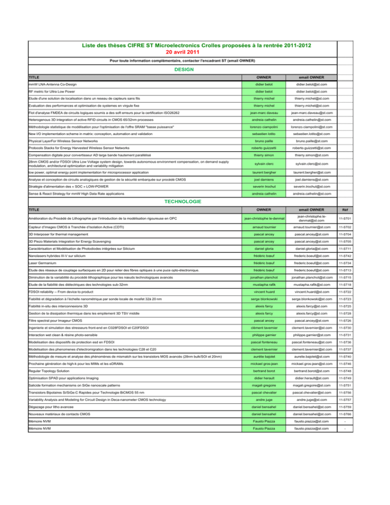 Liste des thèses CIFRE ST Microelectronics Crolles proposées à la rentrée 2011-2012 20 avril 2011 Pour toute information complémentaire, contacter l'encadrant ST (email OWNER) DESIGN TITLE OWNER email OWNER mmW LNA-Antenna Co-Design didier belot [email protected] RF metric for Ultra Low Power Etude d'une solution de localisation dans un reseau de capteurs sans fils Evaluation des performances et optimisation de systemes en virgule fixe Flot d'analyse FMDEA de circuits logiques soumis a des soft erreurs pour la certification ISO26262 Heterogenous 3D integration of active RFID circuits in CMOS 65/32nm processes Méthodologie statistique de modélisation pour l'optimisation de l'offre SRAM "basse puissance" New I/O implementation scheme in matrix: conception, automation and validation Physical LayerFor Wireless Sensor Networks didier belot [email protected] thierry michel [email protected] thierry michel [email protected] jean-marc daveau [email protected] andreia cathelin [email protected] lorenzo ciampolini [email protected] sebastien lotito [email protected] bruno paille [email protected] roberto guizzetti [email protected] Compensation digitale pour convertisseur AD large bande hautement parallélisé thierry simon [email protected] 28nm CMOS and/or FDSOI Ultra Low Voltage system design, towards autonomous environment compensation, on demand supply modulation, architectural optimization and variability mitigation sylvain clerc [email protected] laurent bergher [email protected] Protocols Stacks for Energy Harvested Wireless Sensor Networks low power, optimal energy point implementation for microprocessor application Analyse et conception de circuits analogiques de gestion de la sécurité embarquée sur procédé CMOS Stratégie d'alimentation des « SOC » LOW-POWER Sense & React Strategy for mmW High Data Rate applications joel damiens [email protected] severin trochut [email protected] andreia cathelin [email protected] TECHNOLOGIE TITLE Amélioration du Procédé de Lithographie par l’introduction de la modélisation rigoureuse en OPC Capteur d’Images CMOS à Tranchée d’Isolation Active (CDTI) OWNER email OWNER Réf jean-christophe le-denmat [email protected] 11-ST01 arnaud tournier [email protected] 11-ST02 3D Interposer for thermal management pascal ancey [email protected] 11-ST04 3D Piezo Materials Integration for Energy Scavenging pascal ancey [email protected] 11-ST05 Caractérisation et Modélisation de Photodiodes intégrées sur Silicium daniel gloria [email protected] 11-ST11 Nanolasers hybrides III-V sur silicium frédéric bœuf [email protected] 11-ST42 Laser Germanium frédéric bœuf [email protected] 11-ST34 Etude des réseaux de couplage surfaciques en 2D pour relier des fibres optiques à une puce opto-électronique. frédéric bœuf [email protected] 11-ST13 jonathan planchot [email protected] 11-ST15 mustapha rafik [email protected] 11-ST18 vincent huard [email protected] 11-ST22 serge blonkowski [email protected] 11-ST23 Fiabilité in-situ des interconnexions 3D alexis farcy [email protected] 11-ST25 Gestion de la dissipation thermique dans les empilement 3D TSV middle alexis farcy [email protected] 11-ST28 pascal ancey [email protected] 11-ST26 clément tavernier [email protected] 11-ST30 philippe garnier [email protected] 11-ST31 Modelisation des dispositifs de protection esd en FDSOI pascal fonteneau [email protected] 11-ST36 Modelisation des phenomenes d'electromigration dans les technologies C28 et C20 clement tavernier [email protected] 11-ST37 aurélie bajolet [email protected] 11-ST40 mickael gros-jean [email protected] 11-ST46 bertrand borot [email protected] 11-ST48 didier herault [email protected] 11-ST49 Salicide formation mechanisms on SiGe nanoscale patterns magali gregoire [email protected] 11-ST51 Transistors Bipolaires Si/SiGe:C Rapides pour Technologie BiCMOS 55 nm pascal chevalier [email protected] 11-ST56 andre juge [email protected] 11-ST57 Dégazage pour litho avancee daniel bensahel [email protected] 11-ST59 Nouveaux matériaux de contacts CMOS daniel bensahel [email protected] 11-ST66 Mémoire NVM Fausto Piazza [email protected] - Mémoire NVM Fausto Piazza [email protected] - Diminution de la variabilité du procédé lithographique pour les nœuds technologiques avancés Etude de la fiabilité des diélectriques des technologies sub-32nm FDSOI reliability -- From device to product Fiabilité et dégradation à l’échelle nanométrique par sonde locale de mosfet 32à 20 nm Filtre spectral pour Imageur CMOS Ingenierie et simulation des stresseurs front-end en C028FDSOI et C20FDSOI Interaction wet clean & résine photo-sensible Méthodologie de mesure et analyse des phénomènes de mismatch sur les transistors MOS avancés (28nm bulk/SOI et 20nm) Prochaine génération de high-k pour les MIMs et les eDRAMs Regular Topology Solution Optimisation SPAD pour applications Imaging Variability Analysis and Modeling for Circuit Design in Deca-nanometer CMOS technology
