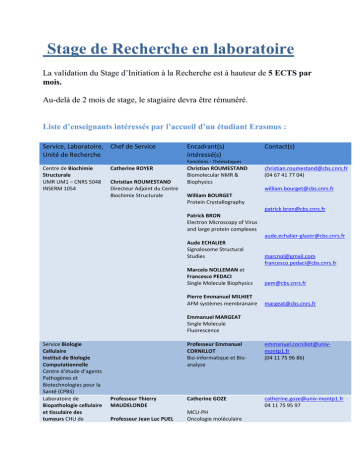 Stage de Recherche en laboratoire La validation du Stage d’Initiation à la Recherche est à hauteur de 5 ECTS par mois. Au-delà de 2 mois de stage, le stagiaire devra être rémunéré. Liste d’enseignants intéressés par l’accueil d’un étudiant Erasmus : Service, Laboratoire, Chef de Service Unité de Recherche Encadrant(s) intéressé(s) Contact(s) Fonctions - Thématiques Centre de Biochimie Structurale UMR UM1 – CNRS 5048 INSERM 1054 Catherine ROYER Christian ROUMESTAND Directeur Adjoint du Centre Biochimie Structurale Christian ROUMESTAND Biomolecular NMR & Biophysics [email protected] (04 67 41 77 04) [email protected] William BOURGET Protein Crystallography [email protected] Patrick BRON Electron Microscopy of Virus and large protein complexes [email protected] Aude ECHALIER Signalosome Structural Studies [email protected] [email protected] Marcelo NOLLEMAN et Francesco PEDACI Single Molecule Biophysics [email protected] Pierre Emmanuel MILHIET AFM systèmes membranaire [email protected] Emmanuel MARGEAT Single Molecule Fluorescence Service Biologie Cellulaire Institut de Biologie Computationnelle Centre d’étude d’agents Pathogènes et Biotechnologies pour la Santé (CPBS) Laboratoire de Biopathologie cellulaire et tissulaire des tumeurs CHU de Professeur Thierry MAUDELONDE Professeur Jean Luc PUEL Professeur Emmanuel CORNILLOT Bio-informatique et Bioanalyse [email protected] (04 11 75 96 86) Catherine GOZE [email protected] 04 11 75 95 97 MCU-PH Oncologie moléculaire Montpellier (recherche de marqueurs moléculaires tumoraux prédictifs de réponse à la chimiothérapie ou marqueurs à valeur pronostique), pharmacogénétique des agents anticancéreux Thème spécifique de recherche : marqueurs moléculaires pour le traitement personnalisé des tumeurs cérébrales Institut des Neurosciences de Montpellier – INSERM U1051 Service Chimie Analytique Bromatologie Professeur Michel LARROQUE Michel LARROQUE Professor – Analyse des aliments Delphine MARGOUT Analyse des aliments Service Chimie Thérapeutique (Medicinal Chemistry Department) Service de chimie thérapeutique : Professeur Vincent LISOWSKI Institut des Biomolécules MaxMousseron Institut des Biomolécules Max-Mousseron : Professeur Jean MARTINEZ Vincent LISOWSKI Nicolas MASURIER Maître de Conférence – Conception et synthèse d’inhibiteurs de protéases impliquées dans le cancer [email protected] (04 11 75 95 89) [email protected] [email protected] (04 11 75 95 99) [email protected] (04 11 75 96 42) Ludovic MAILLARD Jean-François HERNANDEZ Tous les encadrants de l’institut Institut des Biomolécules Max Mousseron Institut des Biomolécules Max-Mousseron : Professeur Jean MARTINEZ Laboratoire de Droit et Economie de la Santé UMR 5815 Dynamiques du Droit Professeur Cécile Le Gal Fontes Virginie RAGE ANDRIEU MCU – Thèmes de Droit comparé dans l’UE relatifs au médicament, aux autres produites de santé et aux compléments alimentaires : fixation du prix, remboursement, monopoles, circuit du médicament et des produits de santé en ville, en milieu hospitalier, publicité des produits de santé… Service Pharmacie Galénique Professeur Jean-Marie DEVOISSELLE [email protected] (04 11 75 94 40) Sylvie BEGU Associate-Professor - Design of si-RNA-loaded polymer micelles for auto immune diseases Institut Charles Gerhardt, UMR 5253 (www.icgm.fr) Anne AUBERT-POUESSEL [email protected] Sylvie CORNEILLE [email protected] [email protected] (04 11 75 94 03) [email protected] (04 75 94 40 43) [email protected] (04 75 94 40 42) Equipe Matériaux Avancés pour la Catalyse et la Santé (MACS) Associate-Professor – Design of nanoparticles for ecotoxicological issues [email protected] (04 75 94 40 45) Philippe LEGRAND Professor – Nanoparticles for cancer therapy [email protected] (04 75 94 40 48) Marie MORILLE Associate-Professor – Microspheres for cell différenciation and régénérative médicine [email protected] (04 75 94 40 52) [email protected] (04 75 94 40 49) Corinne TOURNE-PETEILH Engineer – Design of nanotechnology-based drug delivery systems for controlled release Joël CHOPINEAU Professor – Design of biomimetic materials for membrane protein functions Gérard CROS Professeur de Pharmacologie Laboratoire de Pharmacologie et Physiopathologie Expérimentales [email protected] (04 11 75 95 05) Institut des Biomolécules Max Mousseron Laboratoire de Biopolymères Artificiels Jean COUDANE IBMM – UMR5247 Mots Clés : Biomatériaux, Biocompatibilité, Polymères dégradables, Libération contrôlée de principes actifs, Dispositifs médicaux Laboratoire de Toxicologie IBMM : Professeur Jean MARTINEZ Institut des Biomolécules Max Mousseron IBMM, UMR 5247 Laboratoire de Toxicologie : Professeur Pierre CUQ Benjamin NOTTELET MCU, Polymères Dégradables Fonctionnels pour applications en Santé Hélène VAN DEN BERGHE MCU, Polymères Dégradables Fonctionnels pour applications en Santé Vincent DARCOS Ingénieur CNRS, Polymères Dégradables Fonctionnels pour Applications en Santé Pierre CUQ Professeur – Oncopharmacologie. Etude des mécanismes moléculaires de résistance tumorale aux anticancéreux [email protected] (04 11 75 97 11) [email protected] (04 11 75 97 11) [email protected] (04 11 75 97 04) [email protected] (04 11 75 97 46)