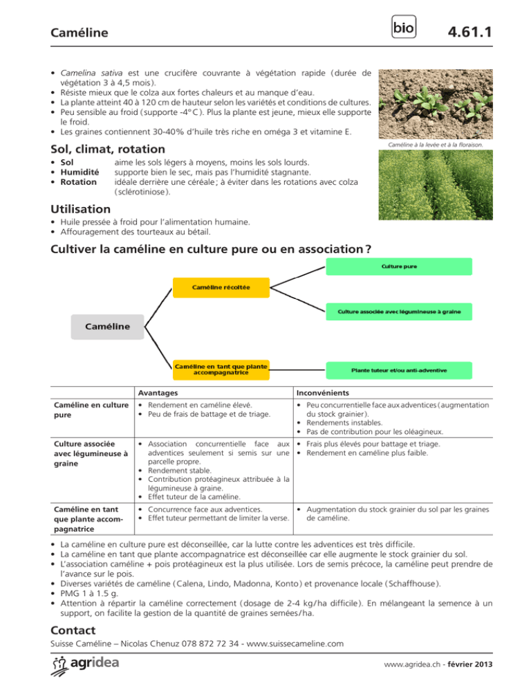 4.61.1 Caméline • Camelina sativa est une crucifère couvrante à végétation rapide ( durée de végétation 3 à 4,5 mois ). • Résiste mieux que le colza aux fortes chaleurs et au manque d’eau. • La plante atteint 40 à 120 cm de hauteur selon les variétés et conditions de cultures. • Peu sensible au froid ( supporte -4° C ). Plus la plante est jeune, mieux elle supporte le froid. • Les graines contiennent 30-40% d’huile très riche en oméga 3 et vitamine E. Caméline à la levée et à la floraison. Sol, climat, rotation • Sol • Humidité • Rotation aime les sols légers à moyens, moins les sols lourds. supporte bien le sec, mais pas l’humidité stagnante. idéale derrière une céréale ; à éviter dans les rotations avec colza ( sclérotiniose ). Utilisation • Huile pressée à froid pour l’alimentation humaine. • Affouragement des tourteaux au bétail. Cultiver la caméline en culture pure ou en association ? Avantages Inconvénients Caméline en culture pure • Rendement en caméline élevé. • Peu de frais de battage et de triage. • Peu concurrentielle face aux adventices ( augmentation du stock grainier ). • Rendements instables. • Pas de contribution pour les oléagineux. Culture associée avec légumineuse à graine • Association concurrentielle face aux • Frais plus élevés pour battage et triage. adventices seulement si semis sur une • Rendement en caméline plus faible. parcelle propre. • Rendement stable. • Contribution protéagineux attribuée à la légumineuse à graine. • Effet tuteur de la caméline. Caméline en tant que plante accompagnatrice • Concurrence face aux adventices. • Augmentation du stock grainier du sol par les graines • Effet tuteur permettant de limiter la verse. de caméline. • La caméline en culture pure est déconseillée, car la lutte contre les adventices est très difficile. • La caméline en tant que plante accompagnatrice est déconseillée car elle augmente le stock grainier du sol. • L’association caméline + pois protéagineux est la plus utilisée. Lors de semis précoce, la caméline peut prendre de l’avance sur le pois. • Diverses variétés de caméline ( Calena, Lindo, Madonna, Konto ) et provenance locale ( Schaffhouse ). • PMG 1 à 1.5 g. • Attention à répartir la caméline correctement ( dosage de 2-4 kg / ha difficile ). En mélangeant la semence à un support, on facilite la gestion de la quantité de graines semées / ha. Contact Suisse Caméline – Nicolas Chenuz 078 872 72 34 - www.suissecameline.com www.agridea.ch - février 2013 4.61.2Caméline Itinéraire cultural Culture pure de caméline Culture associée de caméline et de pois protéagineux • Travailler sur des parcelles propres. Renoncer aux parcelles avec une forte présence d’adventices ( caméline très peu concurrentielle ! ). • Effectuer un faux semis. • Lit de semences bien nivelé et plutôt fin. Date de semis • Mars à mai. • Mi-février à fin mars ( période de semis du pois ). Densité de semis • 3-4 kg / ha. • Caméline : –– si semis avant 1er mars : 2-2.5 kg / ha ; –– si semis entre 1er et 15 mars : 2.5-3.5 kg / ha ; –– si semis après 15 mars : 3-4 kg / ha ; –– si semis en conditions difficiles : +20% • Pois : 80-100 grains / m2 (80-100% de la densité normale ). Profondeur de • En surface. • Caméline : en surface. semis • Pois : 3-4 cm. Interligne • A la volée. • Caméline : à la volée. • 12-20 cm possible, mais • Pois : 12-20 cm. déconseillé en raison du désherbage difficile. Technique de • Semis à la volée (par ex. se- • La technique de semis dépend du matériel disponible. semis moir monté sur un rouleau • Semer les 2 cultures en même temps : Krummenacher). –– semoir muni de 2 trémies indépendantes ( pour semer chaque • Roulage après semis. espèce aux bonnes densité et profondeur ) ; –– demande un système de distribution précis de la trémie où se trouve la caméline. • Semer les 2 cultures séparemment : –– installation le même jour ; –– d’abord le pois, puis la caméline ( par ex. avec semoir monté sur un rouleau Krummenacher ) ; –– ou d’abord la caméline en surface, puis le pois et couverture des semences de caméline par la herse du semoir. • Roulage après semis pour la caméline. Désherbage • Aucun désherbage mécanique envisageable ( la herse-étrille déracine la caméline ! ). • Si nécessaire, désherbage manuel pour les chardons, rumex, chénopodes, etc. Fumure • Peu exigeante, évent. 10-20 t compost / ha. Moment de récolte • Au dessèchement des siliques. • Lorsque le pois est mûr ( la caméline ne s’égraine pas à maturité ). Régalge batteuse • Comme pour la luzerne. • Régler pour pois et surveiller les pertes en caméline. Si trop de pertes, baisser la ventilation. • Préférer un peu de perte de caméline plutôt qu’un taux de charge très élevé dans la trémie. Triage • Triage dans un centre col- • 1er tri au centre collecteur : nettoyage du pois, récupération de la lecteur spécialement équipé caméline et des déchets. pour séparer la caméline des • 2e tri dans centre collecteur spécialement équipé pour séparer la déchets. caméline des déchets. • Frais de triage : 20.- / dt de graines triées. Rendement • 10-22 dt / ha. • Caméline : très variable selon les conditions et l’année, de 2 à 15 dt / ha ( en moyenne 4-7 dt / ha ). • Pois : 30 dt / ha si rapport pois / caméline au semis idéal. Travail après • Ne pas déchaumer directement après récolte ! récolte 1. Laisser germer la caméline. 2. Eventuellement, gratter superficiellement le sol dès que la caméline a commencé de germer pour faire germer le reste des graines et détruire celles déjà germées. 3. Détruire la caméline par labour ou déchaumages successifs lorsqu’elle a bien germé. Conservation Stockage à 8% d