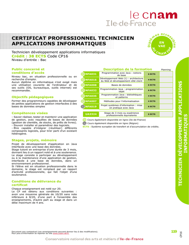 Crédit : 38 ECTS Code CP16 s DF AU EN VAE CN Technicien développement applications informatiques acce bles Di plô es si CERTIFICAT PROFESSIONNEL TECHNICIEN APPLICATIONS INFORMATIQUES m AM I Niveau d’entrée : Bac Description de la formation NFA031 Programmation avec Java : notions de base 6 ECTS NFA016 Développement Web (1) : architecture du Web et développement côté client 4 ECTS NFA008 Bases de données 6 ECTS NFA032 Programmation Java : programmation objet 6 ECTS Objectifs pédagogiques NFA035 Programmation Java : bibliothèques et patterns 4 ECTS Former des programmeurs capables de développer de petites applications de gestion interfacées à des bases de données simples NFA007 Méthodes pour l'informatisation 4 ECTS NFA019 Projet systèmes d'information : mise en pratique avec Java 6 ECTS UA3324 Stage de 3 mois ou expérience professionnelle équivalente 6 ECTS Niveau bac, en situation professionnelle ou en recherche d’emploi. Aucun diplôme en informatique n’est exigé mais une utilisation courante de l’ordinateur et de ses outils (OS, bureautique, outils internet) est recommandée. Compétences visées - Savoir réaliser, tester et maintenir une application de gestion, avec requêtes de bases de données (gestion de clientèle, de stocks, de prêts de livres). - Pouvoir installer et paramétrer des logiciels. - Être capable d’intégrer (réutiliser) différents composants logiciels, pour tirer parti d’un existant hétérogène. Cours également disponible en ligne (Ile-de-France) Cours également disponible en ligne (Région) ECTS : S ystème européen de transfert et d’accumulation de crédits. Stages, projets, mémoire Projet de développement d’application en Java interfacée avec une base des données. Stage tutoré en entreprise d’une durée de 3 mois, donnant lieu à un rapport noté et à une soutenance. Le stage consiste à participer au développement ou à la maintenance d’une application de gestion, interfacée à une base de données, dans un environnement professionnel. Si l’élève est en situation professionnelle dans le domaine, le stage est remplacé par un rapport d’activité professionnelle, qui fait l’objet d’une soutenance. Conditions de délivrance du certificat Planning TECHNICIEN DÉVELOPPEMENT APPLICATIONS INFORMATIQUES Public concerné et conditions d’accès Document non contractuel (ces renseignements peuvent donner lieu à des modifications). Pour plus d’information se reporter au site www.cnam-idf.fr. Conservatoire national des arts et métiers d’Ile-de-France 119 CP16 Chaque enseignement est noté sur 20. Le CP est obtenu aux conditions suivantes : avoir une moyenne générale de 10/20 sans note inférieure à 8/20, d’une part à l’ensemble des enseignements, d’autre part au stage et dans un délai maximum de 4 ans. Conservatoire national des arts et métiers d’Ile-de-France NFA031 - Programmation avec Java : notions de base Crédits : 6 ECTS Public concerné et conditions d’accès Niveau bac en mathématiques, ainsi qu’une maîtrise minimale de l’utilisation d’un ordinateur et d’internet. Objectifs pédagogiques Acquérir les principaux concepts de base de la programmation ainsi qu’une connaissance pratique de la réalisation de programmes en JAVA. Contenu de la formation • Introduction à la notion d’application et de programme informatique. • Aperçu des différents langages de programmation. • Notions de syntaxe, de sémantique et de compilation. • Types de base, types tableaux. • Références et affectation. • Entrées-sorties. • Structures de contrôle (conditionnelles et boucles). • Sous programmes (fonctions, procédures ou méthodes). • Mise en oeuvre de quelques algorithmes fondamentaux. • Illustrations par de nombreux exemples. NFA016 - Développement Web (1) : architecture du Web et développement côté client Crédits : 4 ECTS Public concerné et conditions d’accès Avoir le niveau des cours algorithmique programmation 1, réseau, base de données de premier cycle. Objectifs pédagogiques : Dresser un tableau complet de l’architecture du WEB et des technologies concernées dans la construction d’un site. Apprendre les langages mis en oeuvre coté client. Contenu de la formation - Introduction générale. Architecture du web. Internet, intranet. notion de client (navigateur) et de serveur. L’hypertexte, lien et URL. Notion de normes et problèmes de validation, le W3C. - Description et structuration des documents web: le langage (X)HTML - Gestion de la présentation des documents: les feuilles de style CSS. - Notion de protocole: illustration rapide avec les protocoles SMTP, POP puis présentation plus détaillée du protocole HTTP - Les formulaires et très brève introduction au traitement des formulaires coté serveur cgi/php. (La programmation dynamique coté serveur sera vu en détail dans l’UE NFA017 ) - Le dynamisme coté client avec le langage Javascript : présentation générale du langage, gestion des évènements, vérification et traitement de formulaire cote client, présentation du DOM, innerHTML... - Javascript avancé (regexp, objets...) - Quelques spécificités HTML5 et gestions des API Javascript - Brève introduction aux notions d’ergonomie et d’accessibilité et a la présentation sur différents supports (netbook, smartphone...) - Très brève introduction aux problèmes de sécurité. NFA008 - Bases de données Crédits : 6 ECTS Objectifs pédagogiques NFA007 - Méthodes pour l’informatisation Crédits : 4 ECTS Concevoir, mettre en oeuvre et utiliser les bases de données relationnelles, en particulier savoir définir un schéma relationnel par une démarche conceptuelle et maîtriser le langage SQL. Objectifs pédagogiques Contenu de la formation Contenu de la formation • Conception et spécification de schémas relationnels - Introduction aux bases de donnée relationnelles - Le modèle entité/association : Pr