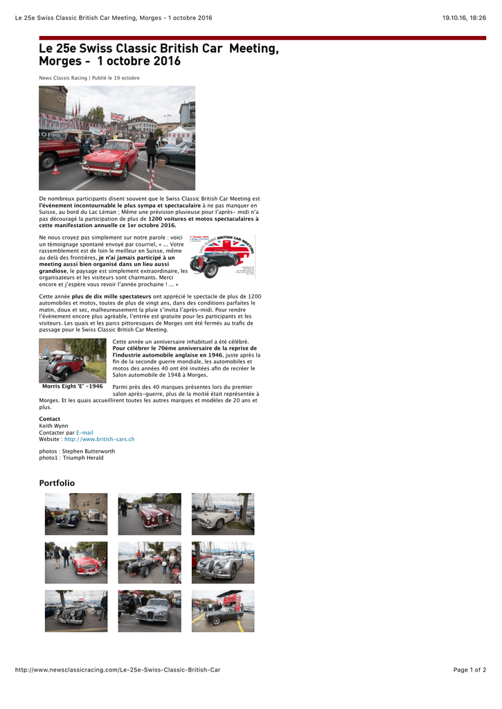 Le 25e Swiss Classic British Car Meeting, Morges - 1 octobre 2016 19.10.16, 18)26 News Classic Racing | Publié le 19 octobre De nombreux participants disent souvent que le Swiss Classic British Car Meeting est l’événement incontournable le plus sympa et spectaculaire à ne pas manquer en Suisse, au bord du Lac Léman ; Même une prévision pluvieuse pour l’après- midi n’a pas découragé la participation de plus de 1200 voitures et motos spectaculaires à cette manifestation annuelle ce 1er octobre 2016. Ne nous croyez pas simplement sur notre parole : voici un témoignage spontané envoyé par courriel, « ... Votre rassemblement est de loin le meilleur en Suisse, même au delà des frontières, je n’ai jamais participé à un meeting aussi bien organisé dans un lieu aussi grandiose, le paysage est simplement extraordinaire, les organisateurs et les visiteurs sont charmants. Merci encore et j’espère vous revoir l’année prochaine ! ... » Cette année plus de dix mille spectateurs ont apprécié le spectacle de plus de 1200 automobiles et motos, toutes de plus de vingt ans, dans des conditions parfaites le matin, doux et sec, malheureusement la pluie s’invita l’après-midi. Pour rendre l’événement encore plus agréable, l’entrée est gratuite pour les participants et les visiteurs. Les quais et les parcs pittoresques de Morges ont été fermés au trafic de passage pour le Swiss Classic British Car Meeting. Cette année un anniversaire inhabituel a été célébré. Pour célébrer le 70ème anniversaire de la reprise de l’industrie automobile anglaise en 1946, juste après la fin de la seconde guerre mondiale, les automobiles et motos des années 40 ont été invitées afin de recréer le Salon automobile de 1948 à Morges. Morris Eight ’E’ -1946 Parmi près des 40 marques présentes lors du premier salon après-guerre, plus de la moitié était représentée à Morges. Et les quais accueillirent toutes les autres marques et modèles de 20 ans et plus. Contact Keith Wynn Contacter par E-mail Website : http://www.british-cars.ch photos : Stephen Butterworth photo1 : Triumph Herald Portfolio http://www.newsclassicracing.com/Le-25e-Swiss-Classic-British-Car Page 1 of 2 Le 25e Swiss Classic British Car Meeting, Morges - 1 octobre 2016 http://www.newsclassicracing.com/Le-25e-Swiss-Classic-British-Car 19.10.16, 18)26 Page 2 of 2