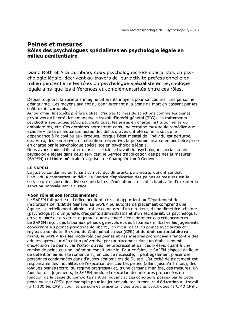 www.rechtspsychologie.ch (Psychoscope 2/2006) Peines et mesures Rôles des psychologues spécialistes en psychologie légale en milieu pénitentiaire Diane Roth et Ana Zumbino, deux psychologues FSP spécialistes en psychologie légale, décrivent au travers de leur activité professionnelle en milieu pénitentiaire les rôles du psychologue spécialiste en psychologie légale ainsi que les différences et complémentarités entre ces rôles. Depuis toujours, la société a imaginé différents moyens pour sanctionner une personne délinquante. Ces moyens allaient du bannissement à la peine de mort en passant par les châtiments corporels. Aujourd’hui, la société préfère utiliser d’autres formes de sanctions comme les peines privatives de liberté, les amendes, le travail d’intérêt général (TIG), les traitements psychothérapeutiques et/ou psychiatriques, les prises en charge institutionnelles ou ambulatoires, etc. Ces dernières permettent dans une certaine mesure de remédier aux «causes» de la délinquance, quand des délits graves ont été commis sous une dépendance à l’alcool ou aux drogues, lorsque l’état mental de l’individu est perturbé, etc. Ainsi, dès son arrivée en détention préventive, la personne incarcérée peut être prise en charge par le psychologue spécialiste en psychologie légale. Nous avons choisi d’illustrer dans cet article le travail du psychologue spécialiste en psychologie légale dans deux services: le Service d’application des peines et mesures (SAPFM) et l’Unité médicale à la prison de Champ-Dollon à Genéve. LE SAPEM La justice condamne en tenant compte des différents paramètres qui ont conduit l’individu à commettre un délit. Le Service d’application des peines et mesures est le service qui dispose des diverses modalités d’exécution citées plus haut, afin d’exécuter la sanction imposée par la justice. • Son rôle et son fonctionnement Le SAPFM fait partie de l’office pénitentiaire, qui appartient au Département des institutions de l’Etat de Genéve. Le SAPEM ou autorité de placement comprend une équipe essentiellement administrative composée d’un directeur, d’une directrice adjointe (psychologue), d’un juriste, d’adjoints administratifs et d’un secrétariat. La psychologue, en sa qualité de directrice adjointe, a une activité d’encadrement des collaborateurs. Le SAPEM reçoit des tribunaux pénaux genevois et des tribunaux militaires les jugements concernant les peines privatives de liberté, les mesures et les peines avec sursis et règles de conduite. En venu du Code pénal suisse (CPS) et du droit concordataire romand, le SAPEM fixe les modalités des peines et des mesures prononcées àl’encontre des adultes après leur détention préventive par un placement dans un établissement d’exécution de peine, par l’octroi du régime progressif et par des préavis quant à une remise de peine ou une libération conditionnelle. Pour ce faire, le SAPEM dispose de lieux de détention en Suisse romande et, en cas de nécessité, il peut également placer des personnes condamnées dans d’autres pénitenciers de Suisse. L’autorité de placement est responsable des modalités de l’exécution des courtes peines (allant jusqu’à 6 mois), des longues peines (octroi du régime progressif) et, d’une certaine manière, des mesures. En fonction des jugements, le SAPEM module l’exécution des mesures prononcées en fonction de la cause du comportement délinquant et des conditions posées par le Code pénal suisse (CPS): par exemple pour les jeunes adultes la mesure d’éducation au travail (art. 100 bis CPS), pour les personnes présentant des troubles psychiques (art. 43 CPS), pour les per sonnes présentant des problèmes d’alcoolisme ou de toxicomanie (art. 44 CPS). Enfin, le SAPEM gère et contrôle l’exécution des peines privatives de liberté avec sursis, dont la durée maximale est de 18 mois (règles de conduite au sens de l’art. 41 CPS). Les responsables de l’application des peines et des mesures effectuent régulièrement des audiences des personnes condamnées. La formation de psychologue facilite la mise en place d’une relation avec les personnes détenues, en ayant une attitude plus humaine, permettant d’être à l’écoute et d’apporter un soutien en cas de besoin. Cependant, l’autorité de placement, comme son nom l’indique, est principalement là afin de poser un cadre au sein duquel le détenu doit effectuer sa peine. «L’autorité» est un aspect essentiel dans l’activité du psychologue spécialiste en psychologie légale au sein d’un service placeur. • Les objectifs et les moyens La privation de liberté est une mise àl’écart de la société des personnes délinquantes. Néanmoins la prise en compte de paramètres éthiques est exigée. L’autorité de placement est également responsable du régime de détention et doit assurer le respect de la dignité humaine. Les conditions de détention doivent permettre aux condamnés un certain développement du sens des responsabilités, ainsi que l’acquisition de compétences dans le but d’une resocialisation. Le but est la réadaptation du condamné pour qu’il puisse être capable de mener, à sa sortie, une vie dans la légalité avec des outils lui permettant de subvenir à ses besoins. Lobjectif final est atteint si la récidive est évitée. Afin que les objectifs précédents soient atteints, les personnes condamnées à de longues peines privatives de liberté peuvent bénéficier d’un régime progressif dans l’exécution de leur peine. En d’autres termes, le régime progressif doit leur permettre d’apprendre un certain rythme de travail, de recevoir une formation professionnelle appropriée et d’entretenir des liens avec la famille, ceci par les autorisations de visites, de conduites, l’octroi de congés, de permissions, etc. En définitive, le ré