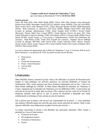 Compte-rendu de la réunion de l’Opération 7e jour qui s’est tenue au Rectorat de l’USJ le 16 février 2010 Etaient présents Grace Abi Rizk (FM), Soha Abdel Malak (HDF), Gloria Abdo (SS), Georges Aoun (Rectorat), Roland Aoun (SSP), Moustapha Asaad (CEULS), Michèle Asmar (IGSPS), Carla Abi Zeid (IPM), Henri Awaiss (ILT), Gaby Bterrany (CST), Liliane Buccianti Barakat (FLSH), Hilda Bayramian (FGM), René Chamussy s.j. (Recteur), Fadi Geara (ESIB), Philippe Fattal (IGE), Fadi Hindi (Comité de pilotage, administrateur CSM), Hyam Samaha Kahi (CUSFC), Krystel Khalil (Berytech), Nisrine Abdel Nour Lattouf (IPHY), Fouad Maroun (Service du sport, SG), Nada Farhat Mchayleh (Comité de pilotage, FMD), Paul Mattar (IESAV), Georges Melki (ISSR), Pascal Monin (FLSH), Joseph Nassar s.j. (Vice-recteur à l’administration), Nassib Nasr (fédération des Anciens), Jihad Renno (CSH), Toufic Rizk (Faculté des sciences), Sandrine Succar Sabbagh (Comité de pilotage, SPCOM), Joelle Seoud (FSI), Joseph Traboulsi (FSE), Maryse Tannous (Ecole sociale), Hayat Azouri Tannous (FP), Carmel Ghafari Wakim (SS), Garine Zohrabian (ILE, FSEDU), Dina Zouein (BAP) Lors de la réunion des représentants des Cellules de l’Opération 7e jour, le 16 février 2010 et du Pr. René Chamussy s.j, au Rectorat de l’USJ, les points suivants ont été discutés : • • • • • • Projet prison Haïti Forum des Entrepreneurs Projet : Junior-Entreprise Tour de table Divers I- Projet prison : Mme Michèle Asmar a annoncé qu’une visite a été effectuée à la prison de Roumieh pour étudier le volet juridique, les activités sportives, les activités théâtrales et l’aspect du médicament. Elle a aussi annoncé que deux réunions importantes ont eu lieu : l’une avec Mme Renée Sabbagh de UNODC et Mme Diane Mécattaf du ministère de l’Intérieur et l’autre, organisée par le ministère de l’Intérieur avec les différentes ONG et universités qui œuvrent au niveau de la santé dans la prison. Elle a précisé qu’une visite de la Faculté de médecine dentaire était prévue et que la prison de Roumieh a demandé une étude architecturale et technique d’une cuisine au sein de la prison. Elle a précisé que le projet a été envoyé aux responsables de la prison : « nous attendons une réponse officielle quant aux activités que nous serons autorisés de réaliser. Suite à cette réponse officielle, nous élaborerons un plan d’action par activité. » Le projet concernant la prison a été distribué aux personnes présentes. Mme Asmar a présenté les 4 axes d’intervention : • • • • Promotion de la santé Développement humain Formation et Information Projets 1 II- Haïti. M. Fadi Hindi a exposé le projet consistant à venir en aide à Haïti en récoltant des fonds à travers deux actions majeures : • Un concert le 15 mars à l’amphithéâtre Abou Khater du CSH • Des stands de vente de produits. Le stand consiste à mettre en place visuellement le matériel que nous pourrons acheter pour l’aide d’urgence à Haiti : montrer chaque article avec son prix. Les donateurs (étudiants, membres du personnel, visiteurs, enseignants,…) pourront acheter le matériel virtuellement. Les produits seront répartis selon 3 catégories : matériel de survie (sac de couchage, tente, habits, trousse de toilette, couverture, kleenex, etc.), matériel de premiers soins et médicaux, matériel de besoins primaires (boîte de conserve, eau, pain, etc.) Il a ensuite annoncé que les stands seront exposés les stands comme suit : 22 mars rectorat, 23 mars CSM, 24 mars CSH, 26 mars CSS, 29 mars HDF, 30 mars CST (A noter que le 25 mars, il n y aura aucune activité puisque ce sera probablement un jour de congé) III- Forum des Entrepreneurs Mme Gloria Abdo a annoncé que l’Opération 7e jour participera au forum des entrepreneurs organisé par Berytech au BIEL du 19 au 21 mai 2009. Un stand sera réservé à l’Opération 7e jour. IV- Projet : Junior-Entreprises Mme Krystel Khalil a présenté le concept de la Junior-Entreprise (JE) : • Entreprise/Association crée par l’université et gérée par des étudiants. • Prestations de services: études et projets pour des professionnels (réalisés par les étudiants), exemple: études marketing, sites web, logiciels… • Modèle de cabinet de conseil ou sociétés de services qui bénéficie de l'aide du milieu universitaire (suivi de projets, expertise…) Elle a précisé que l’accompagnement se fera en mettant un local mis à la disposition de la JE, en lui offrant une infrastructure bureautique ainsi que des conseils et la possibilité de suivre des formations. Selon elle, l’apport au niveau social d’une JE serait: • Encourager l’esprit d’entrepreneuriat au sein de l’USJ et renforcer l’esprit de responsabilité chez les étudiants • Impact positif sur l’économie à long terme • Investir le temps des étudiants dans des actions utiles et nécessaires à leur épanouissement personnel et professionnel. • Recruter parmi les étudiants un pourcentage de personnes handicapées. • Une part des bénéfices sera réservée aux activités sociales de l’O7 • Future génération d’entreprises qui inclura la Responsabilité sociale dans leur culture et leur stratégie Son plan d’action serait le suivant : • Lancer l’appel à la fondation de la JE auprès des étudiants de l’USJ • Faire appel aux étudiants qui sont déjà inscrits à l’O7 • Choisir le groupe des étudiants pour le démarrage (Recteur, Comité de pilotage et Berytech) 2 • • • Mettre en place la JE (règlement interne, système de travail, consultation, formation,…) Présenter la JE dans l’intervention de Monsieur Carlos Ghosn auprès des étudiants Présenter la JE dans le forum des entrepreneurs de Berytech. V- Tour de table Cellule Communication M. Pascal Monin a proposé d’inclure un article spécial Opération 7e jour