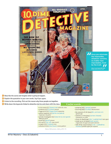 New Missions 2de p70-71 M for Mystery – Docs (S.Sabatini) 1 Imagine what happened and what is going to happen (doc p70) Fiche d’aide pour l’activité Elements to define : -Characters (names, background, how they are connected to each other) -The culprit and his/her motive -The action : before and after Useful words : A culprit An alibi A motive A clue An investigation To investigate The mystery A weapon A gun (to pull) The trigger The suspect Suspicious The criminal A crime A witness To kill To assassinate A murderer The evidence* The crime scene A set-up A police inspector An investigator, a detective To take part in To shoot somebody dead To take by surprise To be surprised Scared Puzzling / Puzzled Un coupable Un alibi Un mobile Un indice Une enquête Enquêter Le mystère Une arme Un pistolet (tirer/appuyer sur) La détente (d’un pistolet) Le suspect Suspicieux Le criminel Un crime Un témoin Tuer Assassiner Un meurtrier Les preuves Une scène de crime Un coup monté Un inspecteur de police Un enquêteur, un détective privé Participer à Tuer quelqu’un (en tirant) Prendre par surprise Etre surpris Effrayé Déconcertant / déconcerté ! Don’t forget to talk about hypothesis using : MAYBE / PERHAPS / PROBABLY ………………………………………………………………………………………………………………………………………………..…………………………. ………………………………………………………………………………………………………………………………………………..…………………………. ………………………………………………………………………………………………………………………………………………..…………………………. ………………………………………………………………………………………………………………………………………………..…………………………. M for Mystery – Docs (S.Sabatini) 2 ORAL UNDERSTANDING A DETECTIVE STORY WORKSHOP Introduction (-> “ready”) : Listen to the beginning of the recording. Pick out the reason why the people are together. ………………………………………………………………………………………………………………………………………………..…………………………. ………………………………………………………………………………………………………………………………………………..…………………………. ………………………………………………………………………………………………………………………………………………..…………………………. Now listen to the detective story : 1) Listen to the whole recording and pick out elements concerning… Group 1 Words about the house Group 2 Information about the characters Group 3 Words and expressions linked to detective stories 2) Now listen again : complete the following sentences with words taken from the list below and put them in chronological order. Is there anything surprising? Alibi – kitchen – door to door – upstairs – neighbour – dead – victim – gun – lipstick – lying dead a-he said the _______________________ did not wear make-up b-he said he’d be down in a minute c-the husband came home from work , and opened the front door d-that ___________________ was the murder weapon, left on the crime scene e-he went into the kitchen and found his wife ____________ on the floor f-he went ___________________________ to take a shower g-the woman had been _______________________for hours h-he heard his wife say “I’m in the ___________________” i-the wife was wearing perfect ________________and eye-shadow j-a _____________________ saw a woman selling door to door that day k-he was suspected but he had an ______________________ 3) Imagine what happened (complete the sentences) -the ___________________may have……………………………………………the wife = the victim may have been……………………………………………….……………….by………………………….……………………………. -the victim _______________________ the saleswoman she was not interested in make-up -the victim must have ____________________the door -the saleswoman may be a _____________________ -maybe the saleswoman knew the victim = she may ___________________ her M for Mystery – Docs (S.Sabatini) 3 EXERCICES LESSON 1 RECAP Le futur proche : Pour dire que l’on est sur le point de faire q.ch., on utilise : ………………………………………..…………………………………………. Pour dire que l’on va faire q.ch., on utilise : …………………………………………………………………………………….……………………… La probabilité : Pour préciser que l’on n’est pas sûr de qch., on peut utiliser les adverbes : ………………………….…………………………….., ……………………………………………………………………………….., ………………………………………………………………………………………… Si l’on veut exprimer une probabilité sur le passé, on utilisera la structure suivante : AUXILIAIRE …………………… / ……………………………… / ………………….…….. + HAVE + ……………………………………….…………….. A noter : BE LIKELY TO permet aussi d’exprimer une probabilité Ex : he’s likely to win = il est probable qu’il gagne, il va peut-être gagne, il risque de / il a des chances de gagner. BE BOUND TO exprime, lui, une très forte probabilité (donc une quasi-certitude) Ex : he’s bound to win = il va gagner, j’en suis certaine. 1.Lis les situations et réagis en form