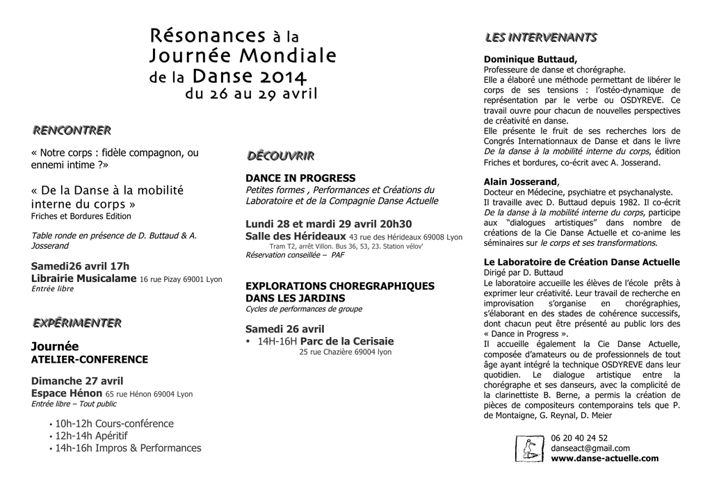 Résonances à la Journée Mondiale de la Danse 2014 du 26 au 29 avril RREEN NCCO ON NTTRREERR « Notre corps : fidèle compagnon, ou ennemi intime ?» « De la Danse à la mobilité interne du corps » Friches et Bordures Edition Table ronde en présence de D. Buttaud & A. Josserand Samedi26 avril 17h Librairie Musicalame 16 rue Pizay 69001 Lyon Entrée libre D DÉÉCCO OU UV VRRIIRR DANCE IN PROGRESS Petites formes , Performances et Créations du Laboratoire et de la Compagnie Danse Actuelle Lundi 28 et mardi 29 avril 20h30 Salle des Hérideaux 43 rue des Hérideaux 69008 Lyon Tram T2, arrêt Villon. Bus 36, 53, 23. Station vélov' Réservation conseillée – PAF EXPLORATIONS CHOREGRAPHIQUES DANS LES JARDINS Cycles de performances de groupe EEXXPPÉÉRRIIM MEEN NTTEERR Journée ATELIER-CONFERENCE Dimanche 27 avril Espace Hénon 65 rue Hénon 69004 Lyon Entrée libre – Tout public 10h-12h Cours-conférence • 12h-14h Apéritif • 14h-16h Impros & Performances Samedi 26 avril • 14H-16H Parc de la Cerisaie 25 rue Chazière 69004 lyon LLEESS IIN NTTEERRV VEEN NA AN NTTSS Dominique Buttaud, Professeure de danse et chorégraphe. Elle a élaboré une méthode permettant de libérer le corps de ses tensions : l’ostéo-dynamique de représentation par le verbe ou OSDYREVE. Ce travail ouvre pour chacun de nouvelles perspectives de créativité en danse. Elle présente le fruit de ses recherches lors de Congrés Internationnaux de Danse et dans le livre De la danse à la mobilité interne du corps, édition Friches et bordures, co-écrit avec A. Josserand. Alain Josserand, Docteur en Médecine, psychiatre et psychanalyste. Il travaille avec D. Buttaud depuis 1982. Il co-écrit De la danse à la mobilité interne du corps, participe aux “dialogues artistiques” dans nombre de créations de la Cie Danse Actuelle et co-anime les séminaires sur le corps et ses transformations. Le Laboratoire de Création Danse Actuelle Dirigé par D. Buttaud Le laboratoire accueille les élèves de l’école prêts à exprimer leur créativité. Leur travail de recherche en improvisation s’organise en chorégraphies, s’élaborant en des stades de cohérence successifs, dont chacun peut être présenté au public lors des « Dance in Progress ». Il accueille également la Cie Danse Actuelle, composée d’amateurs ou de professionnels de tout âge ayant intégré la technique OSDYREVE dans leur quotidien. Le dialogue artistique entre la chorégraphe et ses danseurs, avec la complicité de la clarinettiste B. Berne, a permis la création de pièces de compositeurs contemporains tels que P. de Montaigne, G. Reynal, D. Meier • 06 20 40 24 52 [email protected] www.danse-actuelle.com