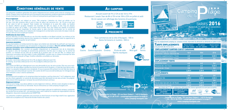 Conditions générales de vente Les présentes conditions générales font partie intégrante de tout contrat conclu entre le camping et ses clients. Chaque client reconnaît avoir pris connaissance des présentes conditions générales préalablement à toute réservation d’un séjour, pour lui–même et toute personne participant au séjour. Prix et règlement Le prix des séjours est indiqué en euros, TVA comprise. L’attention du client est attirée sur le fait que n’est pas comprise dans le prix la taxe de séjour par personne de + de 18 ans et par jour (à voir selon le tarif en vigueur). Toute location est nominative et ne peut être cédée. La location ne devient effective qu’après réception de l’acompte de 30% du séjour et des frais de dossier. Le solde du séjour est à régler 1 mois avant votre arrivée. Pour tout retard non signalé, la location/ l’emplacement devient disponible 24 heures après la date d’arrivée mentionnée sur le contrat de réservation. Passé ce délai, et en l’absence de message écrit, la réservation sera nulle et le séjour reste dû. Un seul véhicule sera accepté par location. Modification de réservation Aucune réduction ne sera effectuée en cas d’arrivée retardée ou de départ anticipé. Les visiteurs et les personnes supplémentaires devront être signalés à la réception, seront acceptés selon la capacité de la location et devront s’acquitter du tarif visiteur. Assurance annulation En cas d’annulation, le remboursement du séjour sera réalisé avec demande de justificatif par l’assureur ASSURIAL pour les locataires qui ont souscrits à l’assurance annulation. Pour les contrats réalisés sans assurance annulation, aucun remboursement ne sera effectué et le solde reste dû. Garantie Annulation. Son montant est payable intégralement et uniquement lors de la réservation. Il s’ajoute à celui de l’acompte et concerne-les personnes inscrites pour le séjour sur le contrat de location. Le montant est de 3,5% de la totalité de la location avec un mini de 20e. Le chèque pour l’assurance annulation doit être établi à l’ordre d’ASSURIAL à joindre avec le chèque d’acompte de votre réservation au camping de la Plage. Condition détaillée consultable sur demande. Arrivées & Départs En location : les arrivées s’effectuent de 15 h à 19h, les départs s’effectuent avant 10 h. En camping : les arrivées s’effectuent de 14 h à 19h, les départs s’effectuent avant 12 h. Caution Une caution de 500 € par hébergement vous sera demandée le jour de votre arrivée. Elle vous sera restituée le jour de votre départ, pendant les heures d’ouverture de la réception, si l'état des lieux donne satisfaction. La vaisselle manquante sera remplacée. Si vous ne pouvez être présent lors de l’état des lieux, la caution vous sera retournée par courrier. Une caution de 45 e vous sera demandée pour le ménage et vous sera restituée si celui-ci donne satisfaction. Animaux les animaux sont acceptés sur le camping et dans les locations, sauf les chiens de 1re et 2e catégories, ainsi que les chiens agressifs. Le carnet de vaccination peut-être demandé lors de votre arrivée. Les propriétaires doivent être équipé pour ramasser les excréments de leurs animaux. Règlement intérieur Comme la loi l’exige, vous devez adhérer à notre règlement intérieur, affiché à notre réception et dont un exemplaire vous sera remis sur demande. Vous le retrouverez sur www.camping-houlgate.com. Responsabilité Le Camping décline toute responsabilité pour les dommages subis par le matériel du campeur-caravanier qui seraient de son propre fait ; une assurance pour votre matériel en matière de responsabilité civile est obligatoire. Assurance camping Generali 53587910D. Les présentes conditions générales sont soumises au droit français et tout litige relatif à leur application relève de la compétence du Tribunal de Grande Instance de Lisieux. Au camping Accueil ouvert de 9 h à 12 h et de 14 h à 19 h Restaurant / snack / bar de 8 h à 15 h et de 18 h à 23 h en juillet et août En mi-saison voir affichage des horaires d’ouvertures tarifs 2016 Ouvert du 1er avril au 11 novembre À proximité Tous commerces de la ville d’Houlgate : 100 m Gares ferroviaire et routière : 500 m Bienvenue à Houlgate - Station balnéaire - Côte fleurie - Basse Normandie Pour les emplacements camping car, caravane et tente, réservation du dimanche au dimanche en juillet et août Tarifs emplacements à la journée de 14 h à 12 h Casino Centre équestre Cinéma École de voile Sports nautiques Mini-golf Tennis Basse Saison avril - octobre - novembre Mi-saison mai - juin - septembre Haute saison juillet - août 16 e 18 e 27 e 4e 3e 4e 3e 5,50 e 3e 4e 4e 3e 2,50 e 4e 4e 3e 2,50 e 5e 5,50 e 3e 3,50 e 3e 3,50 e 3e 0,40 e 0,80 e 3e 3,50 e 3e 0,40 e 0,80 e 3e 3,50 e 3e 0,40 e 0,80 e EMPLACEMENT CAMPING-CAR ET CARAVANE Forfait camping-car / caravane 2 personnes + véhicule + électricité 10A Personne supplémentaire + 13 ans GRATUIT Personne supplémentaire - 13 ans EMPLACEMENT TENTE Installation tente Personne de + de 13 ans Personne de - 13 ans Véhicule SUPPLÉMENTS Animal Électricité 10A Visiteur Taxe de séjour (par pers. de + de 18 ans) Jeton de douche chaude les chiens de 1re et 2e catégories, ainsi que les chiens agressifs ne sont pas acceptés. Camping de La Plage • 59 rue Henri Dobert • 14510 Houlgate Tel. : 02 31 28 73 07 • [email protected] www.camping-houlgate.com www.coyotecompagnie.com - Plans et photos non contractuels - Sous réserve d'erreurs typographiques - Ne pas jeter sur la voie publique. OFFRES SPÉCIALES LOCATIFS VOIR À L’INTÉRIEUR NOUVEAUTÉ 2016 LOCATIFS GRAND CONFORT GRATUIT Camping de La Plage • 59 rue Henri Dobert • 14510 Houlgate Tel. : 02 31 28 73 07 • [email protected] www.camping-houlgate.com EURL au capital de 7 500 € • RCS Honfleur • Code APE 5530Z 