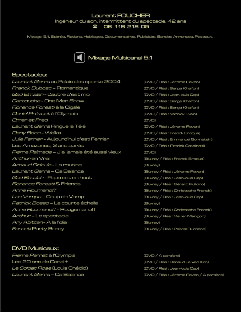 Laurent FOUCHER Ingénieur du son, intermittent du spectacle, 42 ans 06 118 218 05 Mixage: 5.1, Stéréo, Fictions, Habillages, Documentaires, Publicités, Bandes Annonces, Plateaux… Mixage Multicanal 5.1 Spectacles: Laurent Gerra au Palais des sports 2004 Franck Dubosc – Romantique Gad Elmaleh - L’autre c’est moi Cartouche - One Man Show Florence Foresti à la Cigale Daniel Prévost à l’Olympia Omar et Fred Laurent Gerra Flingue la Télé Dany Boon - Waïka Julie Ferrier - Aujourd’hui c’est Ferrier Les Amazones, 3 ans après Pierre Palmade – J’ai jamais été aussi vieux Arthur en Vrai Arnaud Gidouin - La routine Laurent Gerra – Ca Balance Gad Elmaleh - Papa est en haut Florence Foresti & Friends Anne Roumanoff Les Vamps – Coup de Vamp Patrick Bosso – La courte échelle Anne Roumanoff - Rougemanoff Arthur – Le spectacle Ary Abittan - A la folie Foresti Party Bercy (DVD / Réal : Jérome Revon) (DVD / Réal : Serge Khalfon) (DVD / Réal : Jean-louis Cap) (DVD / Réal : Serge Khalfon) (DVD / Réal : Serge Khalfon) (DVD / Réal : Yannick Evain) (DVD) (DVD / Réal : Jérome Revon) (DVD / Réal : Franck Broqua) (DVD / Réal : Emmanuel Gorinstein) (DVD / Réal : Patrick Czaplinski) (DVD) (Blu-ray / Réal : Franck Broqua) (Blu-ray) (Blu-ray / Réal : Jérome Revon) (Blu-ray / Réal : Jean-louis Cap) (Blu-ray / Réal : Gérard Pullicino) (Blu-ray / Réal : Christophe Franck) (Blu-ray / Réal : Jean-louis Cap) (Blu-ray) (Blu-ray / Réal : Christophe Franck) (Blu-ray / Réal : Xavier Maingon) (Blu-ray) (Blu-ray / Réal : Pascal Duchêne) DVD Musicaux: Pierre Perret à l’Olympia Les 20 ans de Canal+ Le Soldat Rose (Louis Chédid) Laurent Gerra – Ca Balance (DVD / A paraître) (DVD / Réal : Renaud Le Van Kim) (DVD / Réal : Jean-louis Cap) (DVD / Réal : Jérome Revon / A paraître) Mixage Stéréo Bandes Annonces: TF1, France 3, France 5, M6, Télétoon, Disney Channel etc… Documentaires: Plus d’une centaine de documentaires et magazines pour : Doc en Stock, 2P2L, Calt Productions, Breitling, Upside, Morgane Productions, Capital, MFP, TF1, France Télévisions, Canal +, Arte etc... Emissions et Programmes Courts: La Parenthèse Inattendue Dans les yeux d’Olivier Culture Pub Dans tes yeux Samedi soir avec Médias, Le Magazine Musicronik Symphonique Show Pièces de Théâtre Publicités diverses (Prod: Prod 360) (Prod: Storybox) (Prod: CBTV) (Prod: Upside TV) (Prod: DMLSTV) (Prod: Upside TV) (Prod : R-Lines / Diff : W9) (Prod : Carson / Réal : Franck Broca / Diff : France 2) (Prod : AMP / Diff : TPS) (Euro RSCG, Havas, BDDP, Medialab, France Espace Développement...) Fictions: Mère et Fille Y’a pas d’âge Bob Ghetto OffPrime PodCats Offzone Un Gars Une Fille M. S. S. Baie des Flamboyants etc… (60x7min / Prod : Yaka / Réal : S. Marelli) (60x7min / Prod : HBB26 / Diff : France 2) (26x6min/ Prod : R-Lines- Yaka / Réal : S. Marelli) (12x26min / Prod : Calt / Diff : M6) (Dessin animé / Prod : Okidoki / Diff : France 3) (Prod : Yaka / Réal : S. Marelli et J.P. Oudin / Diff : Disney Channel) (Prod : 22 Productions / Diff : France 2) (Prod : Yaka / Réal : Stéphane Marelli / Diff : France 3) (100x52min/ Prod : JLA / Réal : Gérard Espinasse / Diff : France O)
