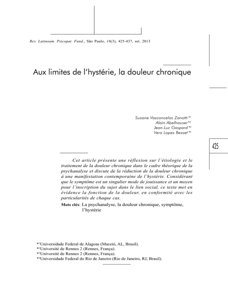 Rev. Latinoam. Psicopat. Fund., São Paulo, 16(3), 425-437, set. 2013 Aux limites de l’hystérie, la douleur chronique Susane Vasconcelos Zanotti*1 Alain Abelhauser*2 Jean-Luc Gaspard*3 Vera Lopes Besset*4 425 Cet article présente une réflexion sur l’étiologie et le traitement de la douleur chronique dans le cadre théorique de la psychanalyse et discute de la réduction de la douleur chronique à une manifestation contemporaine de l’hystérie. Considérant que le symptôme est un singulier mode de jouissance et un moyen pour l’inscription du sujet dans le lien social, ce texte met en évidence la fonction de la douleur, en conformité avec les particularités de chaque cas. Mots clés: La psychanalyse, la douleur chronique, symptôme, l’hystérie *1Universidade Federal de Alagoas (Maceió, AL, Brasil). *2Université de Rennes 2 (Rennes, França). *3Université de Rennes 2 (Rennes, França). *4Universidade Federal do Rio de Janeiro (Rio de Janeiro, RJ, Brasil). R E V I S T A LATINOAMERICANA DE P S I C O P A T O L O G I A F U N D A M E N T A L Les syndromes de douleurs chroniques 426 Les manifestations de souffrances corporelles, comme les syndromes de douleurs chroniques, ont régulièrement augmenté ces dernières années dans l’ensemble des pays occidentaux, notamment au Brésil et en France. Malgré les avancées des moyens thérapeutiques, spécialement dans le champ de la pharmacologie, elles atteignent des proportions préoccupantes pour les professionnels de la santé. Ces syndromes, dont la douleur est le principal symptôme, se caractérisent par un ensemble de signes qui communément ne correspond pas au modèle médical classique qui associe des causes organiques aux symptômes. Au Brésil, dans la ville de São Paulo, les résultats de l’Étude Épidémiologique de la Douleur (Épidor), réalisée en 2009,1 montrent que, parmi les 2 446 personnes interviewées, 22% ont des douleurs dans les jambes et les pieds, 21% ont des douleurs dans le dos, 17% dans la poitrine, 15% à la tête, 12% dans les bras et les mains (Em Foco, 2010). La majorité d’entre elles ne bénéficie pas de traitement adéquat pour ces douleurs chroniques. Au Brésil et en France, les études publiées respectivement par l’Association Brésilienne de Rhumatologie (Heymann et coll., 2010) et par l’Académie Française de Médecine, le rapport Menkès et Godeau, en janvier 2007, se réjoignent dans leurs conclusions, en soulignant la nécessité d´une approche pluridisciplinaire dans le traitement de ce type d’affection. Cette approche est souvent reprise dans des textes médicaux sur le sujet (Heymann et coll., 2010). En France, le Collège de la Haute Autorité de Santé, en 2008, a diffusé sur son site d’accès une recommandation à 1 Sous la coordination de Maria do Rosário Dias de Oliveira, do Departamento de Epidemiologia da Faculdade de Saúde Pública da Universidade de São Paulo. Rev. Latinoam. Psicopat. Fund., São Paulo, 16(3), 425-437, set. 2013 ARTIGOS l´ensemble du milieu médical, sous le titre: “Douleur Chronique: Reconnaître le syndrome douloureux chronique, l´évaluer et orienter le patient”. Les syndromes de douleurs chroniques sont classifiés en accord avec leur localisation: cervico-brachialgie, lombalgie, fibromyalgie, céphalée (Oliveira, 2000). Dans certains cas, on observe également une superposition des syndromes: LER et fibromyalgie; fibromyalgie et fatigue chronique; hypersensibilité chimique multiple et fatigue chronique. Cette superposition se présente généralement en relation avec la somatisation ou la conversion hystérique accompagnée par des troubles d’anxiété ou des symptômes dépressifs (Savi et coll., 1997). Parmi les douleurs chroniques dont le substrat organique n’est pas identifiable, on rencontre fréquemment la fibromyalgie. Selon la Classification Internationale des Maladies (CIM), ce syndrome est caractérisé par des douleur des muscles et du squelette, accompagnées de troubles du sommeil et de fatigue (Heymann, 2006). Cependant, certains auteurs signalent que les contours de la fibromyalgie ne sont pas clairement specifiés, ni d’un point de vue biologique, ni d’un point de vue clinique (Nacu & Benamouzing, 2010; Sordet-Guepet, 2004). Face à ces difficultés pour préciser l’étiologie de la fibromyalgie, la Société Brésilienne de Rhumatologie propose comme réponse une combinaison de traitement médicamenteux et non-médicamenteux, tel que la gymnastique et la psychothérapie (Heymann, 2006; Heymann et coll., 2010). Néanmoins, malgré tous ces efforts et la participation des professionnels des diverses disciplines, le traitement des douleurs chroniques, comme celui de la fibromyalgie, reste un véritable défi pour le savoir scientifique. Dans ce sens, les études sur la fibromyalgie s’accordent, généralement, sur l’importance de coordonner les recherches dans les différentes disciplines. Les patients qui souffrent de douleurs chroniques s’adressent aux médecins pour demander un soulagement, mais sûrtout un diagnostic précis pour nommer ce qu’ils éprouvent ou pour délimiter et légitimer, voire même obtenir, la reconnaissance de leur souffrance. Néanmoins, à l’exemple de ce qui s´est produit avec l’hystérie à la fin du XIX ème siècle, à l’époque de la création de la psychanalyse, certaines douleurs chroniques contredisent le savoir sur l’organisme et ses fonctions. Par la suite, les plaintes relatives aux douleurs chroniques arrivent, dans certains cas, dans le cabinet des psychanalystes (Paraboni & Rezende, 2010). Dans le cadre de la psychanalyse, quelques auteurs se sont consacrés à l’étude des douleurs (Nasio, 2008; Berlinck, 2000; Franco & Berlinck, 2003; Canongia & Berlinck, 2010) et d’autres aux douleurs chroniques dans la perspective d’en comprendre l’étiologie et contribuer à l’approche thérapeutique (Ebtinger, 2007; Castellanos, 2009; Ar