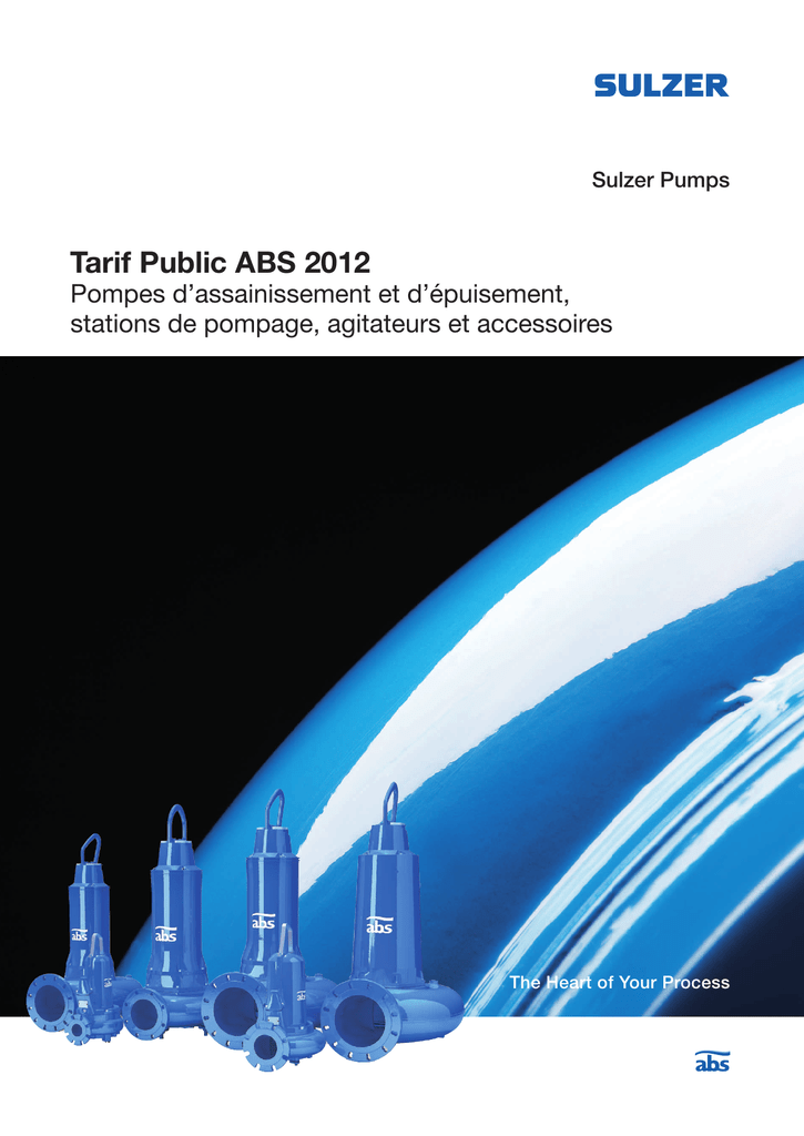 Sulzer Pumps Tarif Public ABS 2012 Pompes d’assainissement et d’épuisement, stations de pompage, agitateurs et accessoires The Heart of Your Process ABS, des produits innovants sources d’économies d’énergie Pompes submersibles XFP Pompes submersibles fiables et robustes dont le rendement moteur est équivalent ou supérieur à l’IE3 (IEC 60034-30). Ces pompes à haut rendement d’une puissance de 1.3 à 350 kW, disposent d’hydrauliques Contrablock+ ® ou Vortex nouvelle génération proposant une section de passage importante pour éviter les colmatages. Agitateur XRW L’agitateur submersible XRW d’ABS incluant un moteur à aimants permanents, procure une fiabilité hors pair minimisant les opérations de maintenance et maximisant le cycle de vie de l’équipement. Doté d’un variateur de fréquence, il permet d’optimiser les procédés et de réduire la consommation d’énergie et l’empreinte carbone. L’agitateur XRW 650, compact et d’un poids réduit, couvre une vaste gamme d’applications en matière d’agitation, de brassage et d’homogénéisation. Agitateur Flow Booster XSB L’agitateur, à vitesse lente, flow booster XSB 2750 d’ABS est idéal pour la circulation des eaux usées et la génération de flux lors des étapes de nitrification, dénitrification et élimination des phosphates. Son rendement moteur est équivalent ou supérieur au rendement premium IE3 et il est capable de réduire la consommation d’énergie de 25 %. Avec une poussée de plus de 6400 N grâce au modèle à trois pales, un seul agitateur est à présent suffisant là ou il en aurait fallu deux auparavant. De plus, les pales se démontent aisément du moyeu de l’hélice pour faciliter le transport, l’installation et la maintenance de l’agitateur. Turbocompresseurs centrifuges à paliers magnétiques HST Les turbocompresseurs HST d’ABS sont dotés d’un moteur électrique haute vitesse avec variateur de fréquence intégré. Ils font appel à une technique révolutionnaire de paliers magnétiques contrôlés électroniquement. Cela évite toute usure mécanique et rend inutile toute lubrification garantissant une maintenance minimale. La gamme de turbocompresseurs HST couvre des débits d’air jusqu’à 16 000 Nm³/h par machine et absorbe 10 à 30% d’énergie en moins par rapport à d’autres technologies existantes. Ils fonctionnent en parallèle d’autres technologies de compresseurs et disposent de systèmes de sécurité redondants. SOMMAIRE Pompes sanitaires et domestiques ABS Robusta 200 et 300.................................................................... 4 ABS Coronada 250............................................................................. 4 ABS IP 900.......................................................................................... 4 ABS MF 154-804................................................................................. 5 Pompes de chantier ABS J 5-15 Pompes d’épuisement..................................................... 6 ABS J 24-604 Pompes d’épuisement................................................. 7 ABS JC 24-84 Pompes d’épuisement................................................. 8 ABS JS 12-84 Pompes à boues......................................................... 9 Options et accessoires...................................................................... 10 Agitateurs ABS Agitateurs RW........................................................................... 11 ABS Agitateurs XRW 650 et XSB 2750 ...........................................12 Aérateurs ABS AE-PE1 .................................................................................... 13 ABS Hydro-éjecteur Venturi-jet ........................................................ 13 Pompes d’assainissement ABS Piranha 08-110.................................................................... 14-15 ABS AS 0530-0841...................................................................... 16-17 ABS XFP 80C-201G............................................................... 18-19-20 Accessoires ABS XFP Contrablock et Vortex.............................. 20-21 Courbes de performances ABS XFP 80C-201G....................... 22 à 27 Stations de relevage ABS Sanimax.................................................................................... 28 ABS Piranhamat 100 et 120............................................................. 28 ABS Nirolift........................................................................................ 29 ABS Sanisett 1 et 2........................................................................... 29 ABS Sanimat 1000, 1002, 2002 et 4002.......................................... 30 ABS Piranhamat 701 et 1002........................................................... 31 ABS Synconta 700 et 700 L ............................................................. 32 ABS Synconta 801............................................................................ 32 ABS Synconta 901-902 L.................................................................. 33 ABS Station préfabriquée Fibrazur................................................... 34 Modules de surveillance et capteurs de niveau ABS Contacteur à flotteur KS .......................................................... 35 Conditions Générales de vente ......................................................... 38 Abréviations : W = 230 V, monophasé D = 400 V, triphasé WTS = 230 V, monophasé avec flotteur intégré WKS = 230 V, monophasé avec flotteur KS DKS = 400 V, triphasé avec flotteur KS Ex = version anti-déflagrante H = Hauteur manométrique totale Q = Débit P2 = Puissance à l’arbre Courbes de performance conformes ISO 9906. Courbes en 60 Hz disponibles sur demande. La liste des N° d’articles n’est pas exhaustive ; pour les produits supplémentaires, veuillez contacter ABS. Pour la détermination de pompes, veuillez utiliser le logiciel ABSEL. 