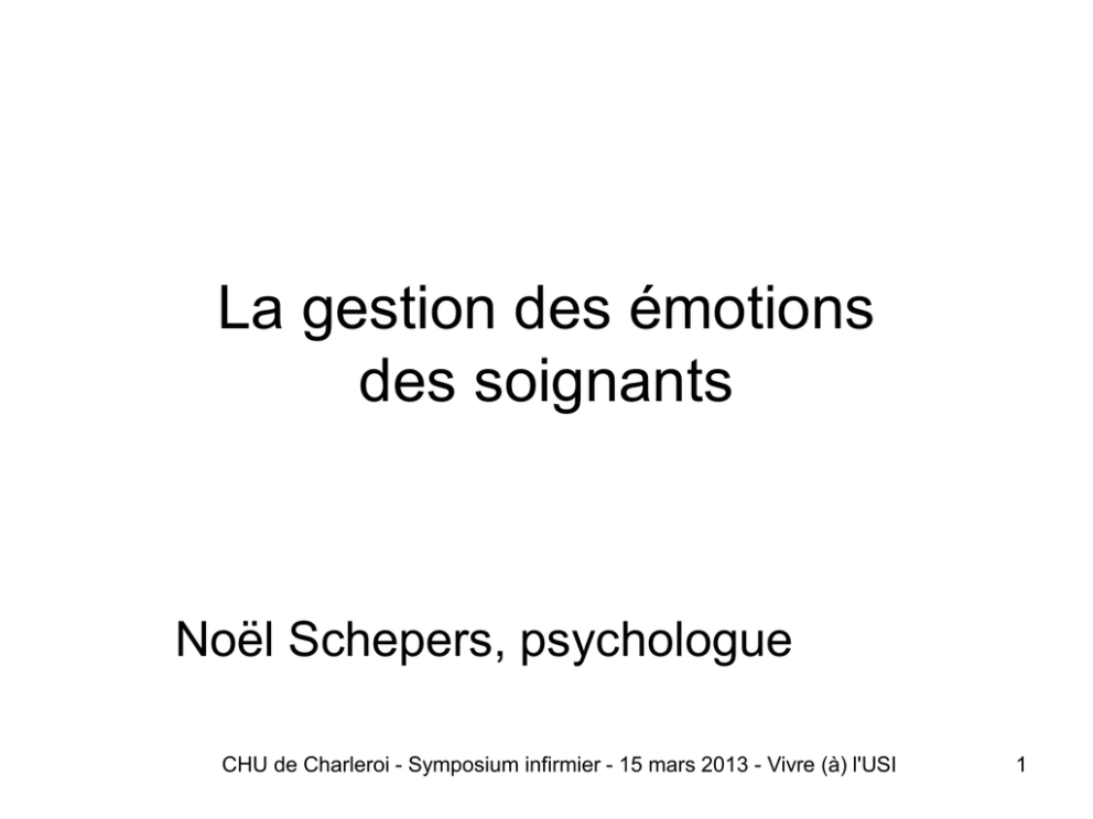 La gestion des émotions des soignants Noël Schepers, psychologue CHU de Charleroi - Symposium infirmier - 15 mars 2013 - Vivre (à) l'USI 1 Plan • • • • • Remarque préalable Qu’est-ce que l’émotion: essai de définition Quelles situations pour quelles émotions? La gestion des émotions Les éléments nécessaires à la gestion des émotions • Les effets de la gestion des émotions pour les équipes • Conclusions CHU de Charleroi - Symposium infirmier - 15 mars 2013 - Vivre (à) l'USI 2 Émotion (1) • Ensemble de réponses rapides caractérisé par trois composantes • physiologiques, • cognitives-expérientielles • comportementales-expressives. L'émotion possède une propriété d'apparition récurrente à plus long terme sous forme de ruminations dans le cas intra-personnel et de partage social dans le cas extra-personnel. CHU de Charleroi - Symposium infirmier - 15 mars 2013 - Vivre (à) l'USI 3 Émotion (2) L’émotion est une réponse automatique et immédiate de l’organisme à un stimulus ; elle associe de manière intégrée et simultanée : • une dimension privée de vécu psychique • une dimension publique expressive et comportementale • une dimension viscérale corporelle. CHU de Charleroi - Symposium infirmier - 15 mars 2013 - Vivre (à) l'USI 4 Définition • L’émotion est un phénomène foncièrement adaptatif qui inclut de manière prototypique (a) le décodage de toute situation en terme de sa signification pour l’identité et les buts poursuivis par la personne, (b) l’organisation d’une réponse immédiate en mobilisant toutes les facettes nécessaires de l’individu (c) un ensemble de réponses aux niveaux physiologiques, expressifs, comportementaux et cognitifs. ( in P. Philippot. (2007). Emotion et psychothérapie (pp.11-64). Wavre : Mardaga ) CHU de Charleroi - Symposium infirmier - 15 mars 2013 - Vivre (à) l'USI 5 Emotions Les émotions fondamentales, intenses et brèves, ne sont pas ce que nous ressentons le plus fréquemment au quotidien. Le plus souvent on est confrontés à des états plus complexes, des émotions subtiles, discrètes, des émotions mixtes ( triste et heureux, lors d'une cérémonie, triste et en colère….) CHU de Charleroi - Symposium infirmier - 15 mars 2013 - Vivre (à) l'USI 6 Quelles situations pour quelles émotions? Émotions de base • Tristesse • Colère • Joie • Peur CHU de Charleroi - Symposium infirmier - 15 mars 2013 - Vivre (à) l'USI 7 Peut-on gérer les émotions? • On ne peut pas ne pas ressentir d'émotions • Et on ne peut pas ne pas être influencé par elles • Le déclenchement des émotions est automatique : leur régulation est sous le contrôle ‘relatif’ de la ‘volonté’. • Émotions de base + une gamme de nuances • Une émotion peut en cacher une autre CHU de Charleroi - Symposium infirmier - 15 mars 2013 - Vivre (à) l'USI 8 Parmi les stratégies de gestion des émotions Identifier l’émotion pour en sortir. Développer l’habileté à percevoir l’émotion, à l’intégrer pour faciliter la pensée, à comprendre les émotions et à les maîtriser afin de favoriser l’épanouissement personnel. (d’après Mayer J.D., Salovey P. What is emotional intelligence? In: Salovey P, Sluyter DJ (eds). Emotional Development and Emotional Intelligence: Educational Implications. New York: Basic Books, 1997:3-31) CHU de Charleroi - Symposium infirmier - 15 mars 2013 - Vivre (à) l'USI 9 CHU de Charleroi - Symposium infirmier - 15 mars 2013 - Vivre (à) l'USI 10 La gestion des émotions • Pour être efficace, en milieu professionnel la gestion des émotions doit s’inscrire dans une perspective globale: au niveau de l’individu, du groupe et de l’organisation. CHU de Charleroi - Symposium infirmier - 15 mars 2013 - Vivre (à) l'USI 11 Les éléments nécessaires à la gestion des émotions (1) • Individu: prend conscience, apprend, évolue • Groupe: soutien, donne des permissions, respecte • Organisation : autorise, valorise, accorde de la reconnaissance. IMPORTANCE DE LA DIMENSION TEMPORELLE CHU de Charleroi - Symposium infirmier - 15 mars 2013 - Vivre (à) l'USI 12 Les éléments nécessaires à la gestion des émotions(2) • La possibilité de bénéficier d’un soutien psychologique individuel ou de groupe, formel ou informel, réactionnel ou programmé, en interne. • La possibilité de faire appel pour un soutien psychologique externe si nécessaire (pour tous les intervenants). • la présence d’un soutien social – des pairs et des gestionnaires – dans un cadre infirmier - 15 mars 2013 13 collaboratif CHU de Charleroi - Symposium Vivre (à) l'USI Effets de la gestion des émotions • Conclusions de l’étude de Jordi Quoidbach et Michel Hansenne au CHR de la citadelle Liège • Le développement de l’aptitude à réguler les émotions pourrait constituer une nouvelle piste pour construire des équipes de soins plus cohésives. • Observation d’une corrélation positive entre le score minimum de régulation des émotions dans l’équipe et la qualité des soins et une corrélation positive entre le score maximum de «régulation des émotions» dans l’équipe et la qualité des soins CHU de Charleroi - Symposium infirmier - 15 mars 2013 - Vivre (à) l'USI 14 Effets de la gestion des émotions Prendre en compte la gestion des émotions des soignants est ou outil de prévention • Du burnout • De l'usure de compassion CHU de Charleroi - Symposium infirmier - 15 mars 2013 - Vivre (à) l'USI 15 • Le burnout et fatigue compassionnelle = deux syndromes professionnels. • tous conséquence d'un stress différent: • le burnout a trait à une problématique d'accumulation des tensions et donc au stress chronique. • la fatigue compassionnelle se situe plutôt la problématique du traumatisme. coût de prendre soin des autres ayant des souffrances émotionnelles, traumatisme vicariant … CHU de Charleroi - Symposi