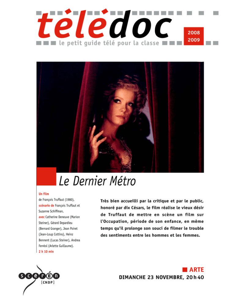 teledoc le petit guide télé pour la classe 2008 2009 Le Dernier Métro Un film de François Truffaut (1980), scénario de François Truffaut et Suzanne Schiffman, avec Catherine Deneuve (Marion Très bien accueilli par la critique et par le public, honoré par dix Césars, le film réalise le vieux désir de Truffaut de mettre en scène un film sur Steiner), Gérard Depardieu l’Occupation, période de son enfance, en même (Bernard Granger), Jean Poiret temps qu’il prolonge son souci de filmer le trouble (Jean-Loup Cottins), Heinz des sentiments entre les hommes et les femmes. Bennent (Lucas Steiner), Andrea Ferréol (Arlette Guillaume). 2 h 10 min ARTE DIMANCHE 23 NOVEMBRE, 20 h 40 Paris est un théâtre Éducation au cinéma, lettres, histoire, lycée Pendant l’Occupation, Marion Steiner dirige le théâtre Montmartre après que son mari Lucas a fui en Amérique du Sud parce qu’il est juif. Elle engage Bernard Granger comme acteur dans la pièce qu’elle fait répéter, dirigée par le metteur en scène Jean-Loup Cottins d’après les notes de Lucas. Or Lucas est resté caché dans la cave du théâtre en attendant de pouvoir partir et, par l’entremise de sa femme qui vient le voir chaque soir, il continue à diriger les répétitions. Après une altercation qui l’a opposée au tout-puissant critique et collaborateur Daxiat, Marion, effrayée d’une possible interdiction de sa pièce, refuse de parler à Bernard, mais doit néanmoins lui révéler le « secret ». Lors de la première, elle le rejoint dans sa loge et se donne à lui. L’épilogue du film les rassemble après la guerre : Marion est encadrée par les deux hommes réunis au tomber de rideau de la nouvelle pièce montée par Lucas, dont Bernard et elle sont les acteurs. Rédaction Philippe Huneman, professeur de philosophie Crédits photos D.R. Édition Anne Peeters Maquette Annik Guéry Ce dossier est en ligne sur le site de Télédoc. www.cndp.fr/tice/teledoc/ Ombres et espaces clandestins > Relever les différents espaces dans lesquels se déroule l’histoire du film, leur symbolique et la manière dont ils reflètent la situation et la psychologie des personnages. Étudier la dualité des personnages, notamment celle de Marion, puis celle de Lucas Steiner. Le film est traversé par la thématique de l’illusion et du semblant, parce qu’il inscrit dans une période pleine de faux-semblants la chronique de ce lieu d’artifices qu’est le théâtre. Ceci implique une logique cinématographique profonde qui commande l’usage des lumières et des espaces. Un théâtre, c’est avant tout une scène, une salle et des coulisses; le théâtre est le lieu principal de l’intrigue, lieu où les personnages se rencontrent. Ce qui se passe en dehors n’est presque pas montré (Bernard trafique et emprunte un pick-up au théâtre, mais seule la radio nous apprend qu’il a explosé dans une réunion de soldats allemands). À cette tripartition de l’espace se rajoute la dualité entre le théâtre lui-même et la cave où se cache Lucas ; cet artifice qu’est la scène, ce lieu caché que sont les coulisses se croisent donc avec un second lieu secret, le sous-sol. Celui-ci est souvent peu éclairé; comme le dit Lucas, son éclairage varie d’ailleurs en proportion inverse de l’éclairage du théâtre. Truffaut voulait qu’un film sur l’Occupation se fît en grande partie dans la pénombre. Le film est donc rythmé par les passages de l’ombre à la lumière qui accompagnent les voyages nocturnes de Marion dans la cave, ainsi que par les nombreuses coupures d’électricité. La première visite à Lucas est une descente qui se fait dans une obscurité progressive, scandée par des ouvertures de portes et de trappes. Elle s’interrompt par un noir total auquel fait suite un gros plan sur le visage de Lucas (cette apparition soudaine relevant de l’essence même du «coup de théâtre»). Lorsque la guerre se termine, celui-ci se précipite dehors témérairement pour voir le soleil. Le temps du film est donc divisé entre jour et nuit – d’où l’importance du «dernier métro», et du couvre-feu qui contraint parfois Marion à passer la nuit dans la cave avec Lucas, ou l’oblige à d’autres moments à le quitter tôt. Le temps de Marion est donc scindé en deux périodes au contenu inversé et l’espace du film en de multiples lieux qui ne communiquent pas. La scission du théâtre en deux lieux séparés (haut/bas, ombre/lumière) autour de Marion devient à la fin du film l’image de son partage entre deux hommes, puisqu’elle aime Bernard en haut et Lucas en bas. Truffaut ne cesse donc de faire circuler l’intrigue entre ces espaces: ainsi, lorsque Cottins apprend que le théâtre est juridiquement sans propriétaire, nous connaissons sa propre décision d’accepter de le reprendre de la bouche de Marion qui la rapporte à Lucas, dans la cave. Puis nous comprenons que Lucas lui a demandé d’aller s’adresser en plus haut lieu lorsque, dans la scène suivante, nous la voyons déjà dans le bâtiment de la Kommandantur. La première de la pièce opère alors la plus grande multiplication de ces espaces, puisque son déroulement est suivi de tous les points de vue, méticuleusement alternés : salle, scène (où Marion commente à voix basse l’entrée fracassante de Daxiat), cave (Lucas prend fiévreusement des notes), coulisses... L’espace double et les ombres mettent en scène la duplicité qui caractérise à la fois les relations des personnages entre eux et avec le monde qui les entoure. Ainsi, dans le film, tous les personnages ont un secret: Marion cache son mari, Bernard est résistant, Arlette est homosexuelle et même le régisseur ment sur sa relation avec sa prétendue « poule ». Ce secret n’est révélé que tardivement au spectateur et encore plus tard aux autres personnages; dans une certaine mesure, il donne la clé des comportements. Le film est tendu ve