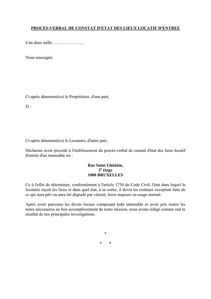 PROCES-VERBAL DE CONSTAT D'ETAT DES LIEUX LOCATIF D'ENTREE L'an deux mille …………………. Nous soussigné, Ci-après dénommé(es) le Propriétaire, d'une part, Et : Ci-après dénommé(es) le Locataire, d'autre part, Déclarons avoir procédé à l'établissement du procès-verbal de constat d'état des lieux locatif d'entrée d'un immeuble sis : Rue Saint Ghislain, 2e étage 1000 BRUXELLES Ce à l'effet de déterminer, conformément à l'article 1730 du Code Civil, l'état dans lequel le locataire reçoit les lieux et dans quel état, à sa sortie, il devra les restituer exception faite de ce qui aura péri ou aura été dégradé par vétusté, force majeure ou usage normal. Après avoir parcouru les divers locaux composant ledit immeuble et avoir pris toutes les notes nécessaires au bon accomplissement de notre mission, nous avons rédigé comme suit le résultat de nos principales investigations. * * * -2REMARQUES PRELIMINAIRES La description des lieux est faite, en général, de haut en bas. Dans chaque local, dans la mesure du possible, la description se fait à parti r de la porte principale d'accès, dans le sens des aiguilles d'une montre. Les notions de "gauche" et "droite" se réfèrent à la position de l'observateur par rapport à la chose décrite, sauf en ce qui concerne la position des locaux qui s'interprète en regardant l'immeuble depuis la façade principale à rue. Dans le présent constat des lieux, il n'a pas été tenu compte des défectuosités d'ordre constructif telles fissures et crevasses affectant les maçonneries, les enduits, les revêtements muraux ou de sols et autres si ce n'est à simple titre indicatif (pour mémoire). Il n'a pas été procédé à des investigations concernant l'état et le fonctionnement du réseau d'égouts, l'état interne des canalisations sanitaires, de chauffage, le réseau d'électricité, des équipements qui ne peuvent être appréciés qu’au cours d’une utilisation normale (appareils électroménagers, par exemple) et des divers appareils faisant partie de la location. Sauf avis opposé du locataire dans le mois ayant suivi l'entrée en jouissance, ceux-ci sont réputés en bon état de fonctionnement. Le fait d'avoir reçu le rapport par après ne peut constituer un affranchissement du délai mentionné. En aucun, nous ne pouvons être tenu responsable de leur éventuel dysfonctionnement : notre mission étant limitée aux simples constats usuels. Les éventuels relevés des compteurs sont effectués sous toutes réserves (fonctionnement, repérage, etc.). Compte tenu de la libéralisation du marché de l’énergie, des usages et des documents requis, il n’entre pas dans la mission d’expertise de procéder aux formalités administratives de transfert auxquelles les parties doivent seules veiller. L’enregistrement du présent procès-verbal est obligatoire aux termes de l’article 1730 §1 du nouveau Code Civil ; cette formalité incombe au bailleur. REMARQUES LIMINAIRES Appartement entièrement rénové. Plafonds : enduits sous nouvelle peinture blanche. Murs : enduits sous nouvelles peintures gris ardoise ou blanche. Sols : nouveaux parquets flottants en stratifié décor chêne sur planchers dénivelés. Plinthes en bois renouvelées et biseautées sous nouvelle peinture satinée blanche. Menuiseries extérieures : châssis en bois récent sous peinture blanche renouvelée ; doubles vitrages ; anciennes tablettes en PVC décor marbre. -3Chauffage : électrique ; radiateurs DIMPLEX neufs à carters blancs. Electricité : installation encastrée et renouvelée. Interrupteurs et prises de courant avec plaques de recouvrement NEW NIKO de teinte ivoire. CONSTATATIONS Salle de douches Plafond : un spot orientable en métal laqué blanc dichroïque fonctionnant. À gauche de la cabine de douches est suspendu un nouveau ballon d’eau chaude RENOVA BULEX apparent, cylindrique, de petite capacité. Sous ce ballon d’eau chaude, un manomètre HONEYWELL et un groupe de sécurité ; tuyau d’écoulement disparaissant dans la gaine sur sa gauche. Les murs sont nouvellement carrelés de faïences blanches à grands calibres à joints blancs fins. Porte : isoplane et sous nouvelle peinture satinée blanche ; deux crochets en métal gris vissés ; deux rosaces et une béquille en inox brossé ; une serrure à gorge avec sa clé. Chambranles idem porte ; les mailles du bois migrent sous peinture. Baie de fenêtre sur aéra : béquille noire ; l’oscillo-battant fonctionne. Tablette idem châssis. Un store vénitien orange COPA en aluminium avec sa barre de manœuvre et son cordon. Sous la baie de fenêtre, un porte-rouleaux chromé. Un radiateur et une prise de courant. Un W.-C suspendu avec vase en porcelaine blanche et lunette en matière duroplastique blanche KOLO. Chasse encastrée GROHE avec une plaque de commande chromée à deux touches. À droite, une cabine de douches avec un nouveau pare-douche à châssis d’aluminium satiné ; deux parois fixes et deux parois coulissantes en verre ; double tirant chromé ; ces portes coulissantes sont pourvues de bourrelets d’étanchéité verticaux. Receveur en acryl sanitaire blanche ; crépine chromée. Un mitigeur GROHE ; un flexible annelé chromé ; une douchette à main chromée. Une petite barre de douche chromée. Un porte-savon en tréfilé chromé triangulaire vissé dans l’angle. À l’extérieur de la cabine, un interrupteur, une prise de courant. Un meuble lavabo suspendu, neuf. Table vasque en matériau synthétique blanc. Un petit mitigeur GROHE. Tirette de vidage automatique. Une grosse crépine chromée sur le tropplein. En dessous, un tiroir laqué blanc avec une longue poignée en alu. Au-dessus, un resserrage assorti. À gauche du lavabo, un porte-serviettes en inox brossé tubulaire IKEA vissé. -4Au-dessus, un miroir avec un cadre épais en MDF laqué blanc d’usine. Au-dessus, une applique idem plafond qui fonctionne également. Sol : no