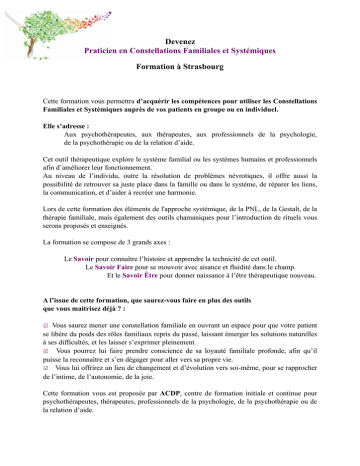Devenez Praticien en Constellations Familiales et Systémiques Formation à Strasbourg Cette formation vous permettra d’acquérir les compétences pour utiliser les Constellations Familiales et Systémiques auprès de vos patients en groupe ou en individuel. Elle s’adresse : Aux psychothérapeutes, aux thérapeutes, aux professionnels de la psychologie, de la psychothérapie ou de la relation d’aide. Cet outil thérapeutique explore le système familial ou les systèmes humains et professionnels afin d’améliorer leur fonctionnement. Au niveau de l’individu, outre la résolution de problèmes névrotiques, il offre aussi la possibilité de retrouver sa juste place dans la famille ou dans le système, de réparer les liens, la communication, et d’aider à recréer une harmonie. Lors de cette formation des éléments de l'approche systémique, de la PNL, de la Gestalt, de la thérapie familiale, mais également des outils chamaniques pour l’introduction de rituels vous serons proposés et enseignés. La formation se compose de 3 grands axes : Le Savoir pour connaître l’histoire et apprendre la technicité de cet outil. Le Savoir Faire pour se mouvoir avec aisance et fluidité dans le champ. Et le Savoir Être pour donner naissance à l’être thérapeutique nouveau. A l’issue de cette formation, que saurez-vous faire en plus des outils que vous maitrisez déjà ? : ☑ Vous saurez mener une constellation familiale en ouvrant un espace pour que votre patient se libère du poids des rôles familiaux repris du passé, laissant émerger les solutions naturelles à ses difficultés, et les laisser s’exprimer pleinement. ☑ Vous pourrez lui faire prendre conscience de sa loyauté familiale profonde, afin qu’il puisse la reconnaître et s’en dégager pour aller vers sa propre vie. ☑ Vous lui offrirez un lieu de changement et d’évolution vers soi-même, pour se rapprocher de l’intime, de l’autonomie, de la joie. Cette formation vous est proposée par ACDP, centre de formation initiale et continue pour psychothérapeutes, thérapeutes, professionnels de la psychologie, de la psychothérapie ou de la relation d’aide. La formation se déroulera à Strasbourg, sans hébergement. Elle se compose de 5 modules de 4 jours, soit 20 jours de formation au total. Les 2 derniers jours du module 5 seront consacrés à la certification, afin de valider vos connaissances. Programme : Module 1 : Introduction aux Constellations, Introduction à Soi-Même Théorie et pratiques de la thérapie systémique A la découverte de son arbre Introduction aux rituels chamanique Module 2 : Les Mouvement de l’Âme L’écoute Inconscient familial et secret de famille Mort / Deuil Les 5 blessures de l’âme Les différents types de constellation Module 3 : Invitation à la Transformation de son Être Introduction en Psychopathologie Introduction à l’Hypnose Confiance et Sécurité Synchronicités Module 4 : La Naissance de son Être Thérapeute L’intelligence du corps Outils PNL Introduction en Transgénérationel Module 5 : La Nouvelle Aventure Déontologie du thérapeute Entretien et suivi Certification sur 2 jours Dates : Module 1 Module 2 Module 3 Module 4 Module 5 17 novembre 2016 12 janvier 2017 23 mars 2017 11 mai 2017 8 juin 2017 18 novembre 2016 13 janvier 2017 24 mars 2017 12 mai 2017 9 juin 2017 19 novembre 2016 14 janvier 2017 25 mars 2017 13 mai 2017 10 juin 2017 20 novembre 2016 15 janvier 2017 26 mars 2017 14 mai 2017 11 juin 2017 Lieu : à Strasbourg près de l’Orangerie Tarif : Prix du module 560 euros, hors restauration et hors hébergement. Un engagement est demandé pour les 5 modules. Pour plus d’informations contacter Lamiae OULAD au 0662503723 ou par mail à [email protected] Pour vous inscrire : Renvoyer-nous le bulletin d’inscription ci-dessous. BULLETIN D’INSCRIPTION NOM :___________________________________________________________ PRENOM :___________________________________________________________ ADRESSE :___________________________________________________________ VILLE :_____________________________ CODE POSTAL :_______________ TELEPHONE :___________________________________________________________ E-MAIL :___________________________________________________________ S’inscrit à la formation « Devenir Praticien en Constellations Familiales et Systémiques » à Strasbourg, prix du module 560 euros, hors restauration et hors hébergement. S’engage à assister aux 5 modules. A pris note des dates des 5 modules : Module 1 Module 2 Module 3 Module 4 Module 5 17 novembre 2016 12 janvier 2017 23 mars 2017 11 mai 2017 8 juin 2017 18 novembre 2016 13 janvier 2017 24 mars 2017 12 mai 2017 9 juin 2017 19 novembre 2016 14 janvier 2017 25 mars 2017 13 mai 2017 10 juin 2017 20 novembre 2016 15 janvier 2017 26 mars 2017 14 mai 2017 11 juin 2017 Bulletin d’inscription à envoyer accompagné d’un chèque de 200 euros à l’ordre d’ACDP qui n’est pas remboursable en cas de désistement moins de 15 jours avant le début de la formation, à ACDP 4 boulevard président Edwards 67000 Strasbourg