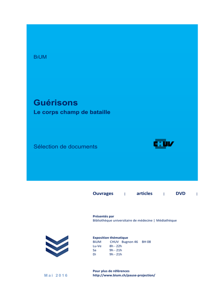 CD BIUM Guérisons Le corps champ de bataille Sélection de documents Ouvrages | articles | DVD Présentés par Bibliothèque universitaire de médecine | Médiathèque Exposition thématique BiUM CHUV Bugnon 46 Lu-Ve 8h - 22h Sa 9h - 21h Di 9h - 21h Mai 2016 BH 08 Pour plus de références http://www.bium.ch/pause-projection/ | PAUSE PROJECTION – GUERISONS Projection du 26 mai 2016 2. Le corps champ de bataille Sélection de documents disponibles au sein des bibliothèques universitaires de médecine et santé publique (CHUV). Si l'un de ces documents vous intéresse, n'hésitez pas à nous contacter : [email protected] . Une exposition thématique est aussi visible à la Bibliothèque universitaire de médecine (BiUM) pendant la période qui suit la projection. Pour consulter les sélections documentaires sur les cycles « Pause Projection » Sur le site de la BiUM : http://www.bium.ch/pause-projection/ Sur l’intranet CHUV : Pause Projection Sur le site de l’IUMSP https://www.iumsp.ch/fr/pause-projection/archives Sélection bibliographique : I. de Kaenel (BiUM). Sommaire 1 Starobinski, Canguilhem : deux penseurs de la guérison ......................................................... 2 2 Organiser la bataille dans le domaine de la transplantation ................................................... 2 3 Le corps réparé : vécu et qualité de vie ................................................................................ 12 4 Documents audiovisuels et sites internet............................................................................. 17 1 Starobinski, Canguilhem : deux penseurs de la guérison • Balavoine Michael. Qu'est-ce que guérir ? Le chemin d'un concept, selon Jean Starobinski. Médecine & Hygiène. 2004(2507):1543. http://www.revmed.ch/rms/2004/RMS-2507/1543 Abstract: D'abord considérée comme un retour à un état naturel, la guérison est aujourd'hui largement relativisée par les spécialistes qui lui associent des paramètres objectifs et une durée limitée. Loin de l'idée de retour restitutif, même si celle-ci persiste au niveau linguistique lorsque le malade exprime la perception qu'il a de soi, la conception actuelle de la guérison est comparable, pour paraphraser Jean Starobinski, à cette «divine et miraculeuse métamorphose» du corps dont parlait déjà Montaigne. • Canguilhem Georges. Le normal et le pathologique. [9e éd. "Quadrige"] ed. Paris: Presses Univ. de France : Quadrige; 2003. Abstract Dans sa conclusion, Canguilhem résume sa conception de la guérison : «La guérison est la reconquête d’un état de stabilité des normes physiologiques. Elle est d’autant plus voisine de la maladie ou de la santé que cette stabilité est moins ou plus ouverte à des remaniements éventuels. En tout cas, aucune guérison n’est retour à l’innocence biologique. Guérir c’est se donner de nouvelles normes de vie, parfois supérieures aux anciennes. Il y a une irréversibilité de la normativité biologique». Localisation : RERO, VD BiUM salle HESAV, Cote 22.2 CAN • Nau Jean-Yves. Georges Canguilhem, la guérison et les guérisseurs. Revue médicale suisse. 2014;10(420):574-5. http://www.revmed.ch/rms/2014/RMS-N-420/Georges-Canguilhem-la-guerison-et-les-guerisseurs Abstract Dans ce commentaire sur une nouvelle édition d’ Ecrits sur la médecine de Canguilhem, J.-Y. Nau évoque l’alliance thérapeutique: …«pour le malade, la guérison est ce que lui doit la médecine tandis que, pour la plupart des médecins, ce que la médecine doit au malade est assez différent : au mieux le traitement le mieux étudié, le mieux expérimenté et essayé à ce jour. Où l’on voit qu’il ne saurait y avoir d’entente véritable. Il se peut, heureusement, que l’attente de son patient rencontre la proposition du médecin. Cela ne saurait toutefois être une règle, encore moins un dû». • Starobinski Jean. Guérison. In: Lecourt Dominique, editor. Dictionnaire de la pensée médicale. Paris: Presse Universitaires de France; 2004. p. 546-53. Abstract En partant de son sens étymologique, Jean Starobinski retrace les évolutions de la notion de guérison. Localisation : RERO, VD BiUM Références, Cote W 13 Dic 2 Organiser la bataille dans le domaine de la transplantation •Anglicheau D., Canaud G., Loupy A., et al. Transplantation rénale : réalisation et suivi précoce. EMC - Néphrologie. 2016;13(1):1-15. DOI:10.1016/S1762-0945(15)64379-0 http://www.em-premium.com/showarticlefile/965488/18-64379_plus.pdf Version du 25.05.2016 2 Abstract: Plus de 50 ans après le succès des deux premières transplantations rénales réalisées à Boston et à l’hôpital Necker à Paris, la transplantation rénale est devenue le traitement de choix de l’insuffisance rénale chronique terminale, car elle améliore non seulement la qualité de vie des patients mais aussi leur quantité de vie. En France, plus de 3000 transplantations rénales sont réalisées chaque année, et plus de 33 000 patients vivent avec un greffon fonctionnel. Ce traitement de l’insuffisance rénale chronique terminale requiert une évaluation précise du futur receveur puis une prise en charge spécialisée multidisciplinaire capable de prévenir, dépister et traiter l’ensemble des pathologies associées et des complications de l’immunosuppression. •Bomboy A. Greffe, l'homme réparé. Dossier. Science et Santé. 2011(5):22-35. http://www.inserm.fr/mediatheque/infr-grand-public/fichiers/sciencesante/dossier_ss5_nov_dec2011 Abstract: À la fin de l'année 2011, le Plan Greffe 2012-2017, deuxième du nom, est lancé en France. Trois axes principaux ont ainsi été suggérés par l'Agence de la biomédecine : la prise en charge des personnes en attente de greffe et des greffés par des services dédiés tout au long de leur parcours, l'augmentation du nombre de dons (donneurs vivants ou décédés) et enfin le soutien à la recherche pour améliorer les greffes de 