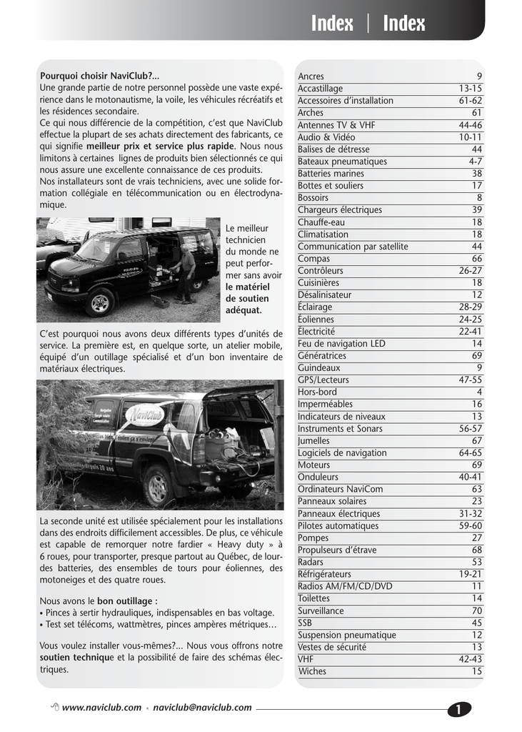 Index Pourquoi choisir NaviClub?... Une grande partie de notre personnel possède une vaste expérience dans le motonautisme, la voile, les véhicules récréatifs et les résidences secondaire. Ce qui nous différencie de la compétition, c’est que NaviClub effectue la plupart de ses achats directement des fabricants, ce qui signifie meilleur prix et service plus rapide. Nous nous limitons à certaines lignes de produits bien sélectionnés ce qui nous assure une excellente connaissance de ces produits. Nos installateurs sont de vrais techniciens, avec une solide formation collégiale en télécommunication ou en électrodynamique. Le meilleur technicien du monde ne peut performer sans avoir le matériel de soutien adéquat. C’est pourquoi nous avons deux différents types d’unités de service. La première est, en quelque sorte, un atelier mobile, équipé d’un outillage spécialisé et d’un bon inventaire de matériaux électriques. La seconde unité est utilisée spécialement pour les installations dans des endroits difficilement accessibles. De plus, ce véhicule est capable de remorquer notre fardier « Heavy duty » à 6 roues, pour transporter, presque partout au Québec, de lourdes batteries, des ensembles de tours pour éoliennes, des motoneiges et des quatre roues. Nous avons le bon outillage : Pinces à sertir hydrauliques, indispensables en bas voltage. • Test set télécoms, wattmètres, pinces ampères métriques… • Vous voulez installer vous-mêmes?... Nous vous offrons notre soutien technique et la possibilité de faire des schémas électriques. www.naviclub.com • [email protected] Index Ancres Accastillage Accessoires d’installation Arches Antennes TV & VHF Audio & Vidéo Balises de détresse Bateaux pneumatiques Batteries marines Bottes et souliers Bossoirs Chargeurs électriques Chauffe-eau Climatisation Communication par satellite Compas Contrôleurs Cuisinières Désalinisateur Éclairage Éoliennes Électricité Feu de navigation LED Génératrices Guindeaux GPS/Lecteurs Hors-bord Imperméables Indicateurs de niveaux Instruments et Sonars Jumelles Logiciels de navigation Moteurs Onduleurs Ordinateurs NaviCom Panneaux solaires Panneaux électriques Pilotes automatiques Pompes Propulseurs d’étrave Radars Réfrigérateurs Radios AM/FM/CD/DVD Toilettes Surveillance SSB Suspension pneumatique Vestes de sécurité VHF Wiches 9 13-15 61-62 61 44-46 10-11 44 4-7 38 17 8 39 18 18 44 66 26-27 18 12 28-29 24-25 22-41 14 69 9 47-55 4 16 13 56-57 67 64-65 69 40-41 63 23 31-32 59-60 27 68 53 19-21 11 14 70 45 12 13 42-43 15 1 Equipe Présentation Ce n’est pas dans le catalogue T e a m Appelez-nous Presentation Marine NaviClub se spécialise en électronique marine et en électricité continue. Avec le temps, d’autres spécialités se sont greffées, dont la réfrigération, vente et service, la vente et l’installation de moteurs, la vente de petites embarcations et l’installation de bossoirs. Nous offrons aux constructeurs et rénovateurs un service de vente et de consultation globale, pour tout achat relatif au bateau : mât, accastillage, cuisinière… Nous veillons à l’installation et à la réparation de la grande majorité des équipements que nous vendons. Véhicules récréatifs Profitez de notre expertise en courant continu, en énergie alternative et en électricité de marine. Les produits marins « haut de gamme », câbles, chargeurs et autres, ne coûtent pas plus cher. Nos 7 années d’expérience dans ce domaine nous ont permis de constater plusieurs aberrations techniques dans la distribution électrique des véhicules récréatifs, la technologie ayant, en quel-que sorte, plafonné dans les années 60. Nous pouvons grandement améliorer votre système électrique, votre autonomie et votre quiétude. De plus, profitez de notre longue expérience avec les GPS. Avec NaviClub, vous serez bien conseillé dans cette mer de technologies. 2 2+ 418 835.9279 • 1 888 NAVI CLUB (628.4258) • 418 835.6681 Is not in catalogue Equipe Call us Présentation T e a m Presentation Énergie alternative NaviClub est un pionnier dans ce domaine, nous y travaillons depuis 20 ans. Au cours des années, nous avons dû affronter la compétition; nous sommes toujours là, grâce à la qualité des produits que nous vendons, top qualité, c’est pour nous une devise. Le plus étonnant, c’est que la plupart du temps, ça ne coûte pas plus cher. Nous avons, au fil des ans, équipé plusieurs résidences secondaires, réalisé de grands projets avec la SEPAC, la DGT, la GRC, l’Institut Maurice Lamontagne, la Garde Côtière, l’Université Laval et Hydro Québec. À vous de profiter d’une des meilleures expertises en énergie alternative au Canada, et ce, au meilleur prix sur le marché. Soyez vigilant, faites affaire avec des gens qui ont à coeur votre entière satisfaction. L’équipe de NAVICLUB est là pour vous… www.naviclub.com • [email protected] 3 bateaux Accessoire boats Ce n’est pas dans le catalogue Appelez-nous Accessories WALKERBAY A Genesis Console Kit Console pour bateau Genesis 310 ou 340. Comprenant : • La console avec support à batterie, le volant et main courante. • Le banc avec rangement sécuritaire pour le réservoir d’essence 925100 Prix 1499.99$ A B Deluxe Tender Kit Nouveau Option de luxe pour Genesis Console Kit. Comprenant : • Les coussins pour les 2 bancs et l’avant. • Le dossier coussiné • Un compartiment étanche dans le banc du conducteur. 925140 Prix 1 099.99$ B Electrical/Lighting Kit Ensemble avec feux de navigation, panneau électrique et câblage. 925180 Prix 399.99$ PPS Des moteurs hors-bord neufs au prix de l’usagé. Les nouveaux moteurs à 4temps PPS, un synonyme de puissance, faible consommation d’essence, fonctionnement sans fumée. De plus, ils offrent une solide garantie de 2 ans. PPS 2.6 Forces pied court Poids de 18 Kg. Prix 749,99$ PPS 4 Forces pied court Poids de 24,5 Kg