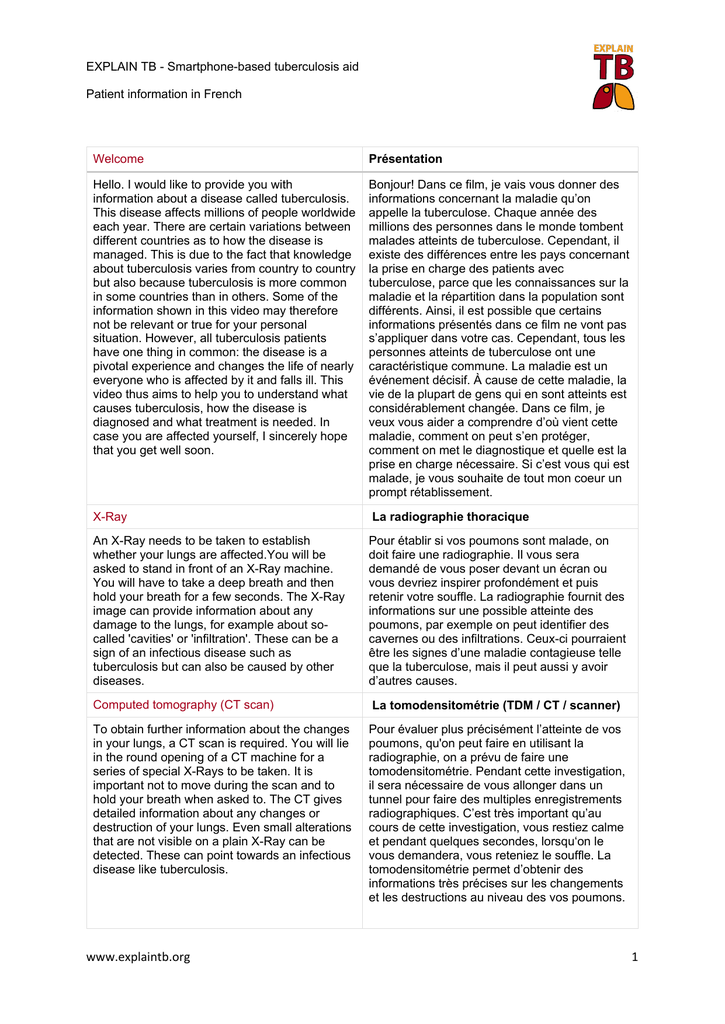 EXPLAIN TB - Smartphone-based tuberculosis aid Patient information in French Welcome Présentation Hello. I would like to provide you with information about a disease called tuberculosis. This disease affects millions of people worldwide each year. There are certain variations between different countries as to how the disease is managed. This is due to the fact that knowledge about tuberculosis varies from country to country but also because tuberculosis is more common in some countries than in others. Some of the information shown in this video may therefore not be relevant or true for your personal situation. However, all tuberculosis patients have one thing in common: the disease is a pivotal experience and changes the life of nearly everyone who is affected by it and falls ill. This video thus aims to help you to understand what causes tuberculosis, how the disease is diagnosed and what treatment is needed. In case you are affected yourself, I sincerely hope that you get well soon. Bonjour! Dans ce film, je vais vous donner des informations concernant la maladie qu’on appelle la tuberculose. Chaque année des millions des personnes dans le monde tombent malades atteints de tuberculose. Cependant, il existe des différences entre les pays concernant la prise en charge des patients avec tuberculose, parce que les connaissances sur la maladie et la répartition dans la population sont différents. Ainsi, il est possible que certains informations présentés dans ce film ne vont pas s’appliquer dans votre cas. Cependant, tous les personnes atteints de tuberculose ont une caractéristique commune. La maladie est un événement décisif. À cause de cette maladie, la vie de la plupart de gens qui en sont atteints est considérablement changée. Dans ce film, je veux vous aider a comprendre d’où vient cette maladie, comment on peut s’en protéger, comment on met le diagnostique et quelle est la prise en charge nécessaire. Si c’est vous qui est malade, je vous souhaite de tout mon coeur un prompt rétablissement. X-Ray La radiographie thoracique An X-Ray needs to be taken to establish whether your lungs are affected.You will be asked to stand in front of an X-Ray machine. You will have to take a deep breath and then hold your breath for a few seconds. The X-Ray image can provide information about any damage to the lungs, for example about socalled 'cavities' or 'infiltration'. These can be a sign of an infectious disease such as tuberculosis but can also be caused by other diseases. Pour établir si vos poumons sont malade, on doit faire une radiographie. Il vous sera demandé de vous poser devant un écran ou vous devriez inspirer profondément et puis retenir votre souffle. La radiographie fournit des informations sur une possible atteinte des poumons, par exemple on peut identifier des cavernes ou des infiltrations. Ceux-ci pourraient être les signes d’une maladie contagieuse telle que la tuberculose, mais il peut aussi y avoir d’autres causes. Computed tomography (CT scan) La tomodensitométrie (TDM / CT / scanner) To obtain further information about the changes in your lungs, a CT scan is required. You will lie in the round opening of a CT machine for a series of special X-Rays to be taken. It is important not to move during the scan and to hold your breath when asked to. The CT gives detailed information about any changes or destruction of your lungs. Even small alterations that are not visible on a plain X-Ray can be detected. These can point towards an infectious disease like tuberculosis. Pour évaluer plus précisément l’atteinte de vos poumons, qu'on peut faire en utilisant la radiographie, on a prévu de faire une tomodensitométrie. Pendant cette investigation, il sera nécessaire de vous allonger dans un tunnel pour faire des multiples enregistrements radiographiques. C’est très important qu’au cours de cette investigation, vous restiez calme et pendant quelques secondes, lorsqu‘on le vous demandera, vous reteniez le souffle. La tomodensitométrie permet d’obtenir des informations très précises sur les changements et les destructions au niveau des vos poumons. www.explaintb.org 1 EXPLAIN TB - Smartphone-based tuberculosis aid Patient information in French Ainsi, on peut détecter même les petits lésions qui peuvent indiquer une maladie contagieuse telle que la tuberculose et qu’on ne peut pas voir sur la radiographie. Sputum analysis L’examen du crachat To gain more information about a possible infection with tuberculosis, the phlegm that you cough up needs to be examined. Tuberculosis bacteria in your 'sputum' - which is the medical word for 'phlegm' - can be dyed with a special dying method called Ziehl-Neelsen and then looked at under a microscope. This is a method used to establish whether or not you are infectious when you cough. Only when bacteria are visible on microscopy you are infectious to others. During the course of treatment, the number of bacteria being coughed up declines. Therefore it is very important that the sputum sample is coughed up from the deep parts of the lung. It should be spat in the tube supplied. Afin d’obtenir des indices supplémentaires pour une possible atteinte de la tuberculose, on doit faire un examen du crachat dont vous éliminez quand vous toussez. Les bacilles de la tuberculose qui se trouvent dans vos crachats peuvent être vus sous le microscope à l’aide d’une coloration qui s’appelle Ziehl-Neelsen. Ainsi on peut vérifier si vous êtes contagieux ou pas lorsque vous toussez. Ce n’est que lorsqu’on voit des bacilles sous le microscope, que vous pouvez infecter d’autres personnes. Au cours de la thérapie vous éliminerez par la toux de moins en moins bacilles. Ainsi c’est important que l’examen du crachat soit fait sur un prélèvement provenant du profondeur des poumons et qu’il soit expectoré afin d’un toux forcé dans un récipient. Ce récipient sera mis à votre disposi