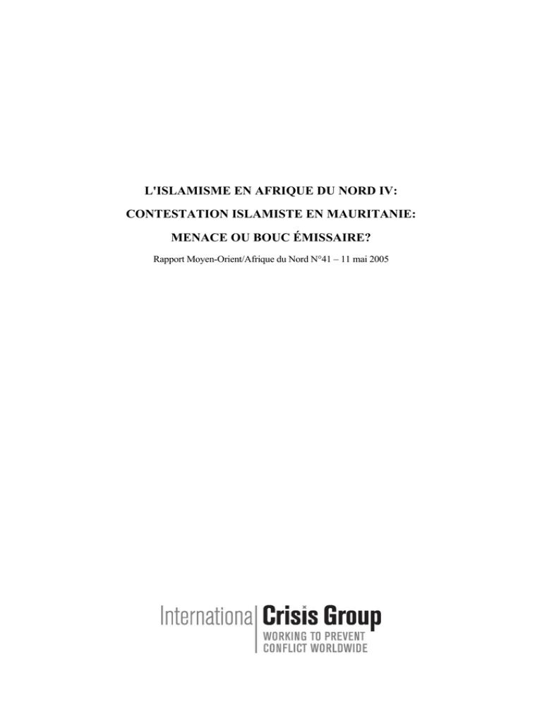 L'ISLAMISME EN AFRIQUE DU NORD IV: CONTESTATION ISLAMISTE EN MAURITANIE: MENACE OU BOUC ÉMISSAIRE? Rapport Moyen-Orient/Afrique du Nord N°41 – 11 mai 2005 TABLE DES MATIÈRES SYNTHÈSE ET RECOMMANDATIONS............................................................................. i I. INTRODUCTION .......................................................................................................... 1 A. B. C. II. UN PAYS JEUNE .....................................................................................................................1 UN RÉGIME CONTESTÉ...........................................................................................................3 L'ISLAM EN MAURITANIE ......................................................................................................4 ENTRE COLLABORATION ET RÉSISTANCE: L'ISLAM FACE À LA COLONISATION........................................................................................................... 5 A. B. C. COLLABORER AU NOM DE L'ISLAM: SHAIKH SIDIYYA BABA ..................................................5 RÉSISTER AU NOM DE L'ISLAM: SHAIKH MA AL-AÏNIN .........................................................6 LES COLONISATEURS ET L'ISLAM...........................................................................................6 III. L'ÉTAT INDÉPENDANT ET LE CONTRÔLE DU CHAMP RELIGIEUX ......... 7 A. B. C. D. A LA RECHERCHE D'UNE ONCTION RELIGIEUSE ......................................................................7 LE CONTRÔLE DE LA RELIGION: BÂTIR UN ISLAM D'ÉTAT ......................................................9 LE CONTRÔLE DE LA RELIGION: MAINTENIR LES ISLAMISTES EN DEHORS DU CHAMP POLITIQUE ...........................................................................................................................10 LES RÉFORMES DE L'ÉDUCATION: L'ARABISATION DU SYSTEME ÉDUCATIF, UNE DES CAUSES DE L'ISLAMISME?.................................................................................................................13 IV. LES ACTEURS, REFLETS DES MUTATIONS DE LA SOCIÉTÉ ...................... 15 A. B. C. D. E. LES TADJAKANT, PREMIERS "IMPORTATEURS" DU WAHHABISME?.......................................15 LA NÉBULEUSE ISLAMISTE ..................................................................................................15 MOHAMED OULD SIDI YAHYA: PERSONNAGE CENTRAL DE L'ISLAMISME DES ANNÉES 1980 ET 1990...............................................................................................................................17 NOUAKCHOTT, L'ARGENT DES PAYS DU GOLFE ET "LA LUTTE DES CLASSES" .......................18 LA NOUVELLE TENTATIVE DE FORMATION D'UN MOUVEMENT UNITAIRE ..............................19 V. CONCLUSION ............................................................................................................. 22 ANNEXES A. CARTE DE LA MAURITANIE .................................................................................................24 B. SIGLES ................................................................................................................................25 Rapport Moyen-Orient/Afrique du Nord N°41 11 mai 2005 L'ISLAMISME EN AFRIQUE DU NORD IV: CONTESTATION ISLAMISTE EN MAURITANIE: MENACE OU BOUC ÉMISSAIRE? SYNTHÈSE Ignorée par les médias et les chancelleries internationales, la Mauritanie vit une période d'instabilité croissante. Tentatives de putschs avortés, formation du mouvement rebelle, Foursan Taghyir (Les Cavaliers du Changement), découverte de caches d'armes à Nouakchott, arrestations de dirigeants islamistes: les signes ne manquent pas. Dans le discours officiel, le problème de la stabilité politique tend à être lié à la question de l'Islamisme. La réalité est bien moins simple. Le régime d'Ould Taya profite de la situation internationale (lutte contre le terrorisme mondial) pour légitimer un déni de démocratie et accréditer la thèse de l'accointance des islamistes avec les rebelles, afin de les déconsidérer. Ce faisant, il prend le risque de conduire l'État mauritanien dans une impasse en le rendant dangereusement dépendant du soutien américain face à une contestation interne grandissante. Miser sur le soutien extérieur pour réprimer un soi-disant terrorisme islamiste local qui, à l'heure actuelle, n'existe guère, relève plus de la fuite en avant que d'une stratégie réfléchie, et pourrait à terme s'avérer une très coûteuse erreur. La mouvance islamiste mauritanienne se manifeste de plusieurs manières: les associations caritatives, les organisations de prêche (la Jema'at al-Da'wa wa 'lTabligh étant la mieux implantée), et une nébuleuse de groupuscules politiques proches de l'idéologie des Wahhabites, des Frères Musulmans et de penseurs comme le tunisien Rachid Ghannouchi ou le soudanais Hassan al-Tourabi. Le faible degré d'organisation politique provient de l'interdiction de constituer des partis politiques d'opposition avant l'ouverture démocratique de 1991 et, depuis, d'une ordonnance relative à l'organisation des partis dont le pouvoir actuel se sert pour garder les islamistes en dehors du champ politique. Une première tentative d'unification des différents courants politiques avait eu lieu au milieu des années 1990 et s'était soldée par l'arrestation de ses leaders. Si l'expression politique de l'islamisme est limitée, les sympathisants de cette idéologie sont de plus en plus nombreux. L'islamisme se développe surtout dans les villes (Nouakchott, Nouadhibou, Rosso, Zouérat), au sein de certaines populations comme les Haratines (ancienne couche servile de la société qui constitue aujourd'hui l'essentiel du sous-prolétariat urbain) ainsi que chez les jeunes sortis sans véritable qualification du système d'éducation arabisé et qui échouent sur un marché du travail complètement déprimé. La réforme de l'éducation, qui a introduit massivement l'arab
