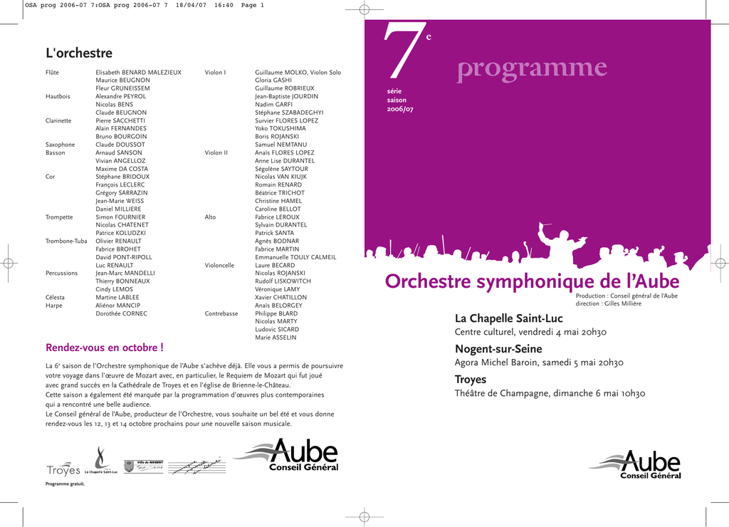 OSA prog 2006-07 7:OSA prog 2006-07 7 18/04/07 16:40 Page 1 7 e L'orchestre Flûte Hautbois Clarinette Saxophone Basson Cor Trompette Trombone-Tuba Percussions Célesta Harpe Elisabeth BENARD MALEZIEUX Maurice BEUGNON Fleur GRUNEISSEM Alexandre PEYROL Nicolas BENS Claude BEUGNON Pierre SACCHETTI Alain FERNANDES Bruno BOURGOIN Claude DOUSSOT Arnaud SANSON Vivian ANGELLOZ Maxime DA COSTA Stéphane BRIDOUX François LECLERC Grégory SARRAZIN Jean-Marie WEISS Daniel MILLIERE Simon FOURNIER Nicolas CHATENET Patrice KOLUDZKI Olivier RENAULT Fabrice BROHET David PONT-RIPOLL Luc RENAULT Jean-Marc MANDELLI Thierry BONNEAUX Cindy LEMOS Martine LABLEE Aliénor MANCIP Dorothée CORNEC Violon I Violon II Alto Violoncelle Contrebasse Guillaume MOLKO, Violon Solo Gloria GASHI Guillaume ROBRIEUX Jean-Baptiste JOURDIN Nadim GARFI Stéphane SZABADEGHYI Survier FLORES LOPEZ Yoko TOKUSHIMA Boris ROJANSKI Samuel NEMTANU Anaïs FLORES LOPEZ Anne Lise DURANTEL Ségolène SAYTOUR Nicolas VAN KIUJK Romain RENARD Béatrice TRICHOT Christine HAMEL Caroline BELLOT Fabrice LEROUX Sylvain DURANTEL Patrick SANTA Agnès BODNAR Fabrice MARTIN Emmanuelle TOULY CALMEIL Laure BECARD Nicolas ROJANSKI Rudolf LISKOWITCH Véronique LAMY Xavier CHATILLON Anaïs BELORGEY Philippe BLARD Nicolas MARTY Ludovic SICARD Marie ASSELIN Rendez-vous en octobre ! La 6e saison de l’Orchestre symphonique de l’Aube s’achève déjà. Elle vous a permis de poursuivre votre voyage dans l’œuvre de Mozart avec, en particulier, le Requiem de Mozart qui fut joué avec grand succès en la Cathédrale de Troyes et en l’église de Brienne-le-Château. Cette saison a également été marquée par la programmation d’œuvres plus contemporaines qui a rencontré une belle audience. Le Conseil général de l’Aube, producteur de l’Orchestre, vous souhaite un bel été et vous donne rendez-vous les 12, 13 et 14 octobre prochains pour une nouvelle saison musicale. Programme gratuit. programme série saison 2006/07 Orchestre symphonique de l’Aube Production : Conseil général de l’Aube direction : Gilles Millière La Chapelle Saint-Luc Centre culturel, vendredi 4 mai 20h30 Nogent-sur-Seine Agora Michel Baroin, samedi 5 mai 20h30 Troyes Théâtre de Champagne, dimanche 6 mai 10h30 OSA prog 2006-07 7:OSA prog 2006-07 7 18/04/07 16:40 Page 2 Serge Prokofiev Pascal Zavaro Hugo Alfven Jacques Ibert (Ukraine, 1891-1953) (France, 1959) (Suède, 1872-1960) (France, 1890-1962) Lieutenant Kijé Flashes Rhapsodie suédoise n°1 Escales op 60 (1934) (1999) op.19 (1903) (1920-22) Au début des années 30, Prokofiev éprouve le désir de retrouver sa terre natale. A cette époque, il reçoit une commande soviétique : une musique pour l’adaptation cinématographique de la nouvelle de Tynianov, Lieutenant Kijé. Après des études au Conservatoire national supérieur de musique de Paris, Pascal Zavaro acquiert une large expérience au sein des grands orchestres parisiens. Virtuose du marimba, improvisateur et transcripteur, il interprète de nombreuses pièces solistes à travers le monde. A la fin des années 80, il se consacre entièrement à la composition. Dès ses premières pièces, il impose un style personnel, gouverné par une puissante pensée rythmique. Pascal Zavaro puise aussi bien dans la musique «pop» que dans la musique traditionnelle de lointaines contrées. Hugo Alfven jouit d’une grande popularité à son époque. En effet, plus que tout autre compositeur, il représente l’état d’esprit suédois. Originaire de Stockholm, il passe de nombreuses années en Dalécarlie, province où la tradition de la musique populaire authentique est la plus forte. Après des études au conservatoire de Paris, il obtient, en 1919, le Grand Prix de Rome. C’est d’Italie qu’il rapporte l’œuvre qui fera sa réputation : Escales. Il devient alors vite l’un des compositeurs en vue de la jeune génération française de l’entre deux guerres, apprécié pour sa sensibilité, sa fantaisie et son humour. Jacques Ibert sera directeur de la célèbre Villa Médicis à Rome à partir de 1938. Son œuvre est d’une grande diversité avec 7 ouvrages lyriques, 7 ballets, une soixantaine de musiques de films, des pièces pour piano, plusieurs pièces d’orchestre ainsi que des concertos. L’argument est le suivant : l’action se situe au temps de l’empereur Paul 1er. Une erreur de transcription d’un document militaire fait apparaître le nom d’un lieutenant qui n’existe pas. Nul n’ose l’avouer au Tsar. Il en résulte un personnage fantôme que l’on fait apparaître dans diverses circonstances. Lorsque le Tsar veut rencontrer ce soldat exemplaire, on lui annonce sa mort et on organise des obsèques officielles. Le film ne fut jamais réalisé mais Prokofiev, conscient de la valeur de la musique, en fit une suite symphonique composée de 5 parties : 1. Naissance de Kijé : Ambiance de caserne. Apparition du leitmotiv de Kijé (Thème russe) 2. Romance : Sur la célèbre romance sentimentale : La colombe grise gémit. 3. Le mariage de Kijé 4.Troïka : Chanson de hussard. 5. L’enterrement de Kijé : Rappel de tous les thèmes entendus. Flashes qui est interprété aujourd’hui est une commande de Radio France pour son orchestre philharmonique. Pascal Zavaro résume ainsi son œuvre : « Vivant dans l’ombre des buildings, au milieu des foules et du flot des voitures, c’est entre les murs de la ville que je me sens chez moi. Flashes, en cinq miniatures est dédiée à quelques lieux favoris : Tokyo, Le Caire, Paris, Varsovie, New-York. A l’orchestre, j’ai ajouté un synthétiseur qui, en doublant certains instruments, apporte une sonorité équivoque ou hétérogène. Ces couleurs, greffées sur l’univers traditionnel de l’orchestre, sont pour moi un équivalent métaphorique du mélange des styles architecturaux, des stratifications historiques, de la promiscuité des classes ou des ethnies, de la magnifique impureté 
