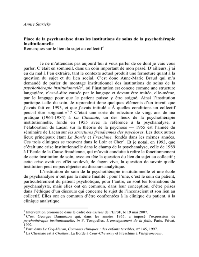 Annie Staricky Place de la psychanalyse dans les institutions de soins de la psychothérapie institutionnelle Remarques sur le lien du sujet au collectif 1 Je ne m’attendais pas aujourd’hui à vous parler de ce dont je vais vous parler. C’était en sommeil, dans un coin important de mon passé. D’ailleurs, j’ai eu du mal à l’en extraire, tant le contexte actuel produit une fermeture quant à la question du sujet et du lien social. C’est donc Anne-Marie Braud qui m’a demandé de parler du montage institutionnel des institutions de soins de la psychothérapie institutionnelle2, où l’institution est conçue comme une structure langagière, c’est-à-dire causée par le langage et devant être traitée, elle-même, par le langage pour que le patient puisse y être soigné. Ainsi l’institution participe-t-elle du soin. Je reprendrai donc quelques éléments d’un travail que j’avais fait en 1993, et que j’avais intitulé « À quelles conditions un collectif peut-il être soignant » 3 ? C’était une sorte de relecture de vingt ans de ma pratique (1964-1984) à La Chesnaie, un des lieux de la psychothérapie institutionnelle, fondé en 1955 avec la référence à la psychanalyse, à l’élaboration de Lacan sur la théorie de la psychose — 1955 est l’année du séminaire de Lacan sur les structures freudiennes des psychoses. Les deux autres lieux principaux étant La Borde et Freschine, fondés dans les mêmes années. Ces trois cliniques se trouvent dans le Loir et Cher 4. Et je notai, en 1993, que c’était une crise institutionnelle dans le champ de la psychanalyse, celle de 1989 à l’Ecole de la Cause freudienne, qui m’avait conduite à relire le fonctionnement de cette institution de soin, avec en tête la question du lien du sujet au collectif ; cette crise avait en effet soulevé, de façon vive, la question de savoir quelle institution peut ne pas objecter au discours analytique. L’institution de soin de la psychothérapie institutionnelle et une école de psychanalyse n’ont pas la même finalité : pour l’une, c’est le soin du patient, particulièrement du patient psychotique, pour l’autre, ce sont les formations du psychanalyste, mais elles ont en commun, dans leur conception, d’être prises dans l’éthique d’un discours qui concerne le sujet de l’inconscient et son lien au collectif. Elles ont en commun d’être confrontées à la clinique du patient, à la clinique analytique. 1 Intervention prononcée dans le cadre des assises de l’EPSF, le 19 mai 2007. C’est Georges Daumézon qui, dans les années 1955, a imposé l’expression de psychothérapie institutionnelle, in F. Tosquelles, L’enseignement de la folie, Paris, Privat, 1992. 3 Paru dans Le Coq-Héron, Courants cliniques : des enfants terribles, n° 145, 1997. 4 La Chesnaie est à Chailles, La Borde à Cour-Cheverny et Freschine à Villefrancoeur. 2 Concernant la formation, j’ai souvent discuté avec Annie Tardits, à qui d’ailleurs je demanderai de développer ce moment de l’histoire qu’elle connaît bien, concernant les échanges entre la pédagogie institutionnelle et la psychothérapie institutionnelle — échanges qui ont eu lieu par l’intermédiaire des frères Fernand et Jean Oury. Personnellement, je ne dirais pas qu’il y avait une visée de formation du personnel dans le lieu du soin lui-même, mais que cette formation était assurée par une association loi 1901, articulée à la clinique, et portant d’ailleurs le nom d’école 5, qui offrait des enseignements théoriques et cliniques au personnel soignant. À La Borde aussi, Jean Oury assurait un séminaire hebdomadaire de psychanalyse portant sur les concepts et sur la clinique. De plus la majorité de ce personnel était en formation analytique. Quant à l’apport de la pédagogie institutionnelle sur le lieu de soin, les méthodes Freinet ont en effet servi aux activités dites ergothérapiques proposées aux patients. Le collectif soignant Les institutions de psychothérapie institutionnelle s’originent de l’expérience de l’hôpital psychiatrique de Saint-Alban en Lozère pendant la guerre, où les patients fûrent confrontés au travail pour leur survie. Ils furent impliqués, entre autres et pas sans risques, dans le ravitaillement de l’hôpital. Ces activités de pleine responsabilité étaient inscrites dans une dimension politique et historique : Saint-Alban fut un des lieux de la Résistance. Tosquelles lui-même, catalan et réfugié républicain chassé par les franquistes, en 19381939, à la fin de la guerre civile espagnole, connut une expérience concentrationnaire au camp de Rivesaltes : sans doute n’est-elle pas étrangère à la réflexion qui le conduit à rompre avec l’aspect asilaire de l’hôpital psychiatrique et à repenser des structures qui favorisent le lien social. Saint-Alban fut aussi un lieu d’effervescence théorique, « le creuset de Saint-Alban », avec Tosquelles 6 donc, Bonnafé, qui eut là-bas l’idée du secteur, Ajuriaguerra, Minkovski, Follin, Oury et d’autres encore. La thèse de Lacan de 1932 sur la psychose paranoïaque7 y était une référence et elle fut l’objet d’une activité pour les malades, qui la relièrent… Ainsi, marquées par ces références, les cliniques de 1955 rompent-elles avec la tradition asilaire, par la conception d’un collectif soignant où le patient n’est plus seulement assisté dans le temps du soin mais aussi impliqué comme responsable dans le fonctionnement même de l’institution. Il est invité à occuper sa place dans le lien social de l’institution. L’institution rompt aussi avec le 5 EPIC, École de psychothérapie institutionnelle de La Chesnaie. Cf la thèse de F. Tosquelles, Le vécu de la fin du monde dans la folie, 1947, Arefppi, 1986. 7 J. Lacan, De la psychose paranoïaque dans ses rapports avec la personnalité, 1932, Paris, Seuil, 1980. 6 monde, clos jusqu’alors,